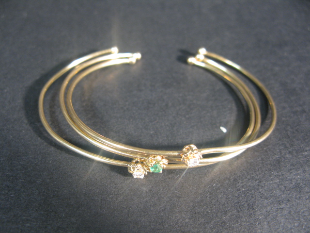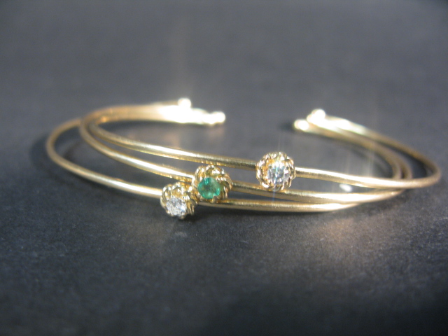 Three 14K stackable gold bracelets, two set with diamonds, one set with an emerald.