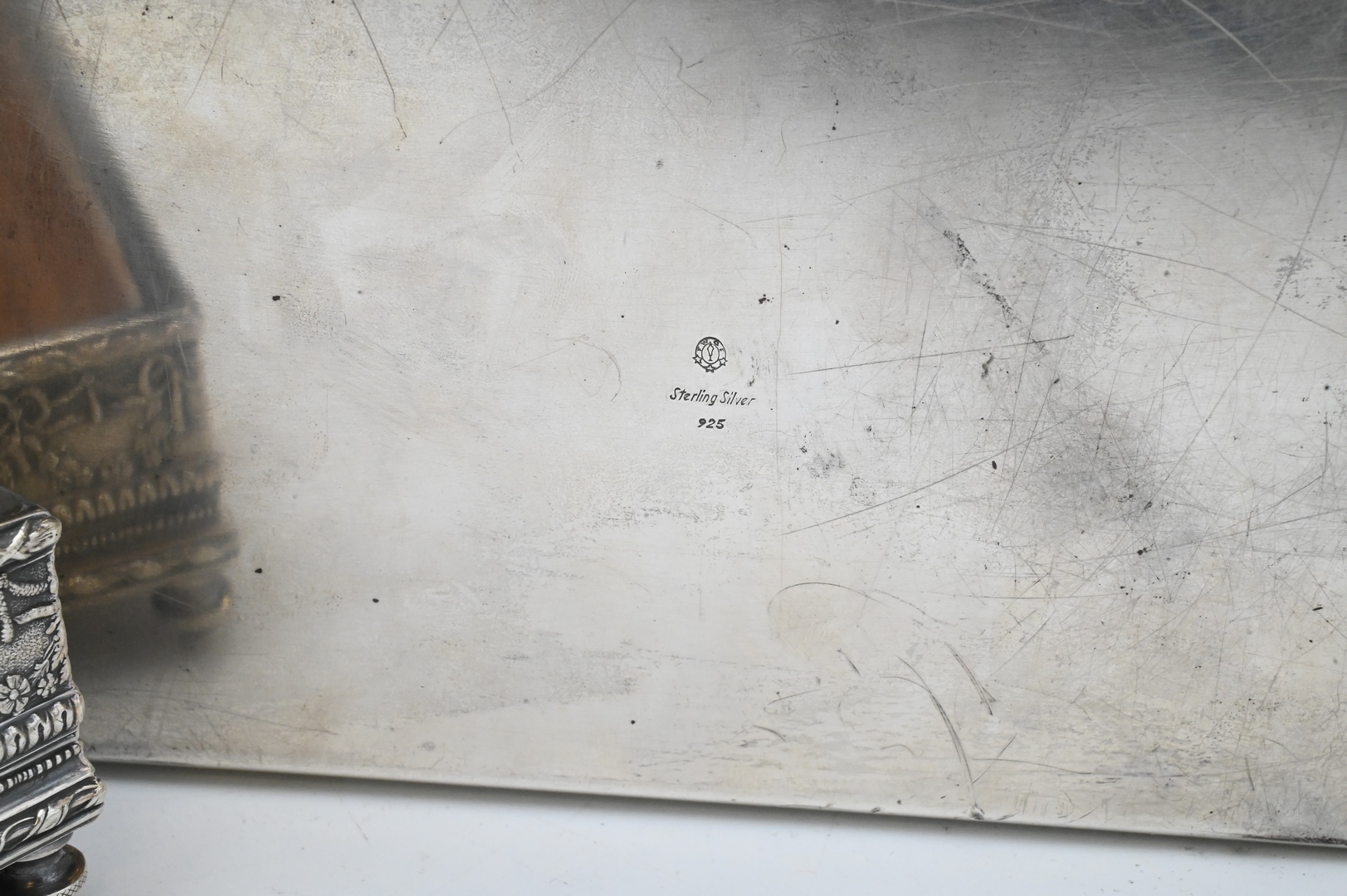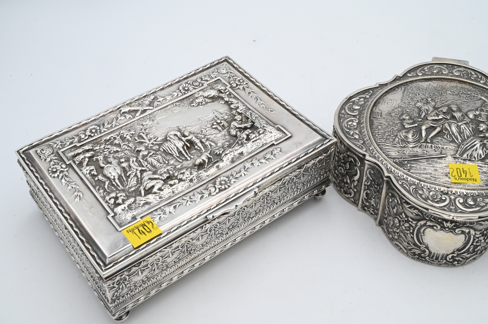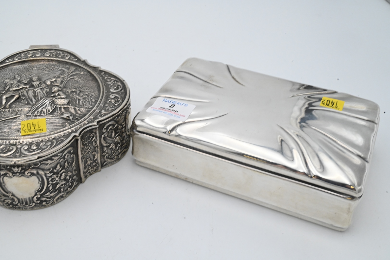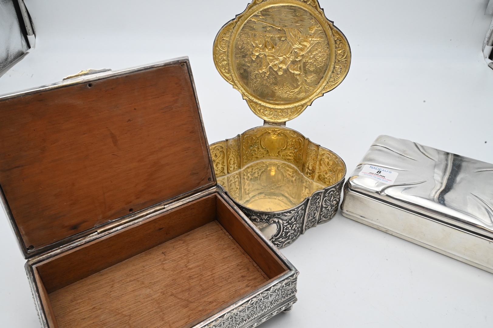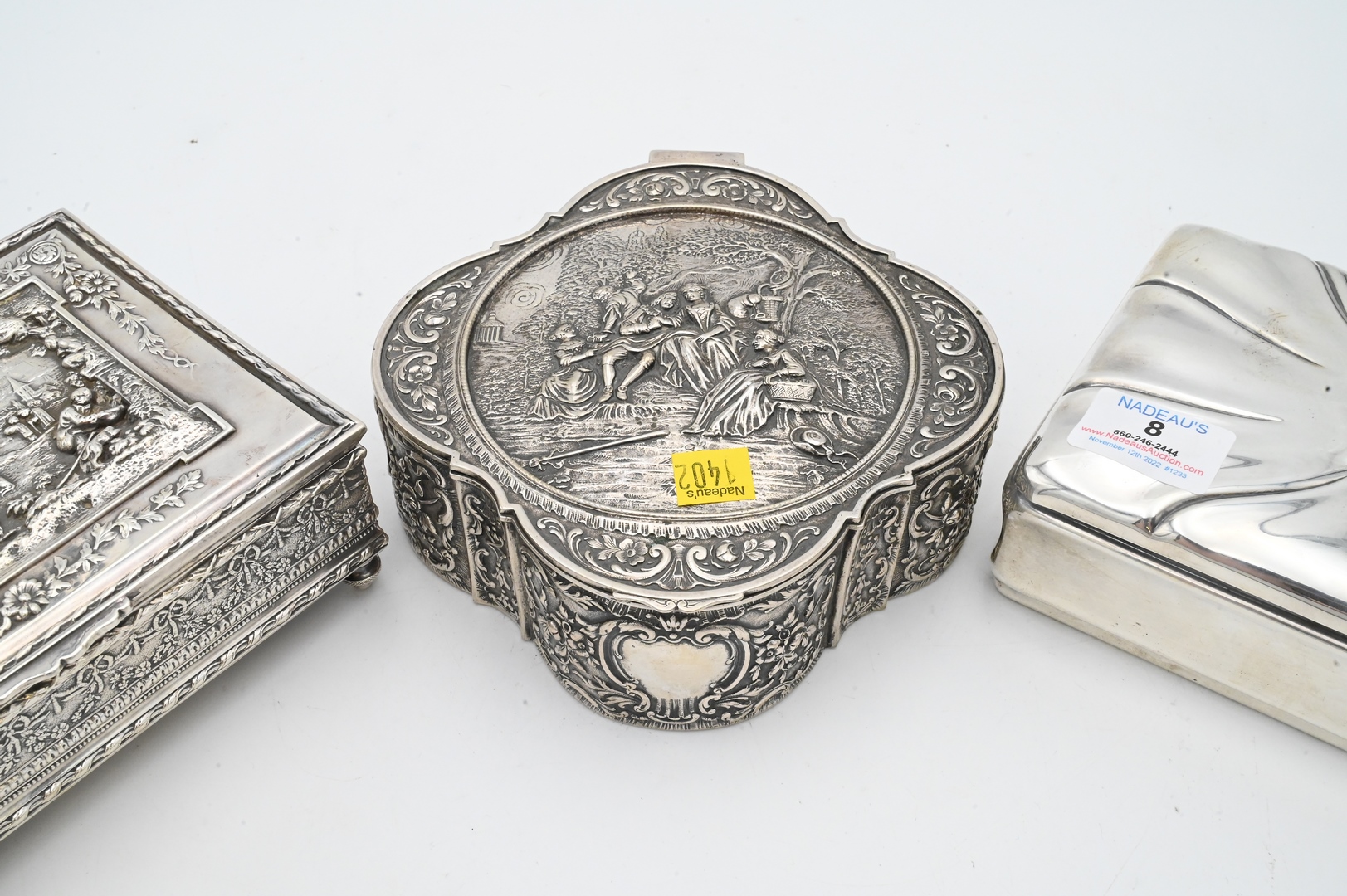 Three Boxes, two being silver, to include a deco style marked sterling silver, along with two having embossed landscape scenes, largest 5 1/4″ x 7 1/2″.
