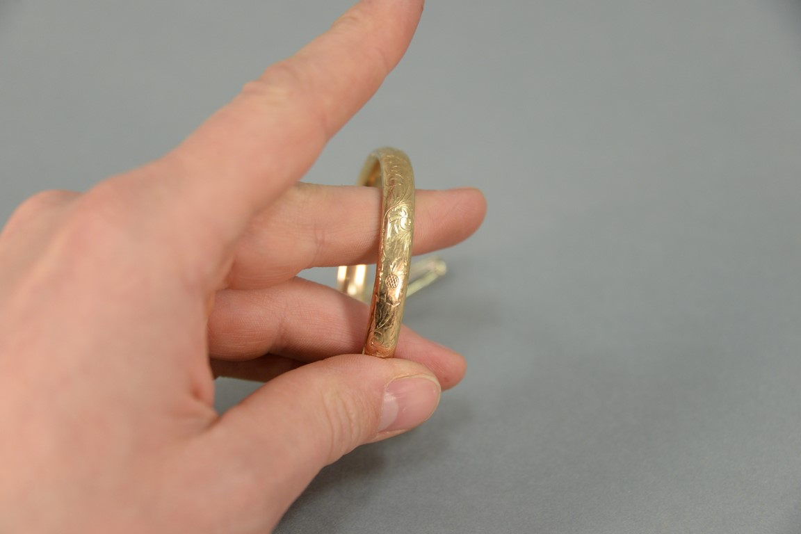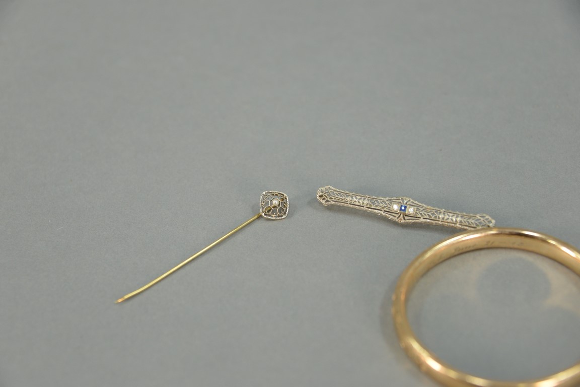 Lot 8: Three piece lot to include 18K bangle bracelet, 14K bar pin with blue sapphire and two diamonds, and a 14K stickpin. total weight 19…