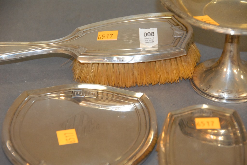 Tray lot of weighted sterling silver, five pieces dresser set and compote.