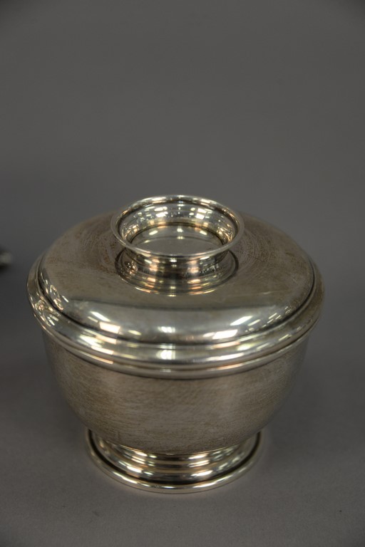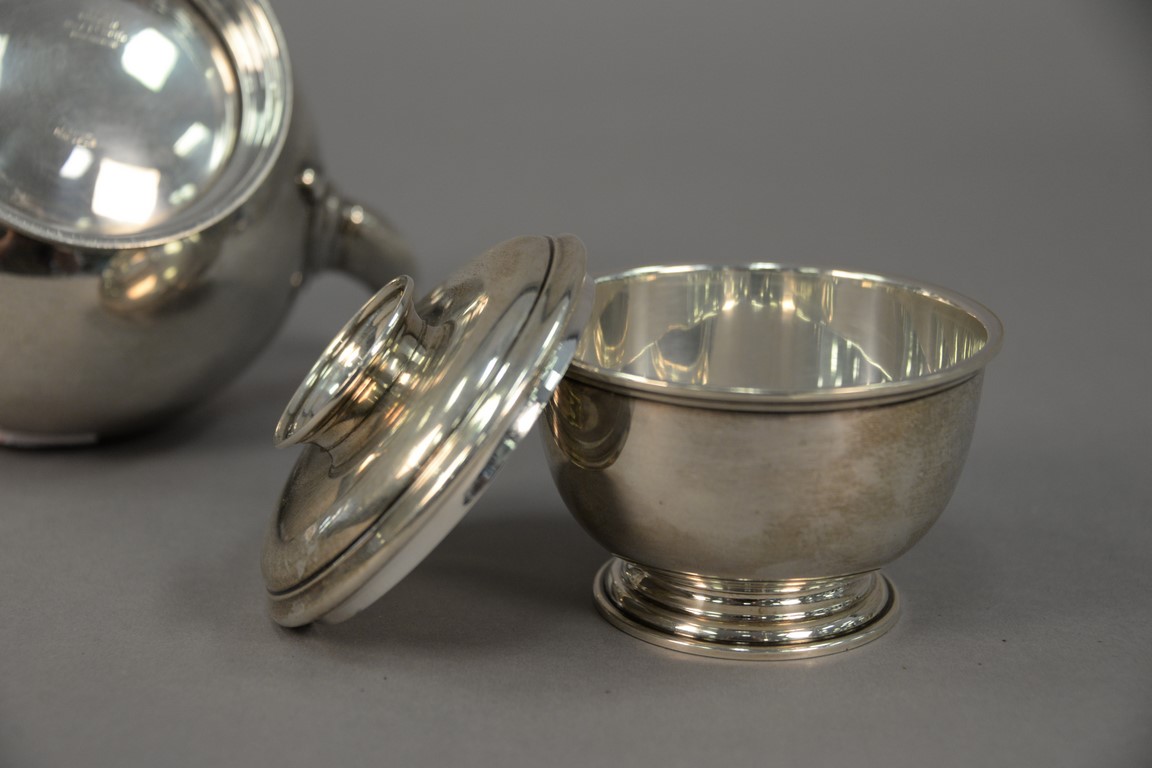 Lot 8: Two piece sterling silver partial tea set to include a tea pot and covered sugar, both marked E.T. St. John Hartford, Reproduction c…