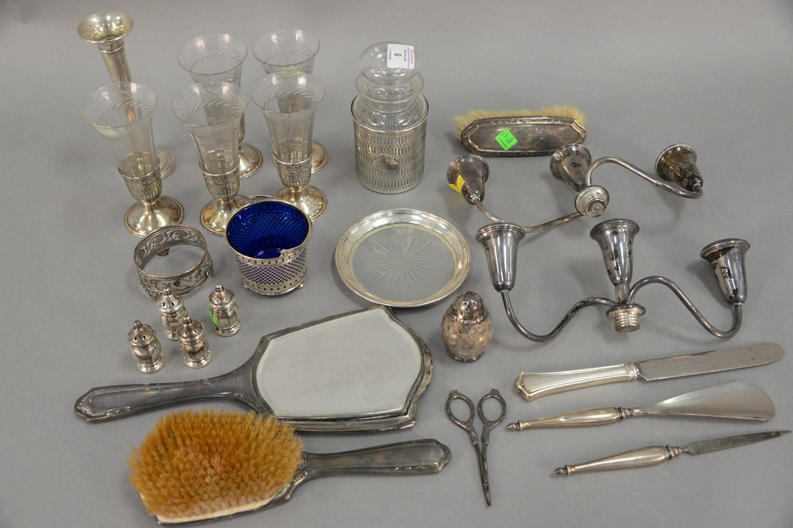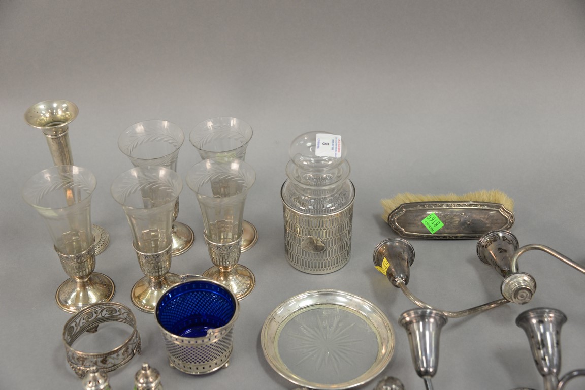 Lot 8: Two tray lots of silver, mostly weighted pieces plus jar, crystal, and cobalt basket. 8.16 weighable t oz.