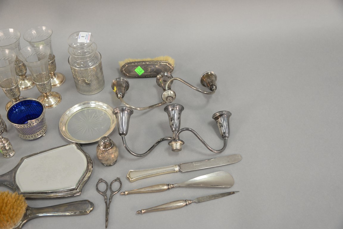 Two tray lots of silver, mostly weighted pieces plus jar, crystal, and cobalt basket. 8.16 weighable t oz.