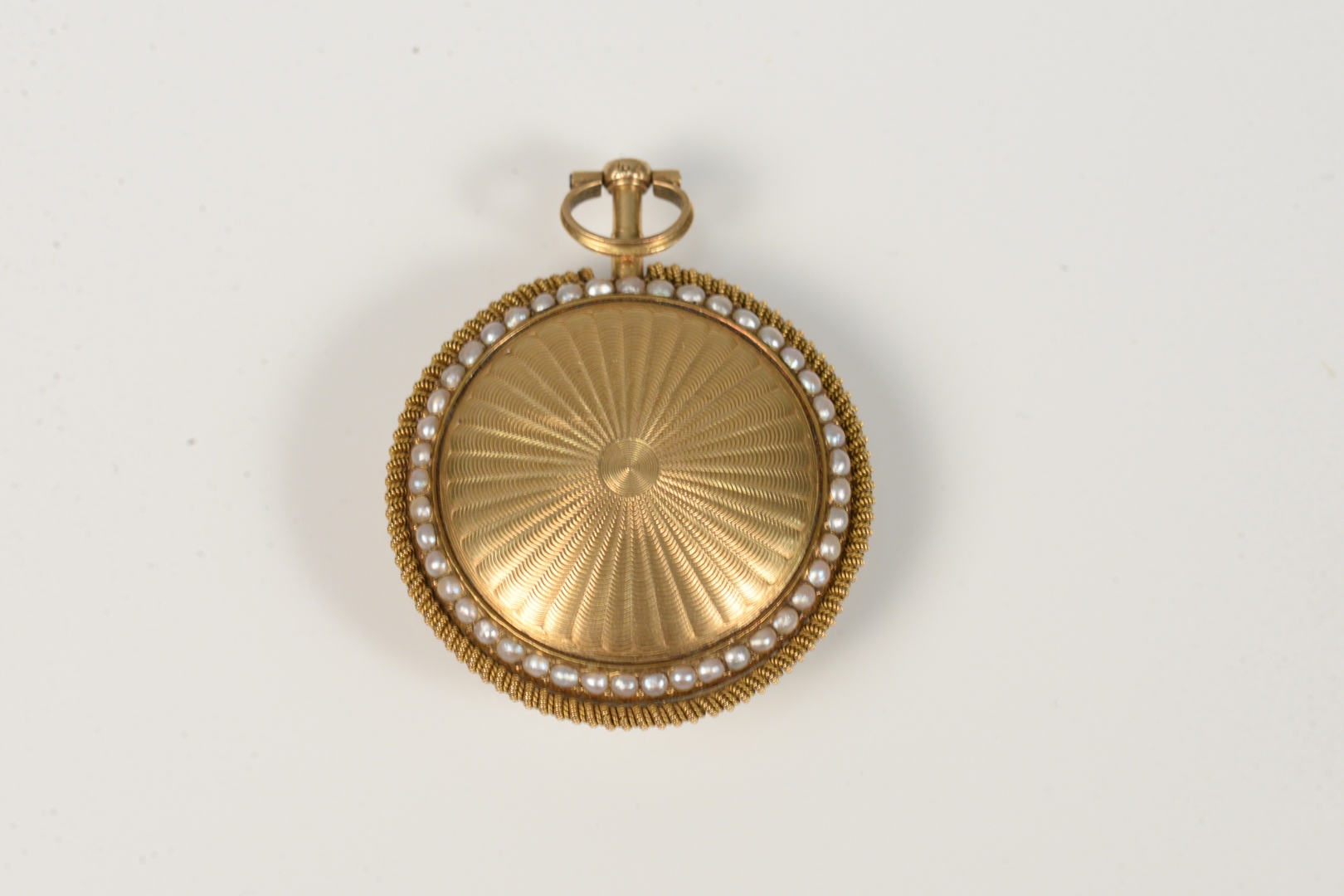 key wind with enameled dial with pearl surround, back also with pearl surround