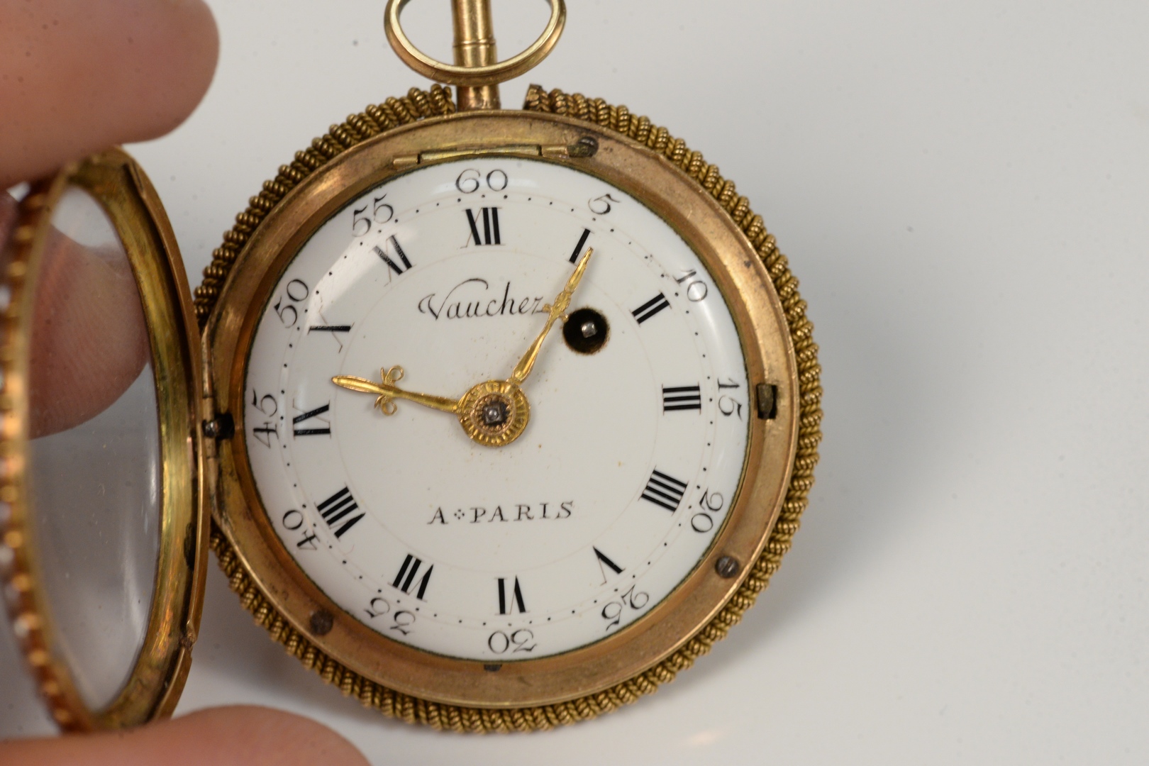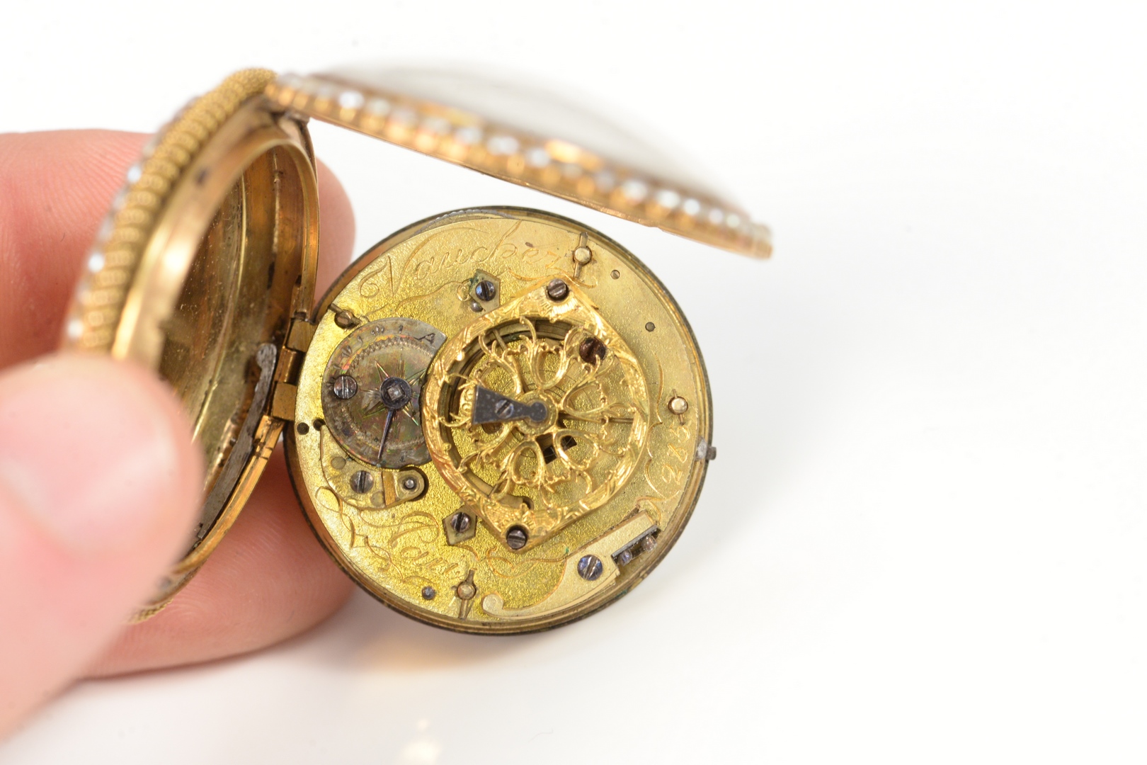 Lot 8: Vaucher Gold Lapel Watch key wind with enameled dial with pearl surround, back also with pearl surround signed Vaucher, Paris on dia…
