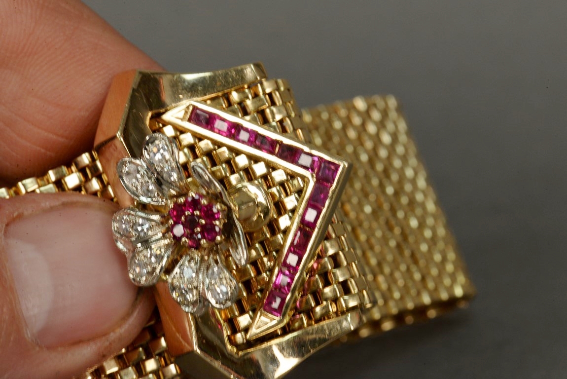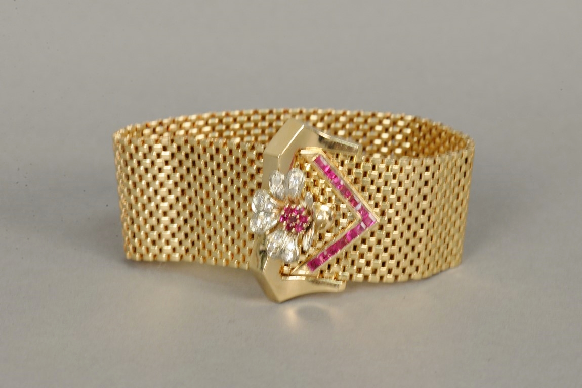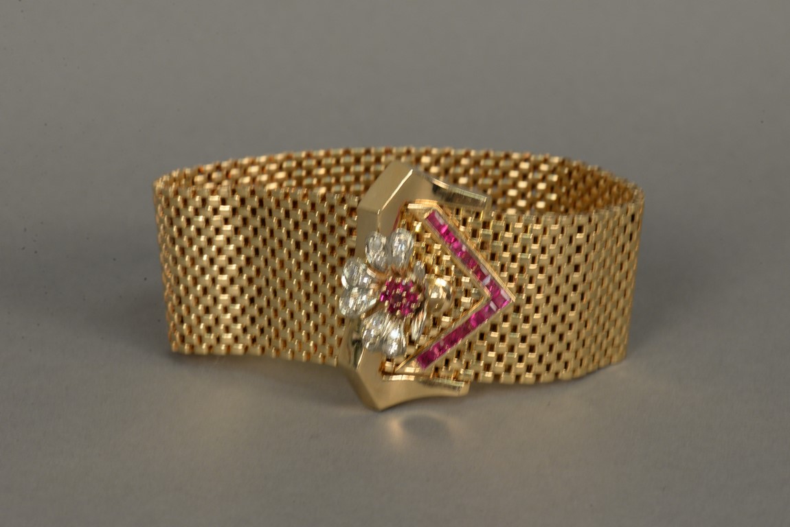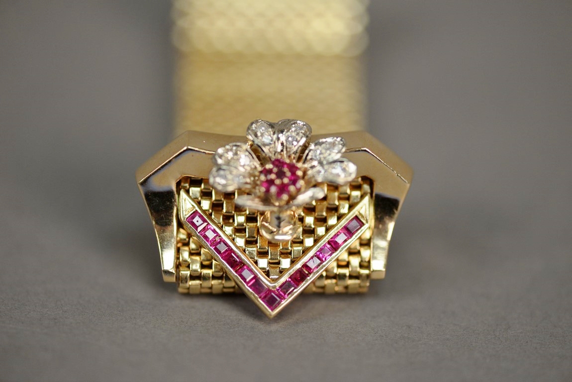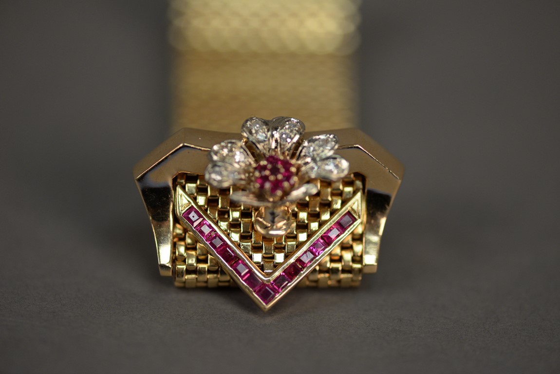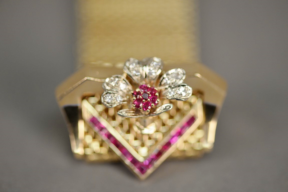 Wide brick link style ruby and diamond bracelet in 14K tested yellow gold with a buckle style clasp. The bracelet contains one chevron shaped section of thirteen channel set calibre cut rubies on one end and a flower consisting of seven prong set round faceted rubies and twelve bead set single cut round diamonds on the other end one diamond chipped. The bracelet measures approximately 9 in length, 1 in width and weighs 76.2 grams, including the stones. Total estimated ruby weight – 2.76 carats, total estimated diamond weight – 0.33 carats, color H, clarity SI2-I1.