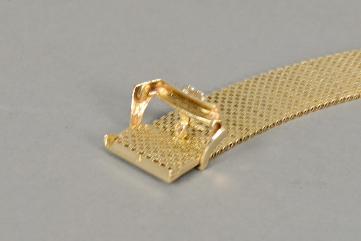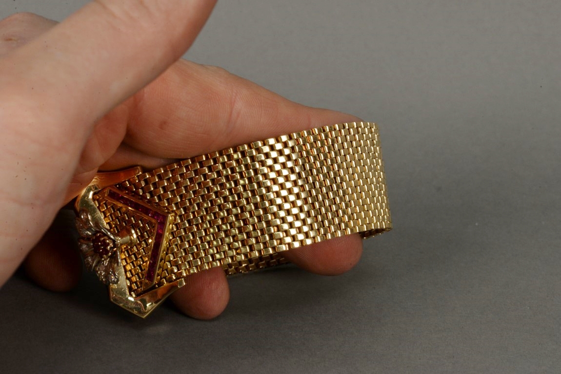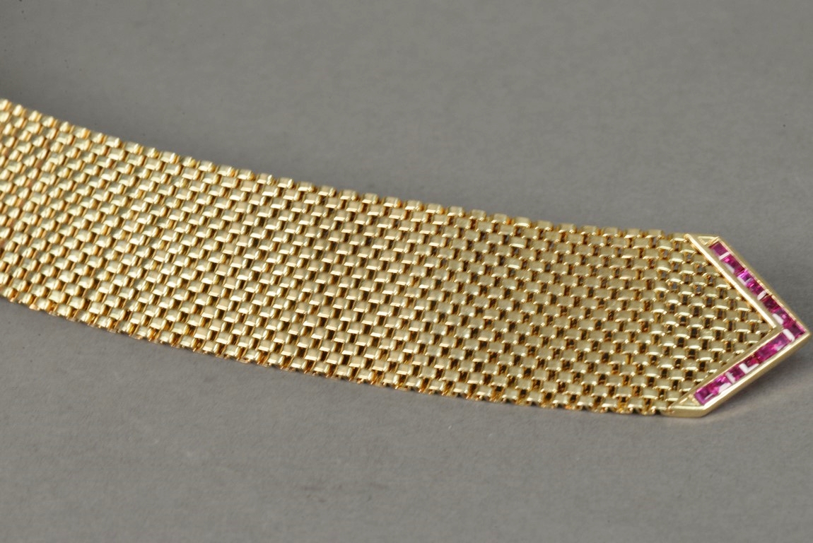 Lot 8: Wide brick link style ruby and diamond bracelet in 14K tested yellow gold with a buckle style clasp. The bracelet contains one che…