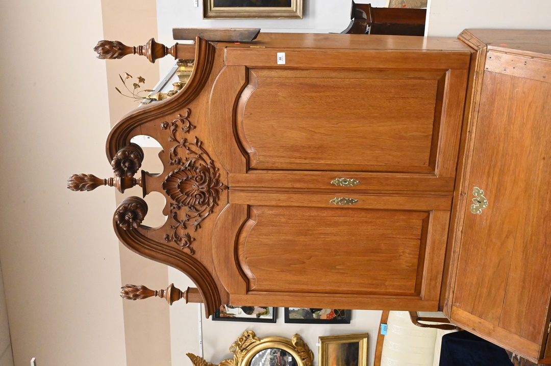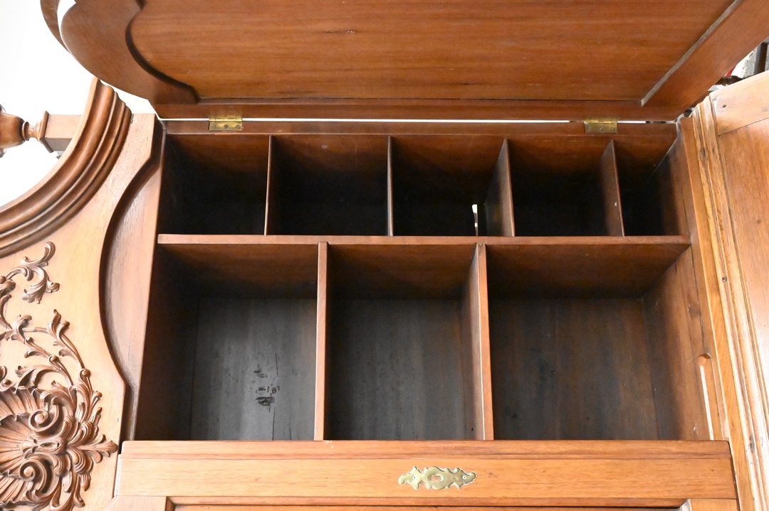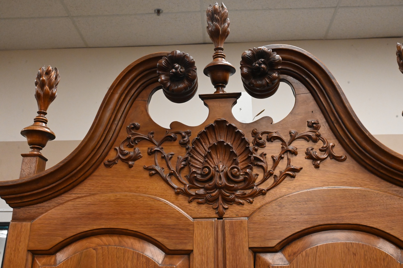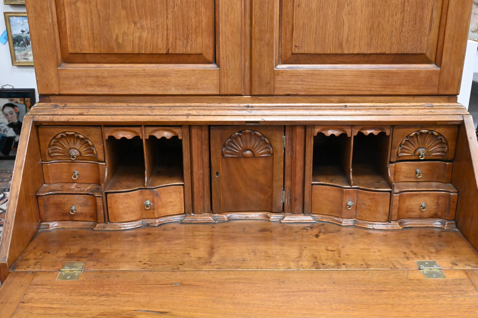 Chippendale Walnut Secretary/Bookcase, in two parts, upper section with carved rosettes, three carved finials and shell over two doors, on lower section with slant lid opening to reveal shell carved drawers, all over four drawers on ogee feet, height 94 1/2 inches, width 39 1/2 inches, Provenance: Estate of Peter Tillou, Litchfield, Connecticut