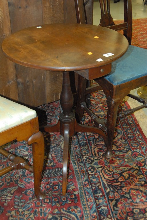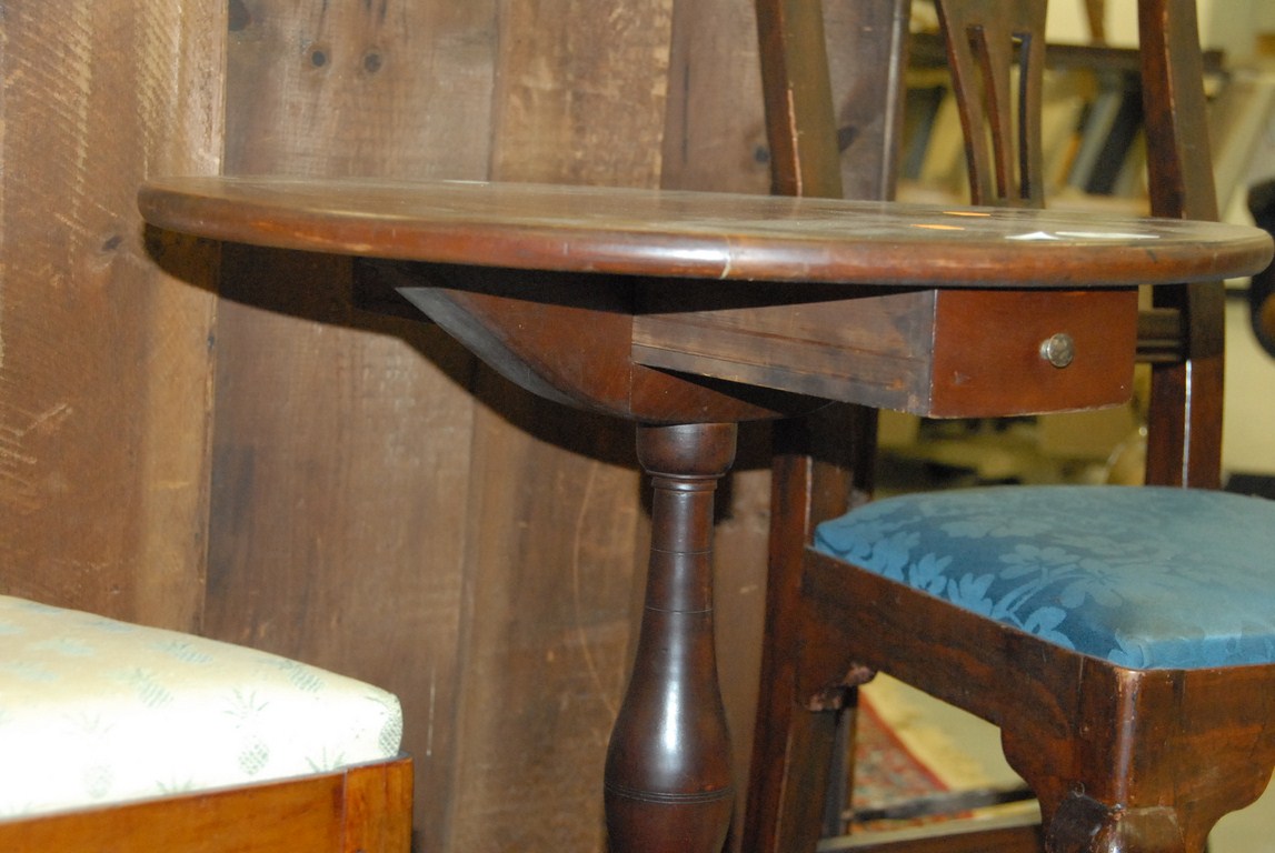 Connecticut cherry candlestand having circular top with candle drawer beneath, set on ring and bulbous turned shaft, three arch-carved legs restored. ht. 26in. dia. 21in.