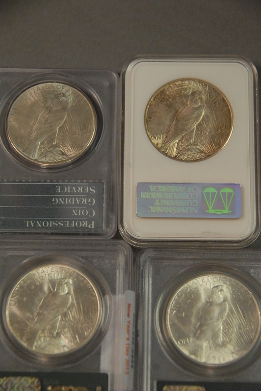 Four silver dollars 1934-D PCGS 63, 1935 PCGS 64, 1935 PCGS 63, and 1935 NGS 61.