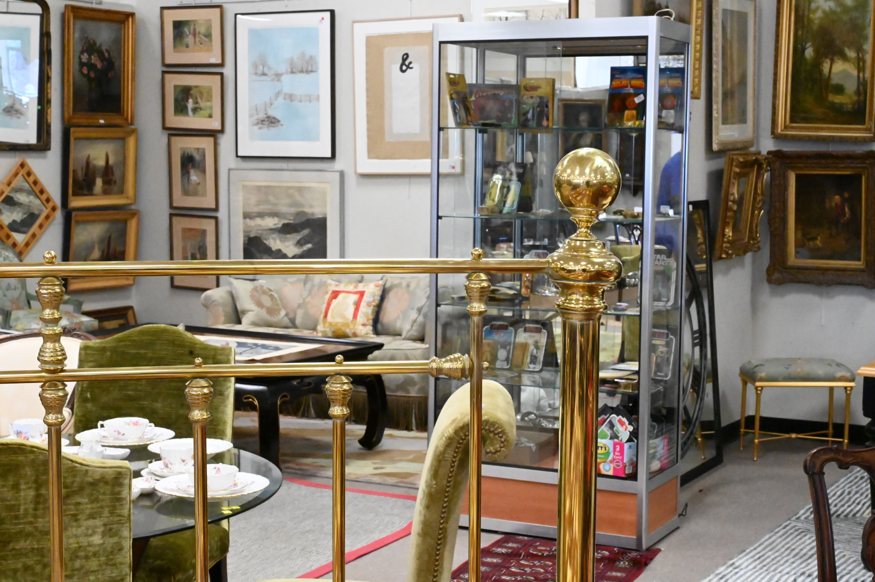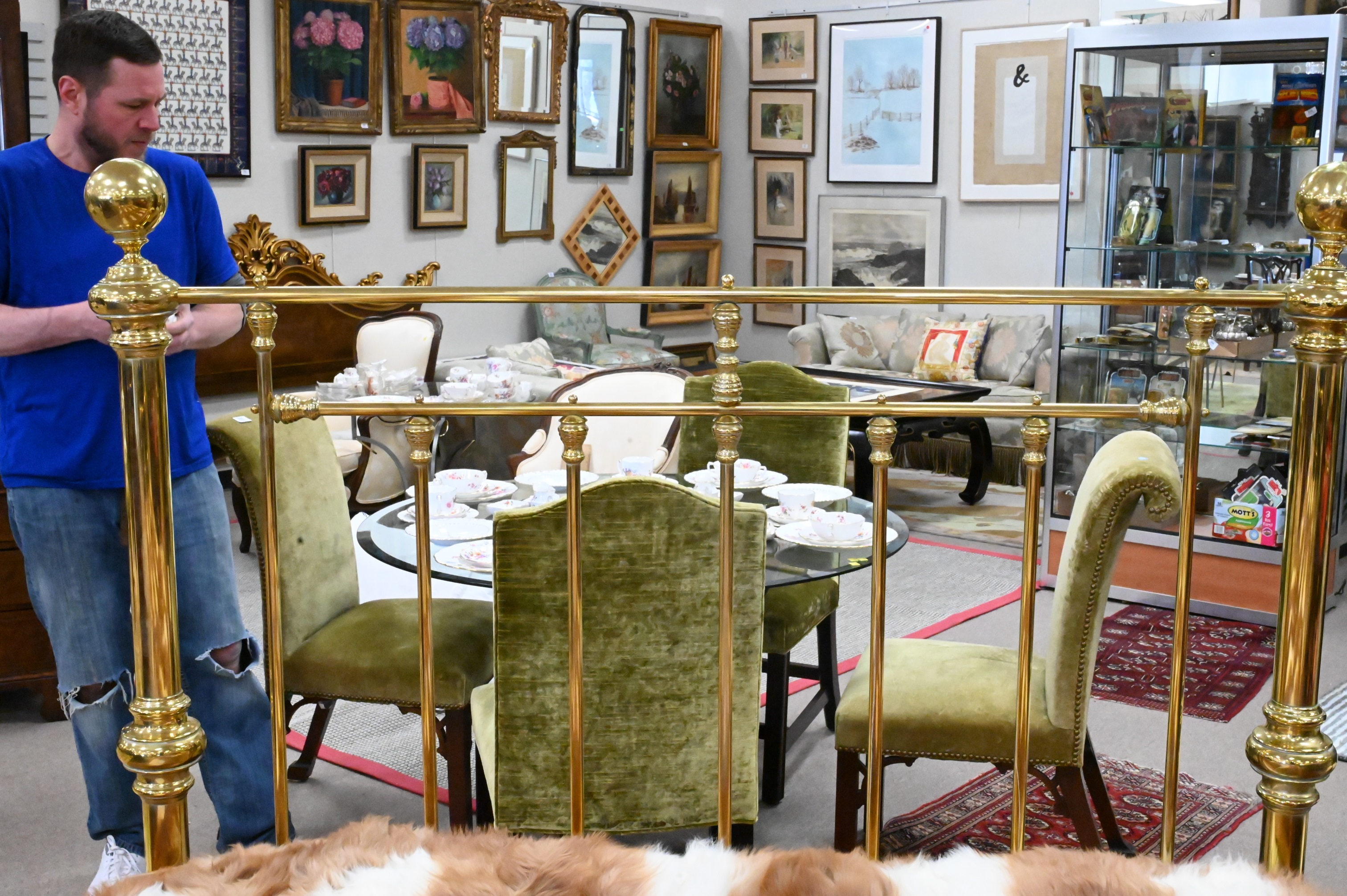 Full Size Brass Bed, complete with headboard, footboard, and rails, height 60 1/2 inches, width 55 inches.