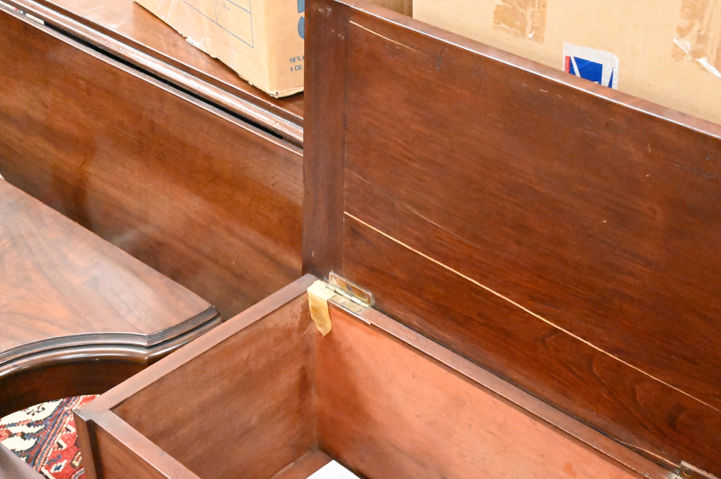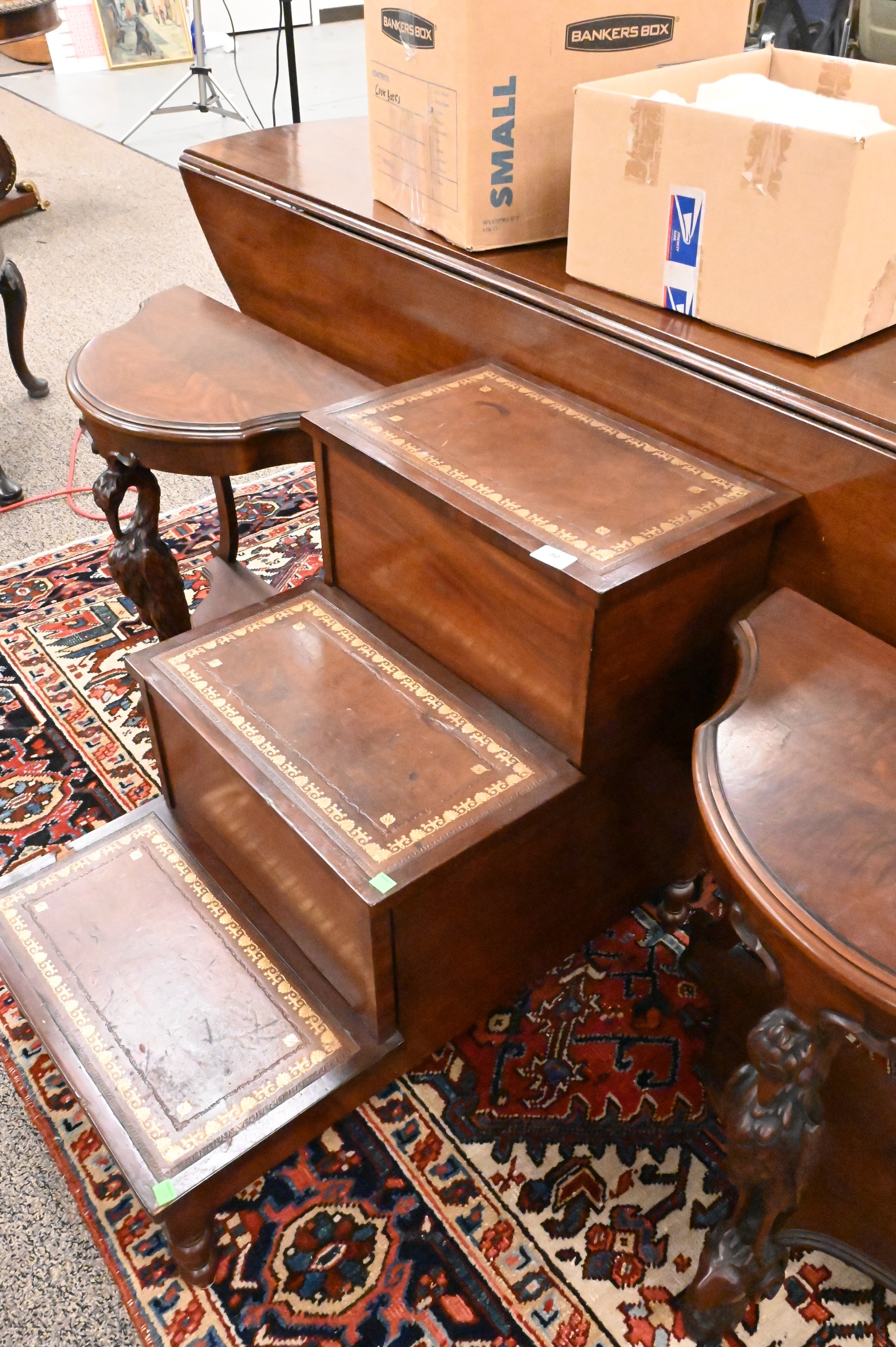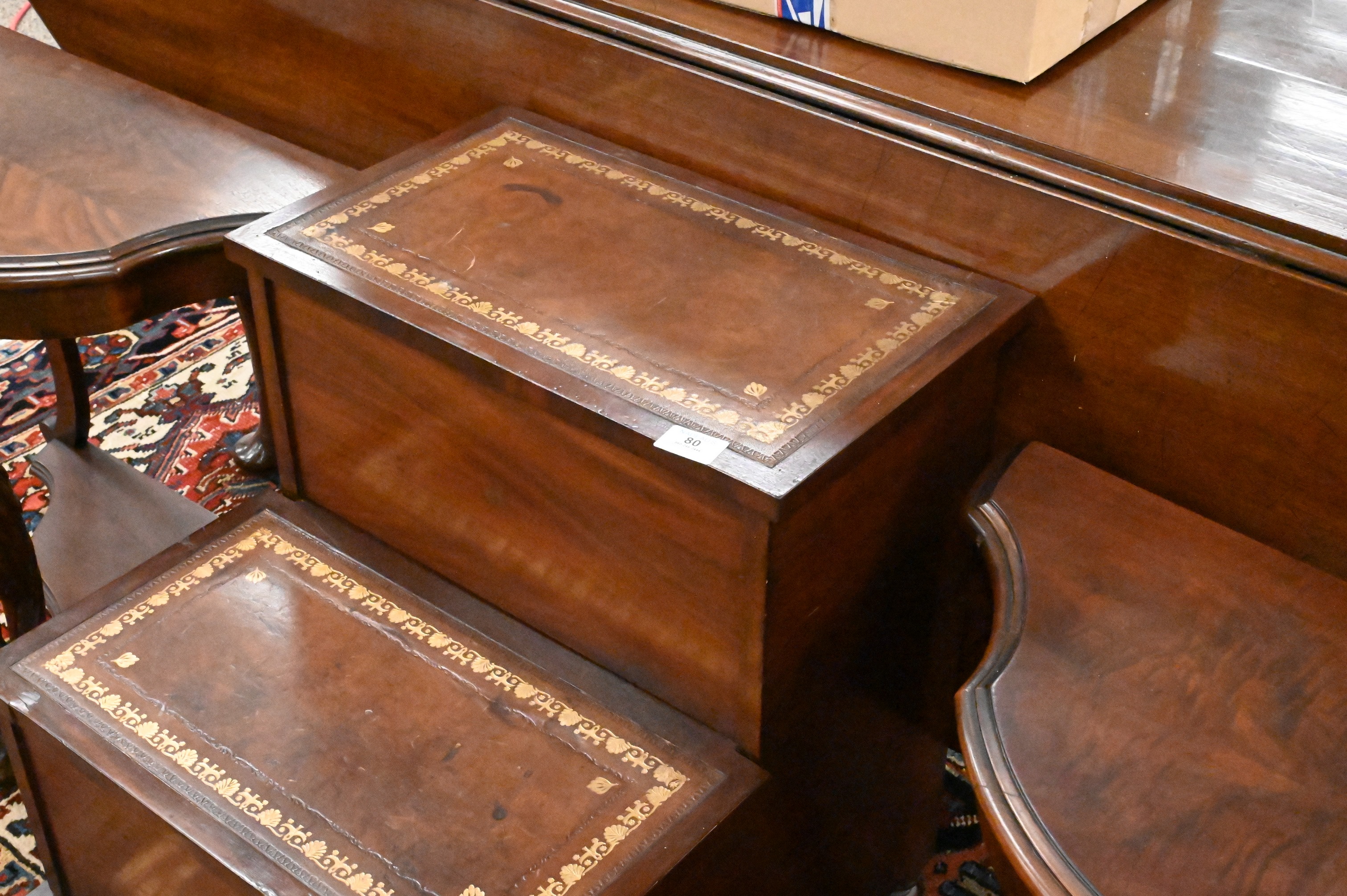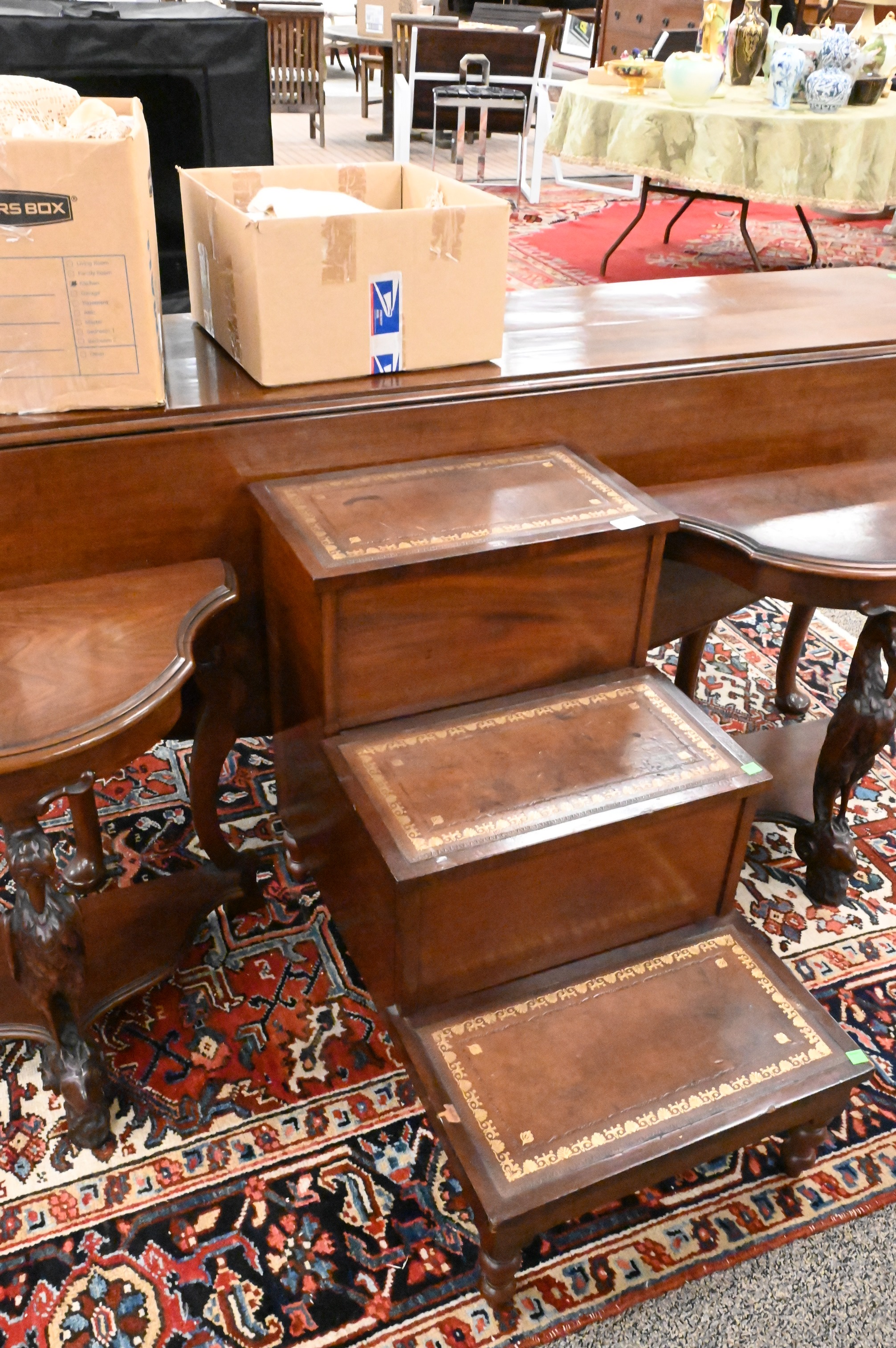 George III Mahogany Library Stairs, with tooled leather tops with lift top, middle with pull out and lift top, all on turned legs, height 26 inches, width 19 inches.