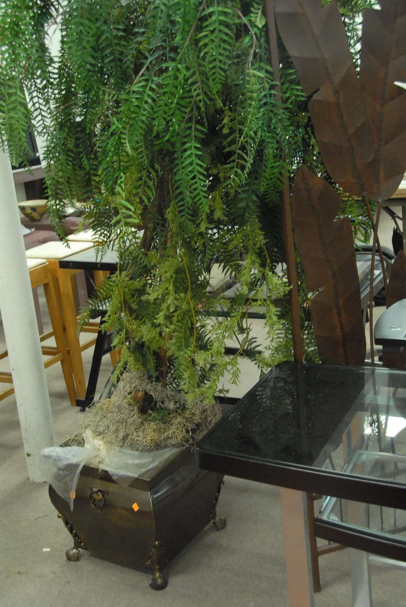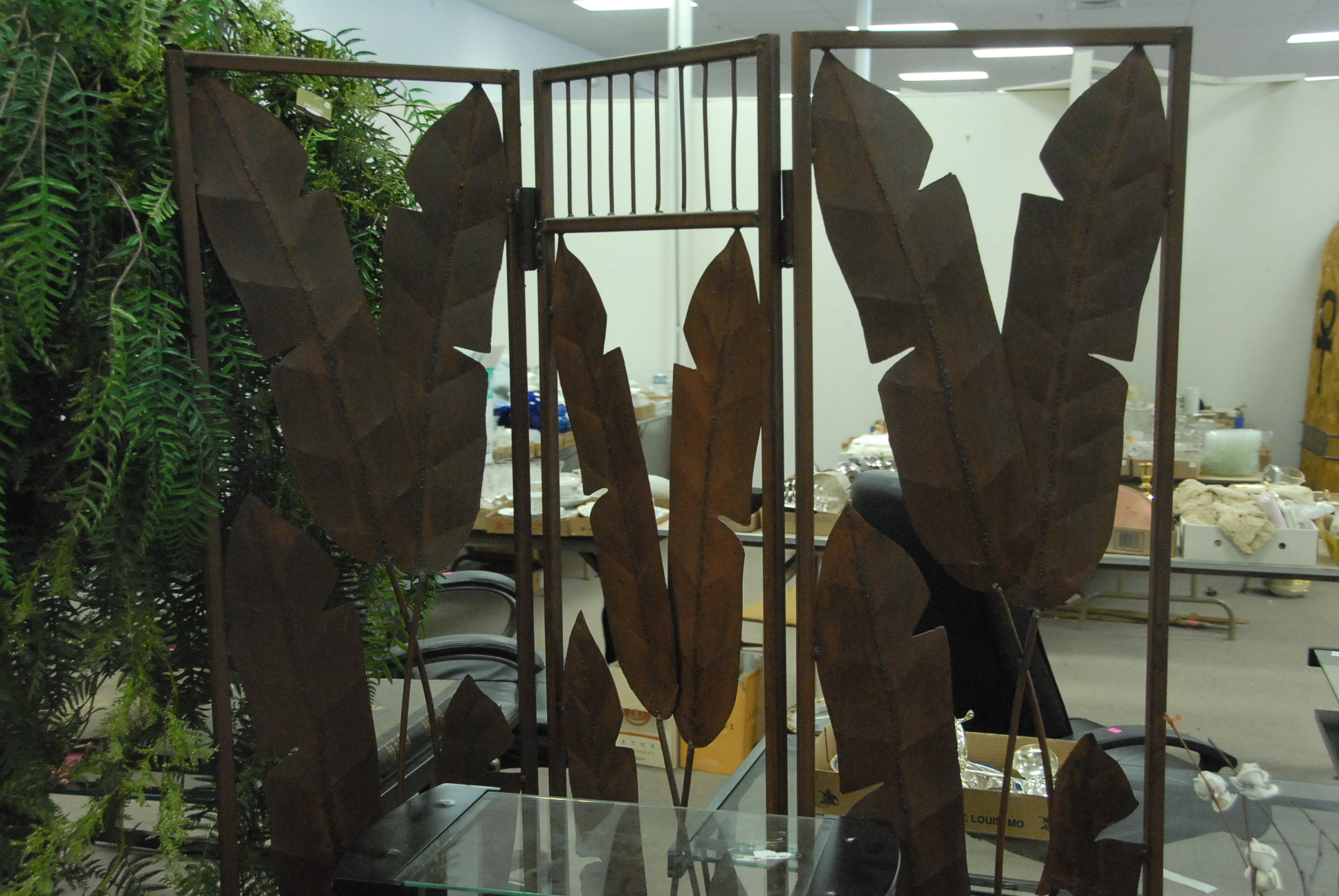 Group lot glass computer desk, metal three fold screen, two planters with artificial plants.