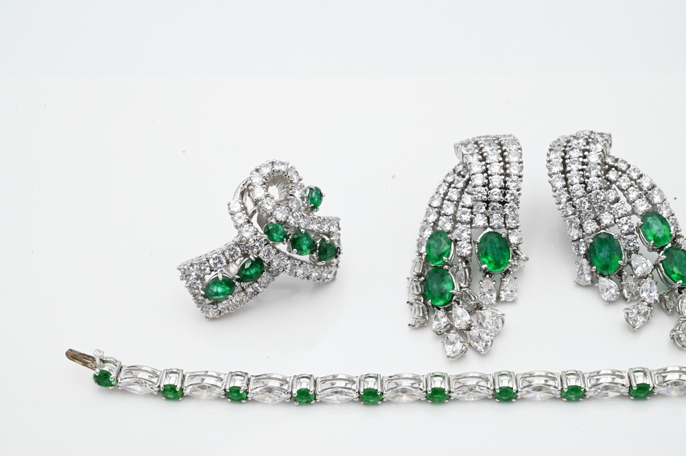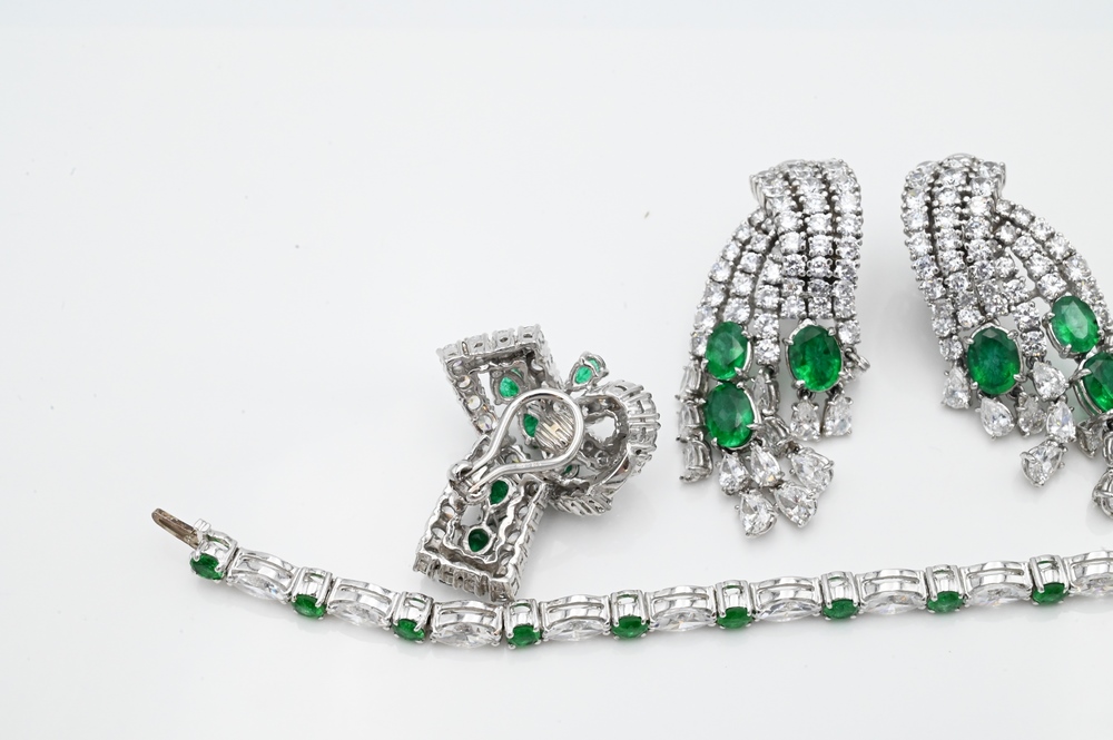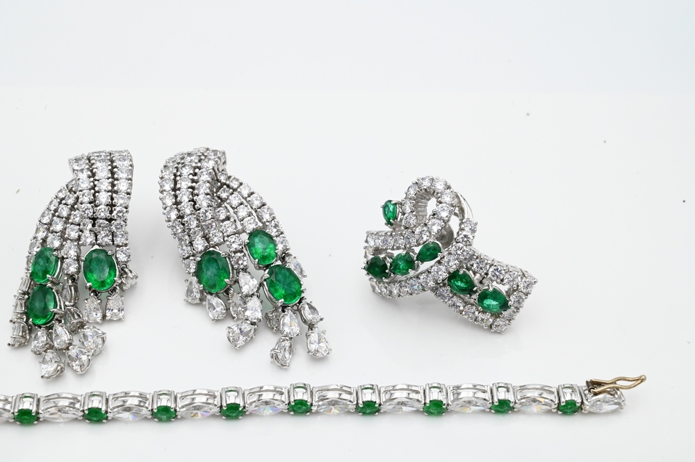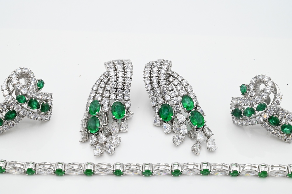 Group of Custom Sterling, Cubic Zirconia and Emerald Earrings; along with a matching bracelet.