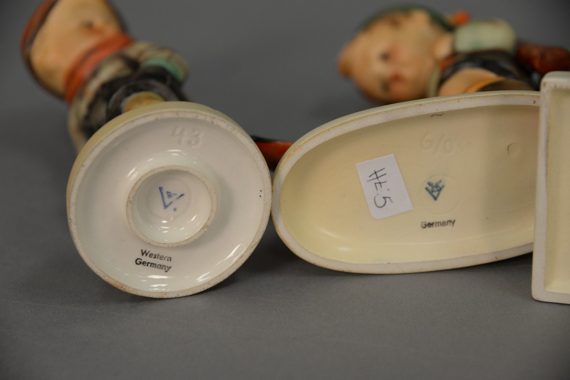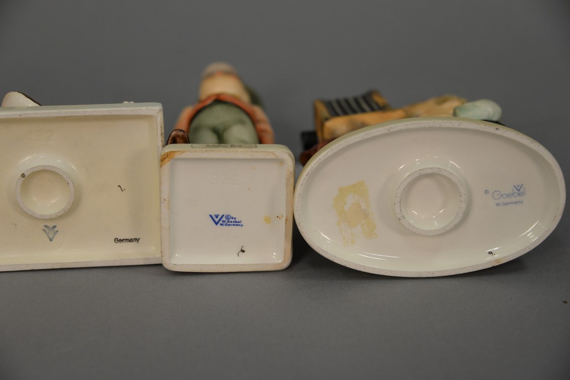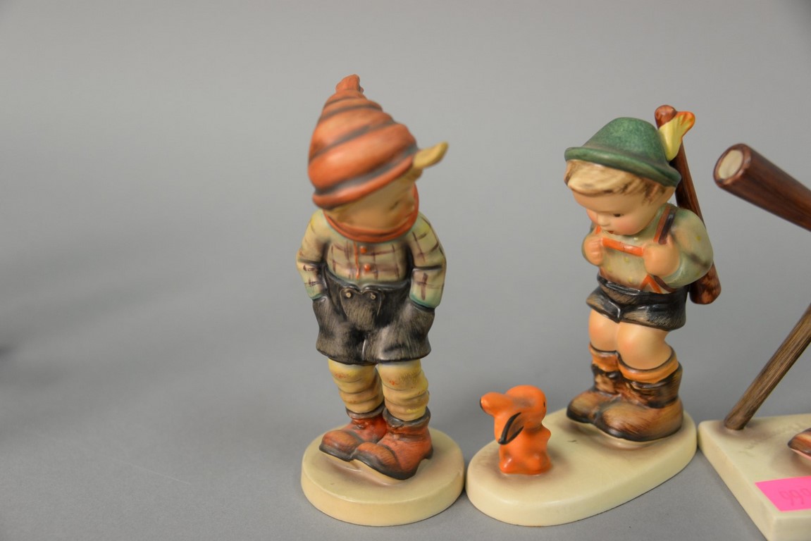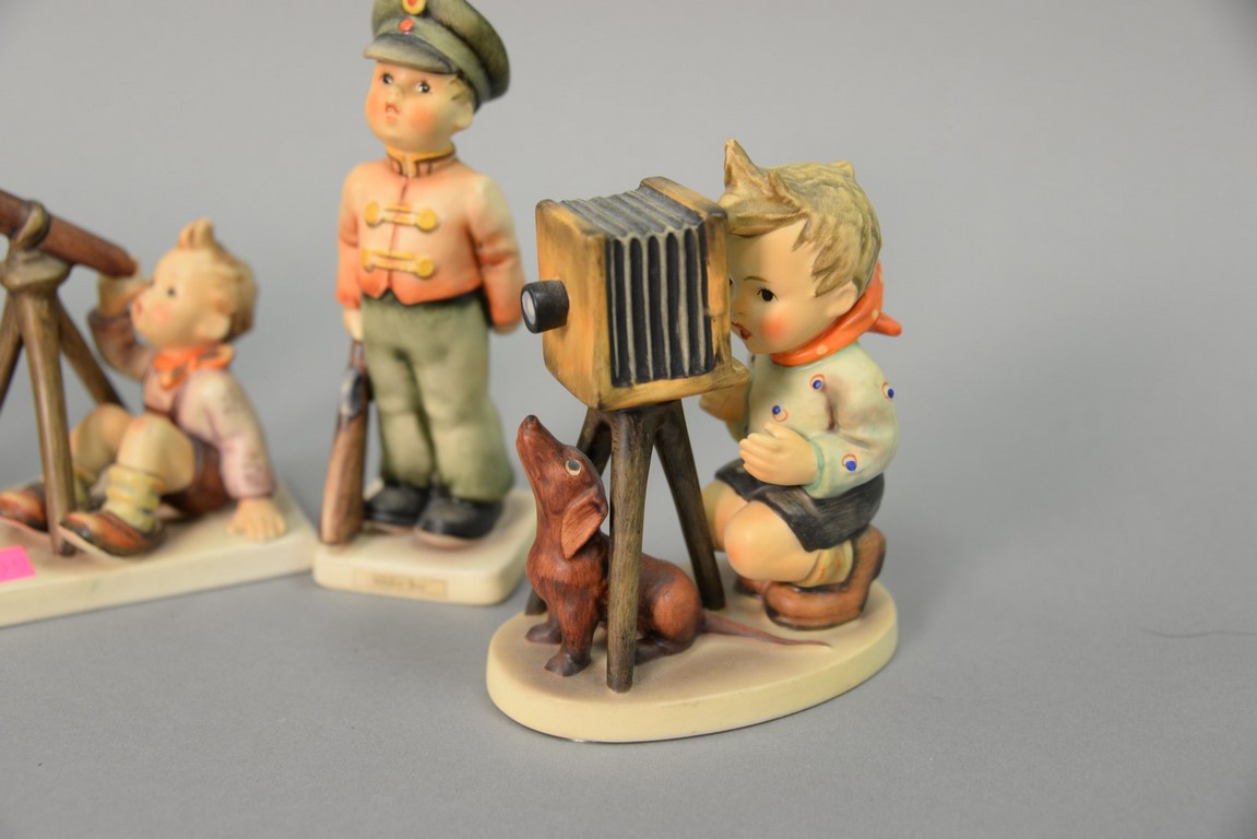 Group of five Hummels including Soldier Boy #332, March Winds #43, The Photographer Boy with a Camera #176, Star Gazer boy with telescope #132, and a Sensitive Hunter boy with rabbit #6/0. hts. 4 1/2 in. to 5 1/2 in.