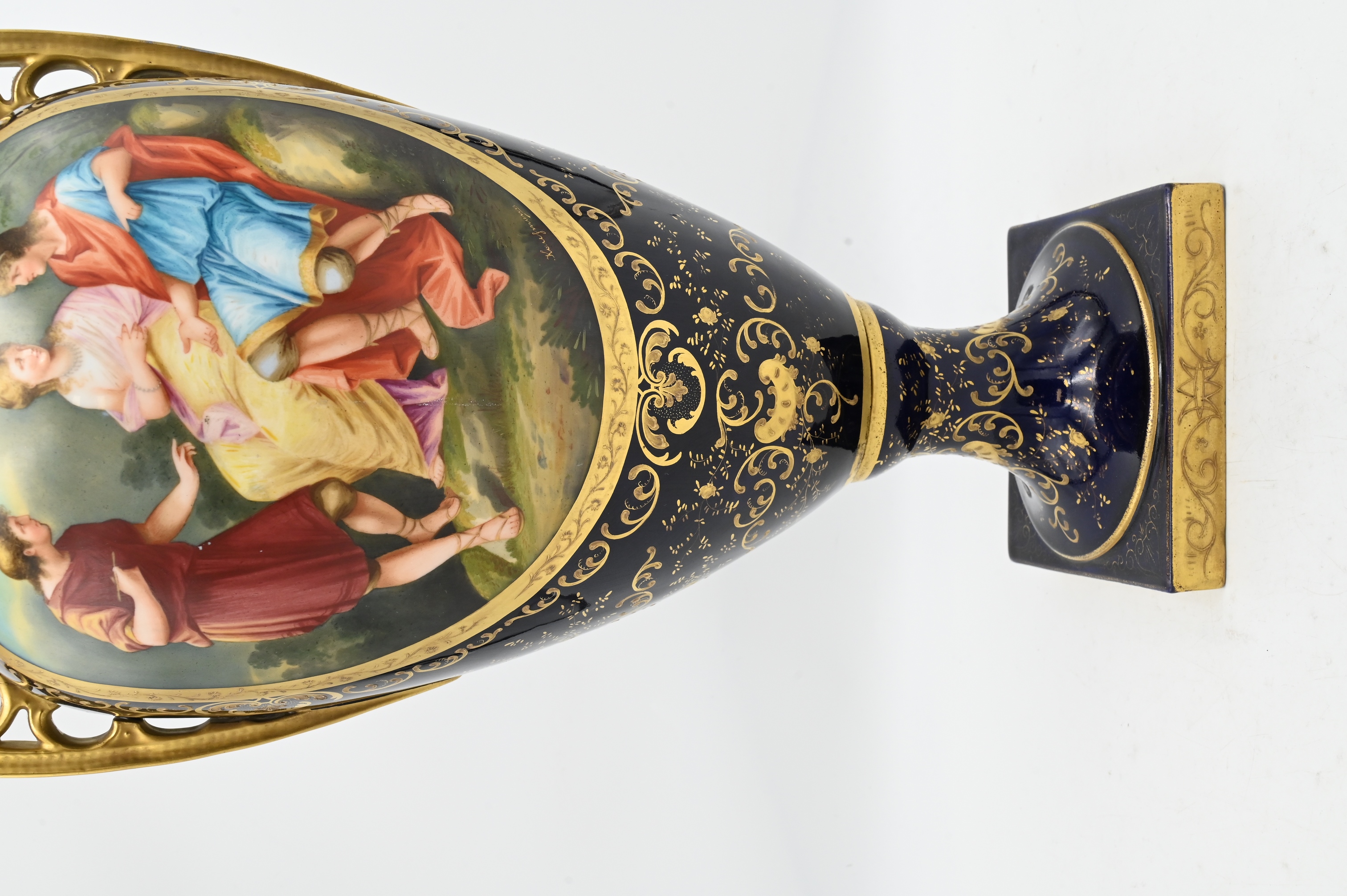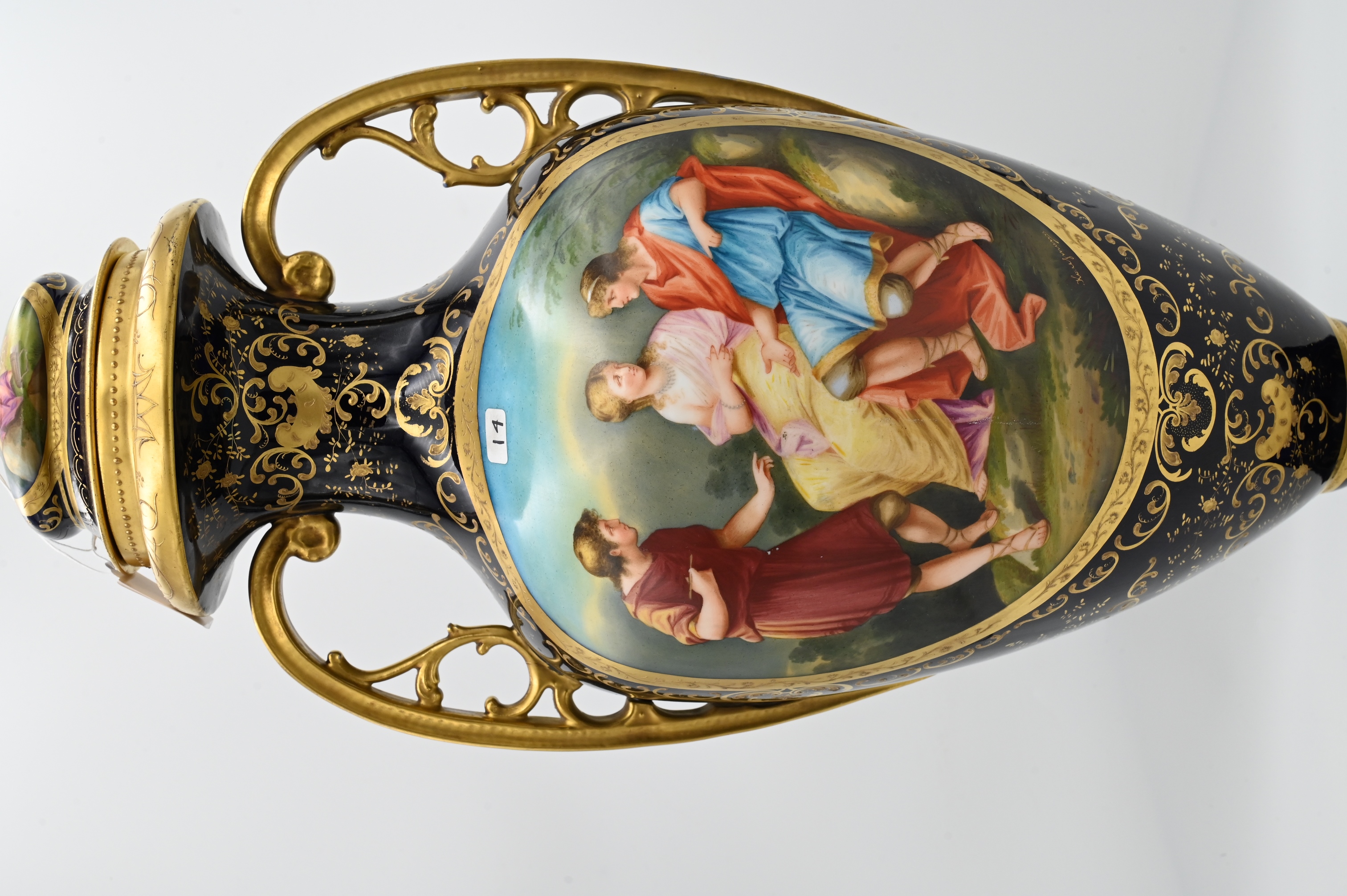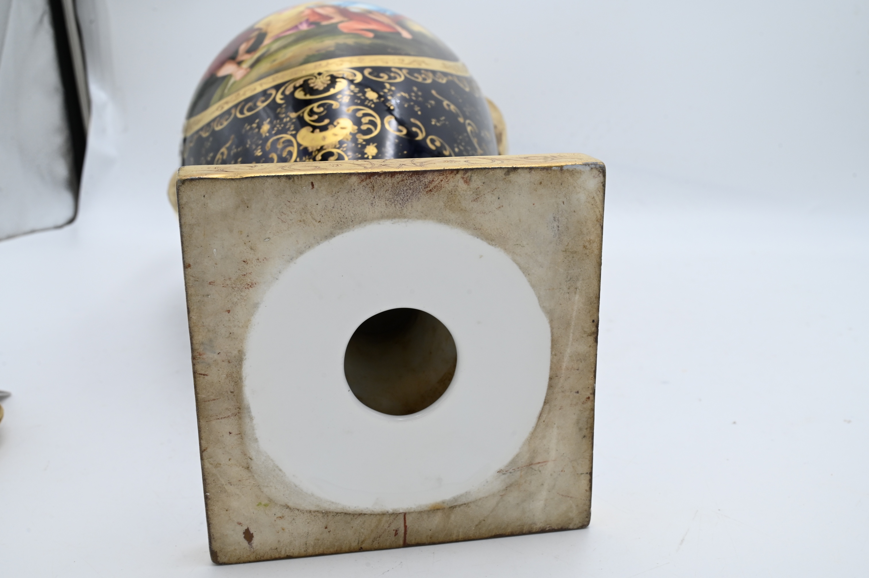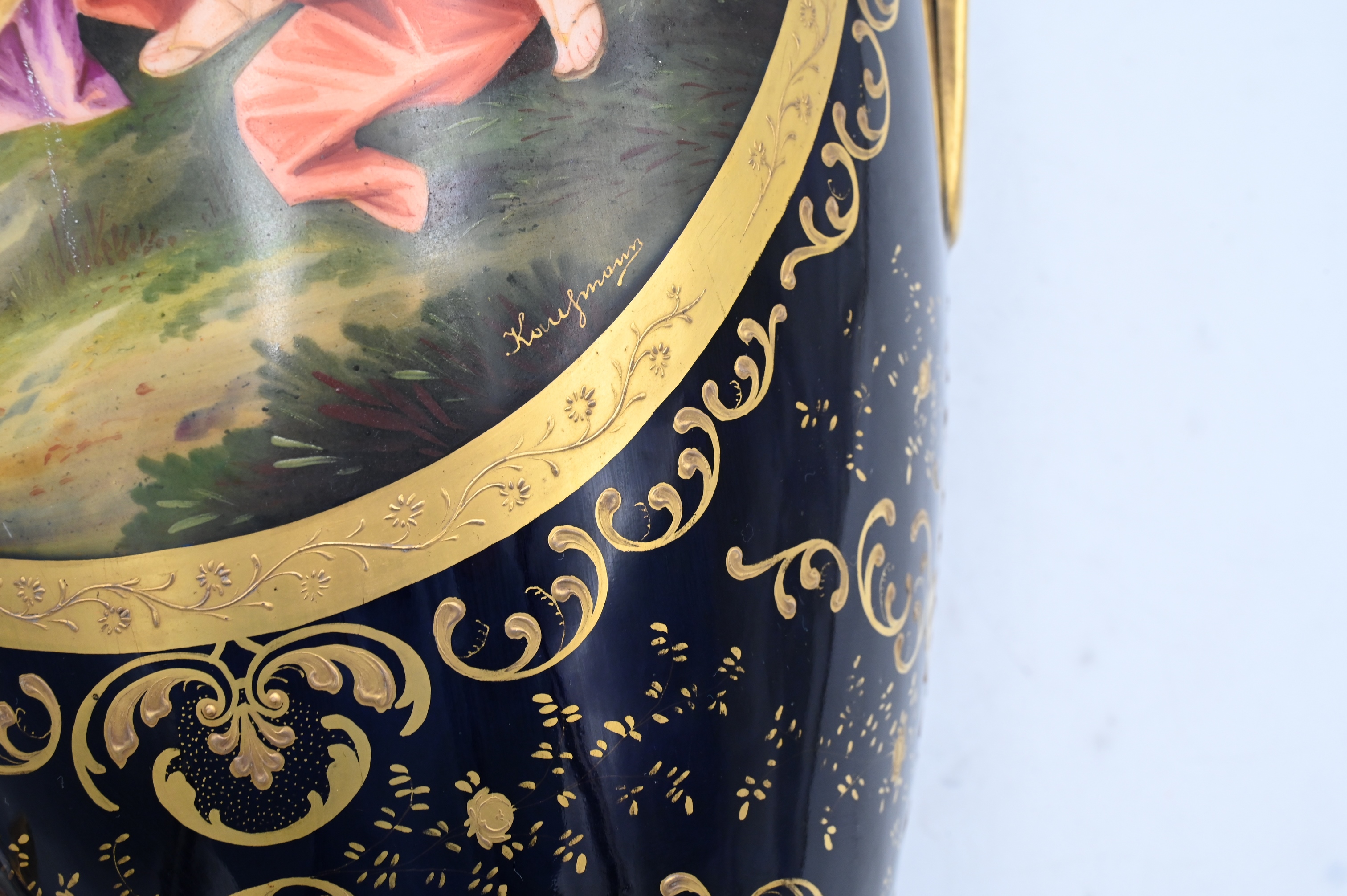 having painted panel with three classical figures, signed Kaufman, along with two art glass shades