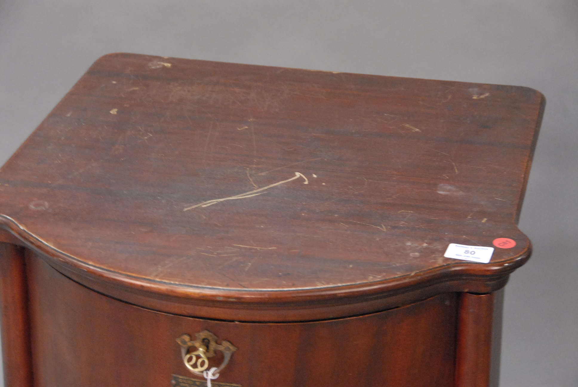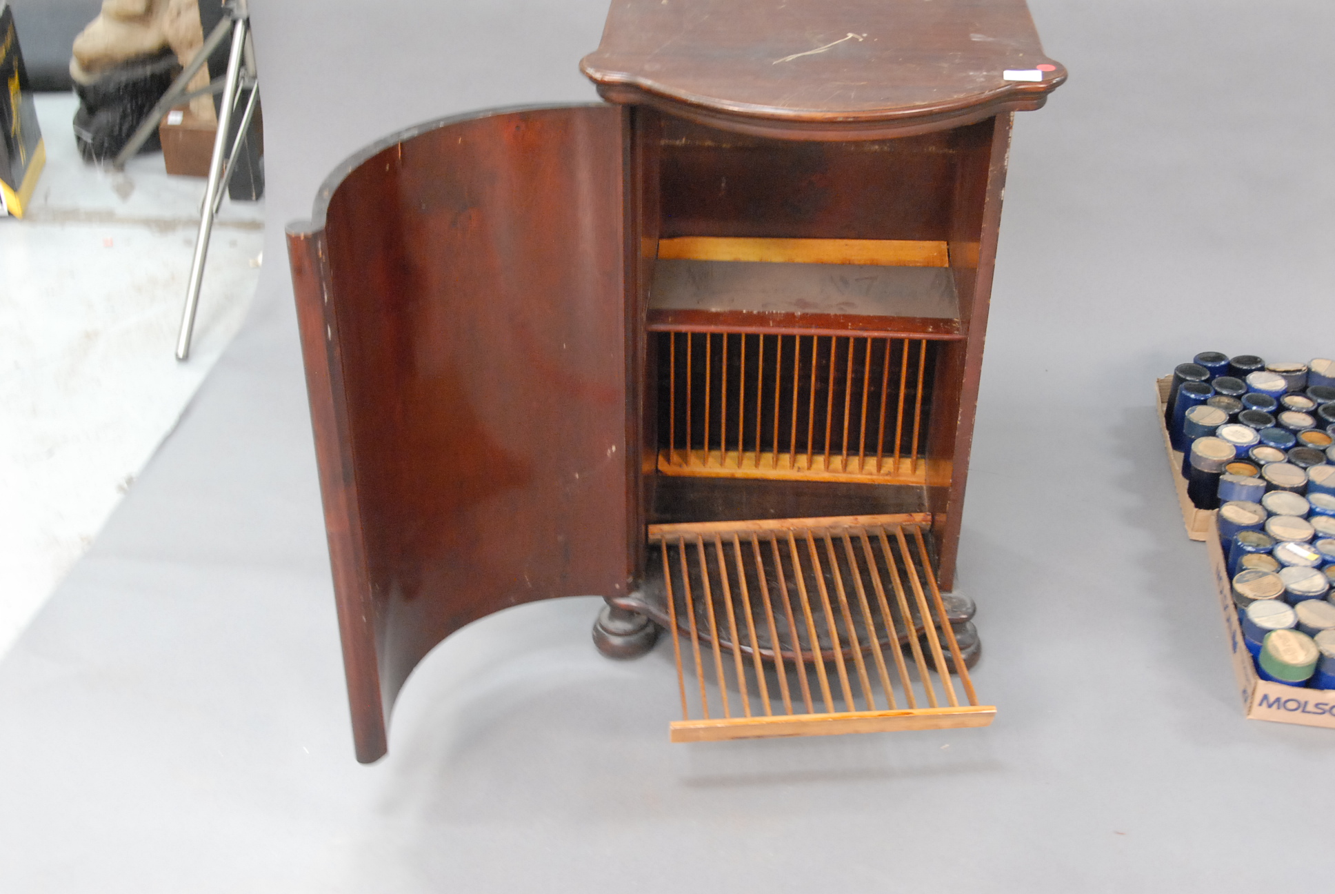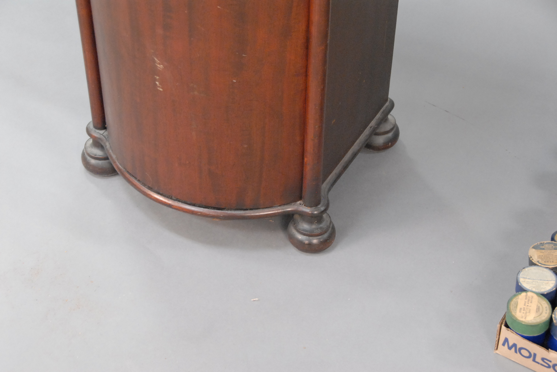 Mahogany half barrel record cabinet.