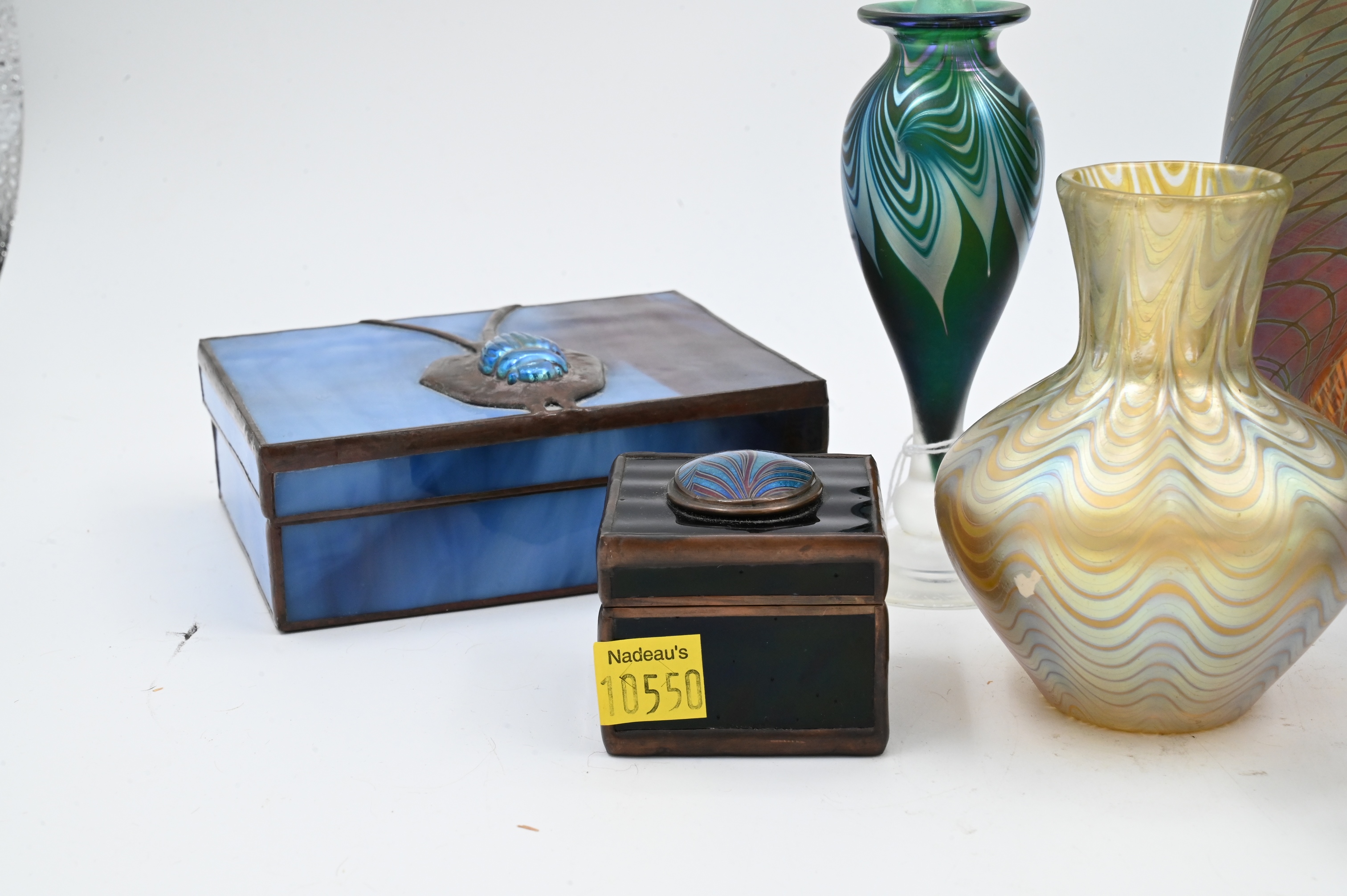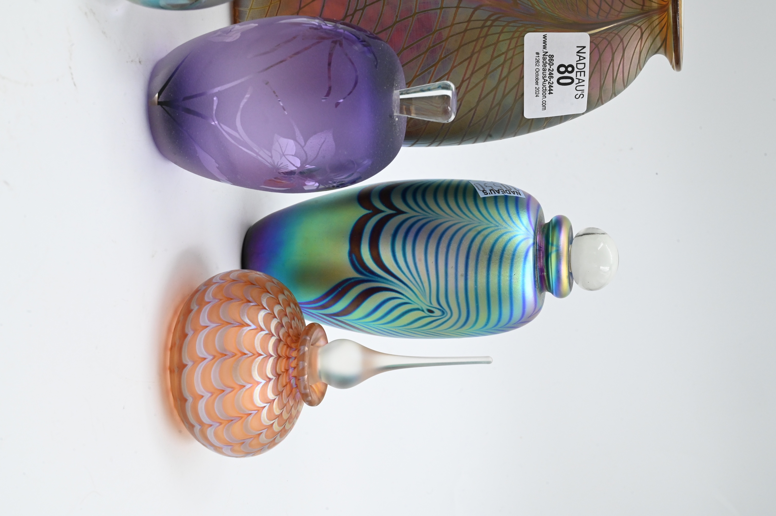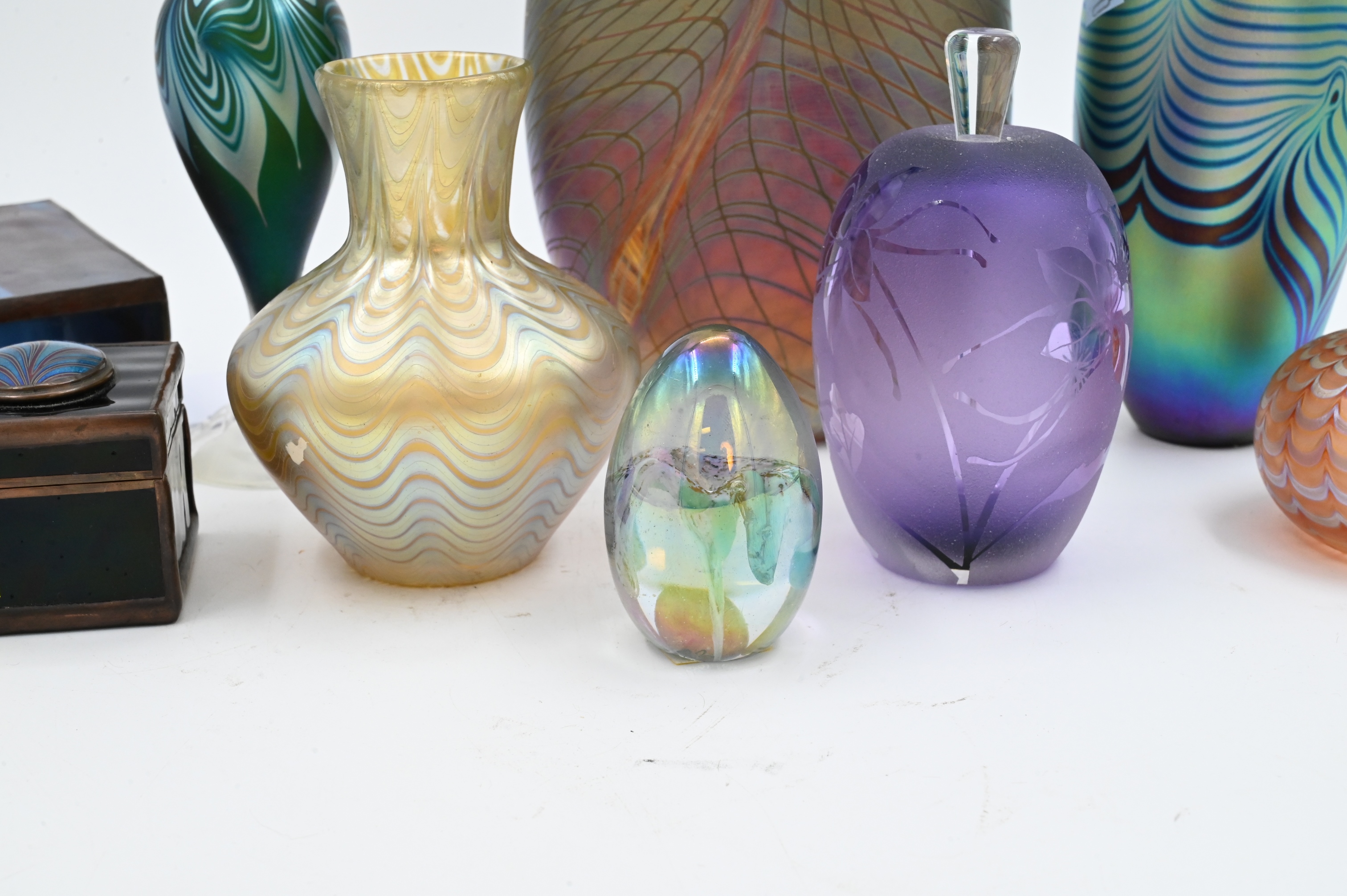 to include Craig Zweifel Studio art glass iridescent 1982, Correia limited edition 95/250 perfume bottle 1982, Robert Eickholt swirl perfume, Janet Kelman purple perfume, Correia peach perfume, two Daniel Boone for Orient Flume boxes one of which is a scarab 1975 and a small black box 1980