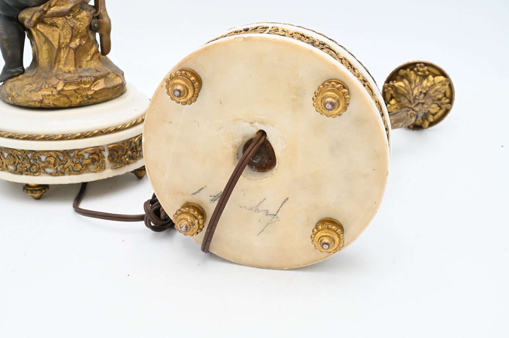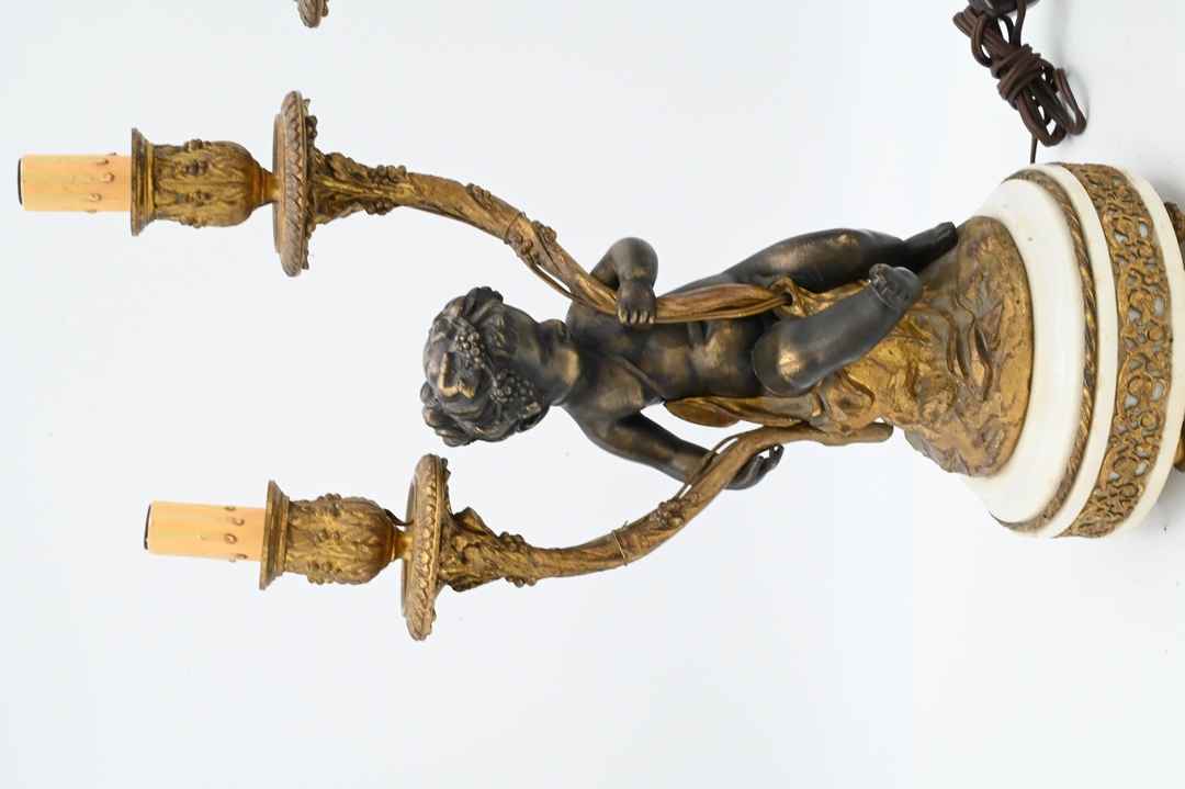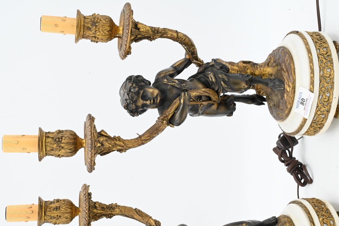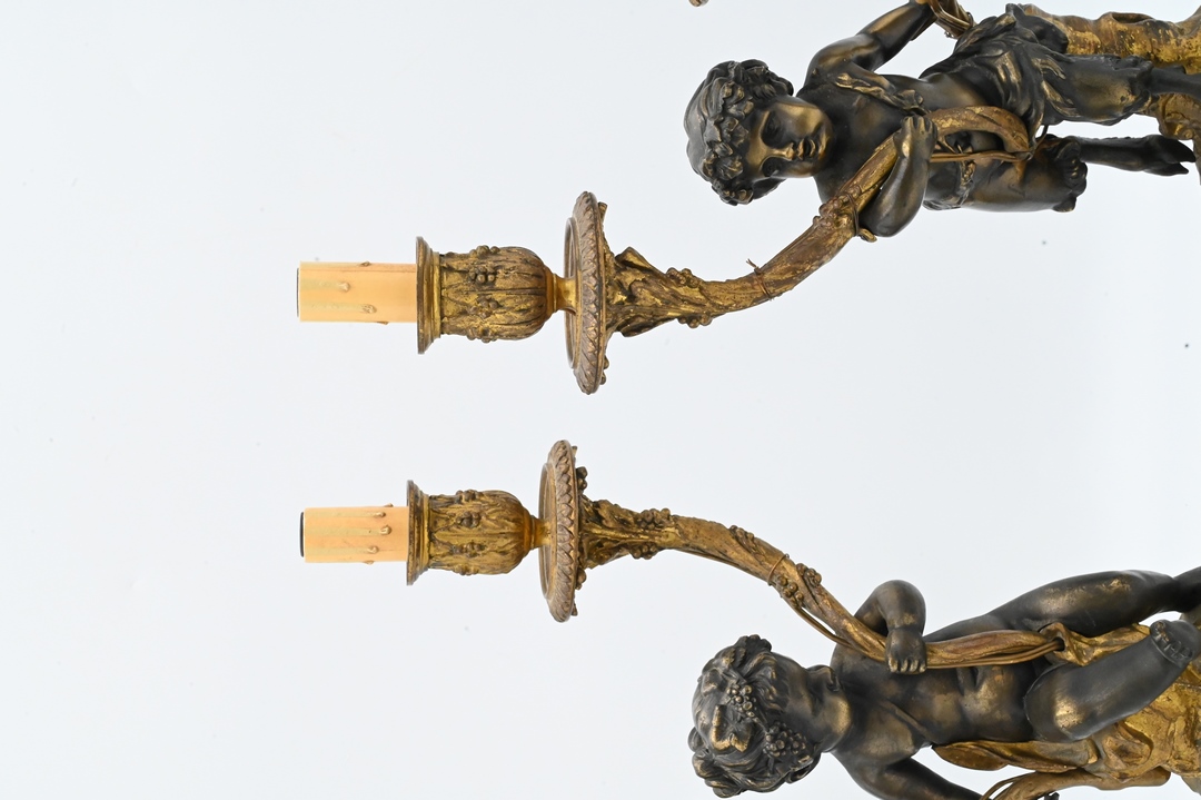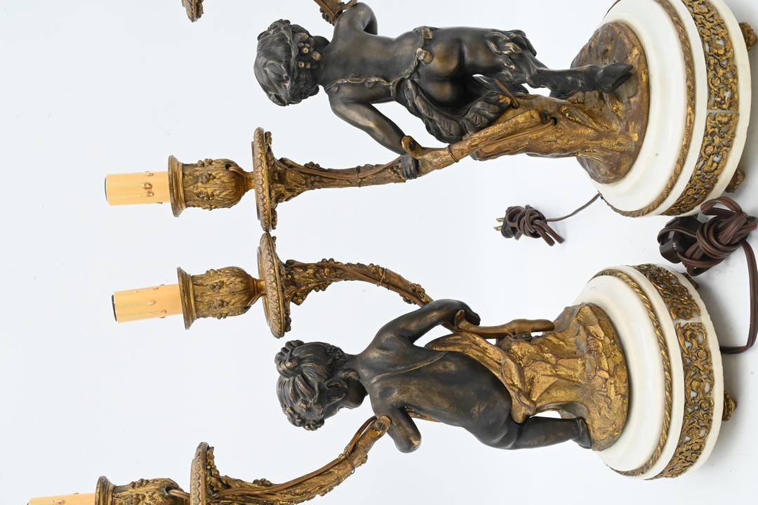 Pair of Bronze Figured Candelabra Lamps, having marble bases and putti figures, height 18 inches.