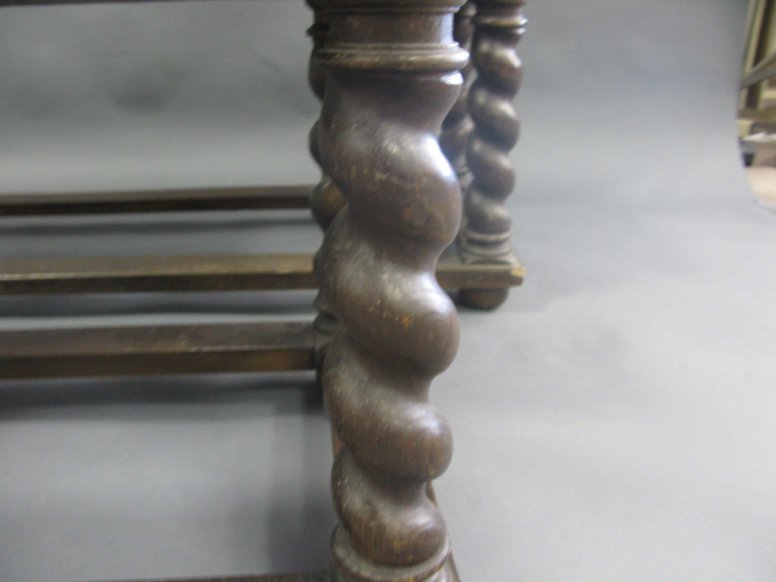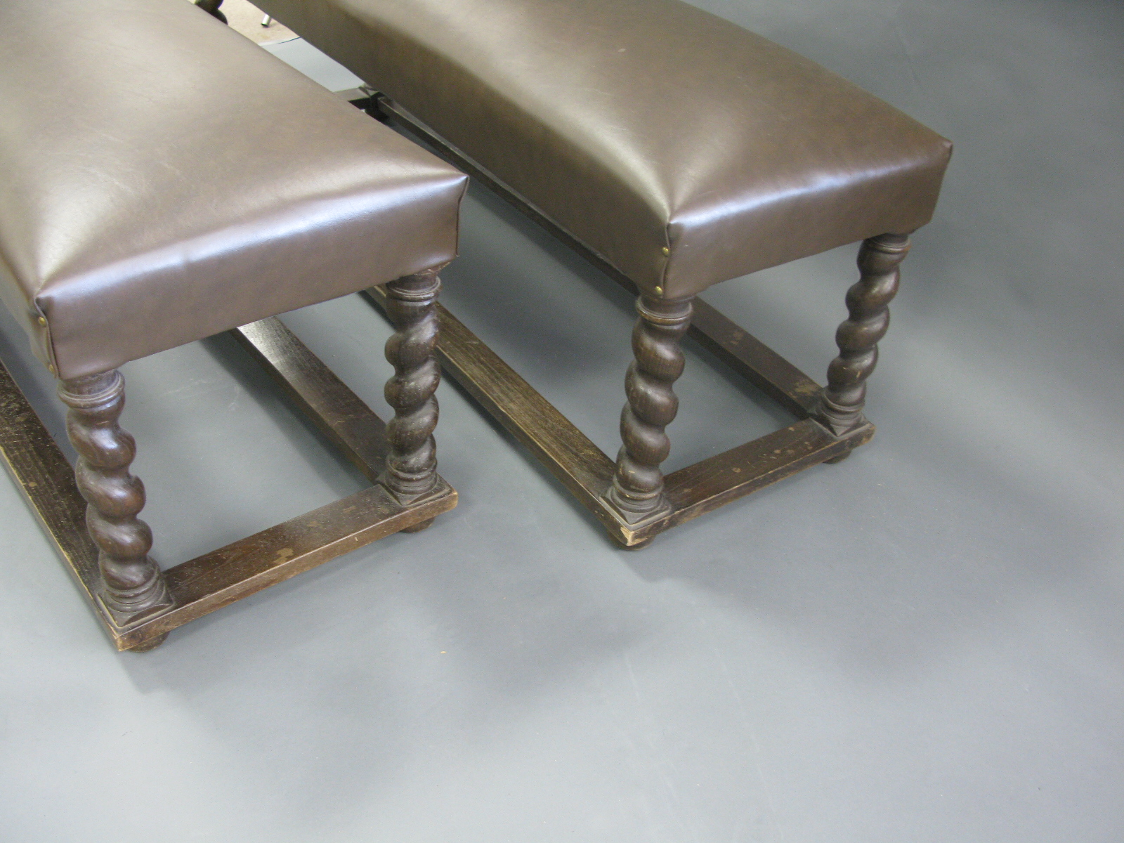 Pair of Jacobean style benches with vinyl upholstered tops.