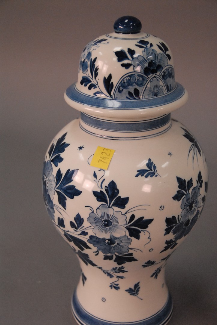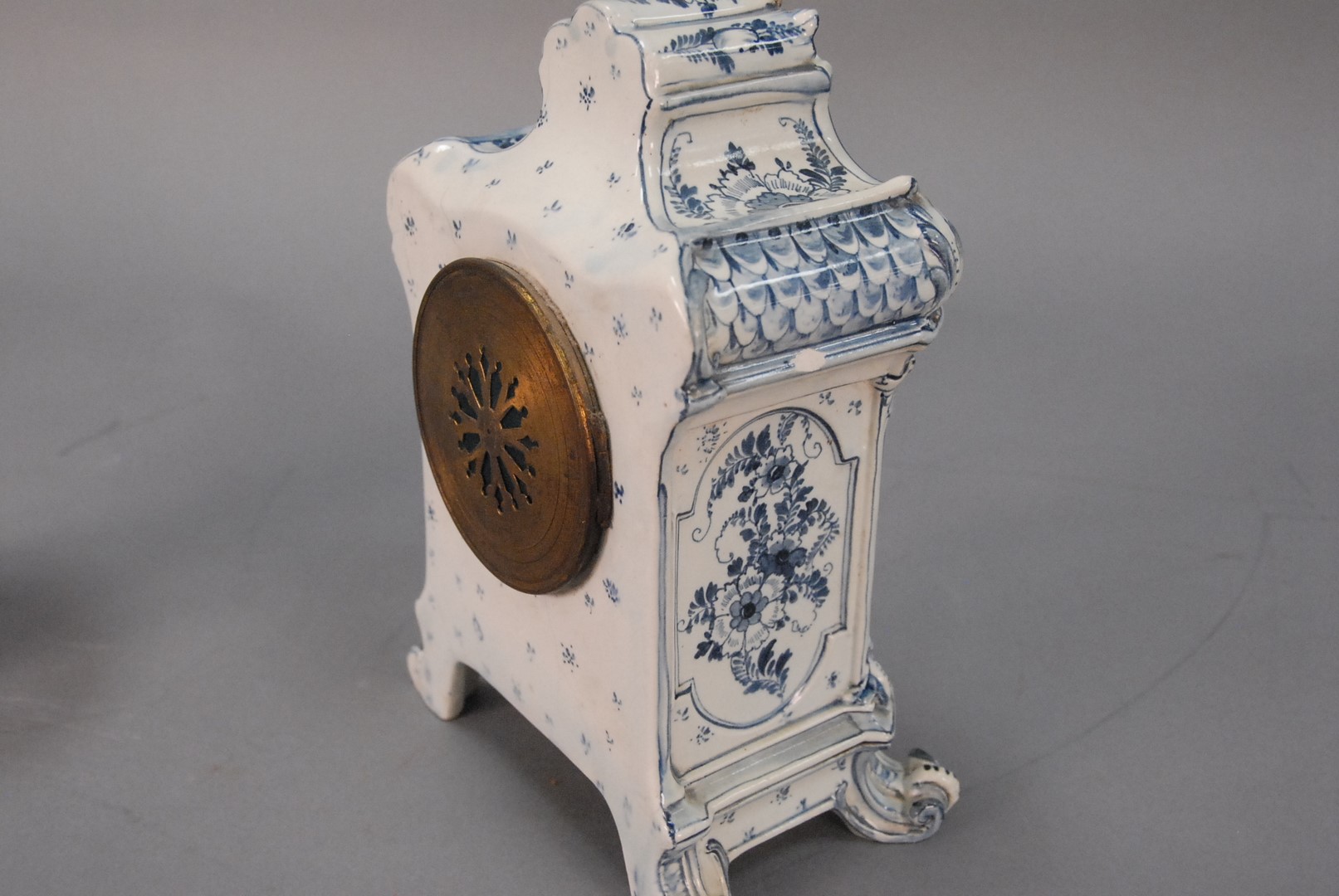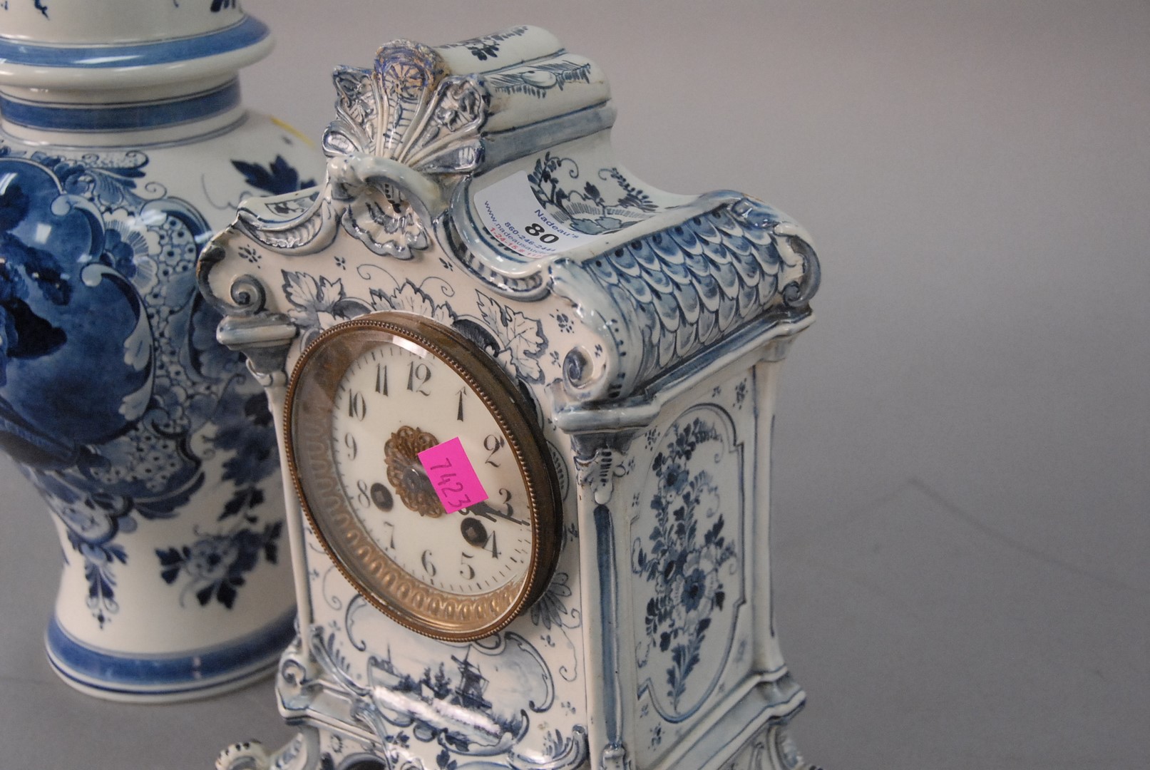 Lot 80: Royal Bonn Delft mantle clock and a Delft urn clock with repair to top and small chip on side.