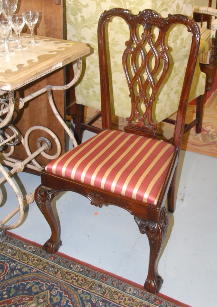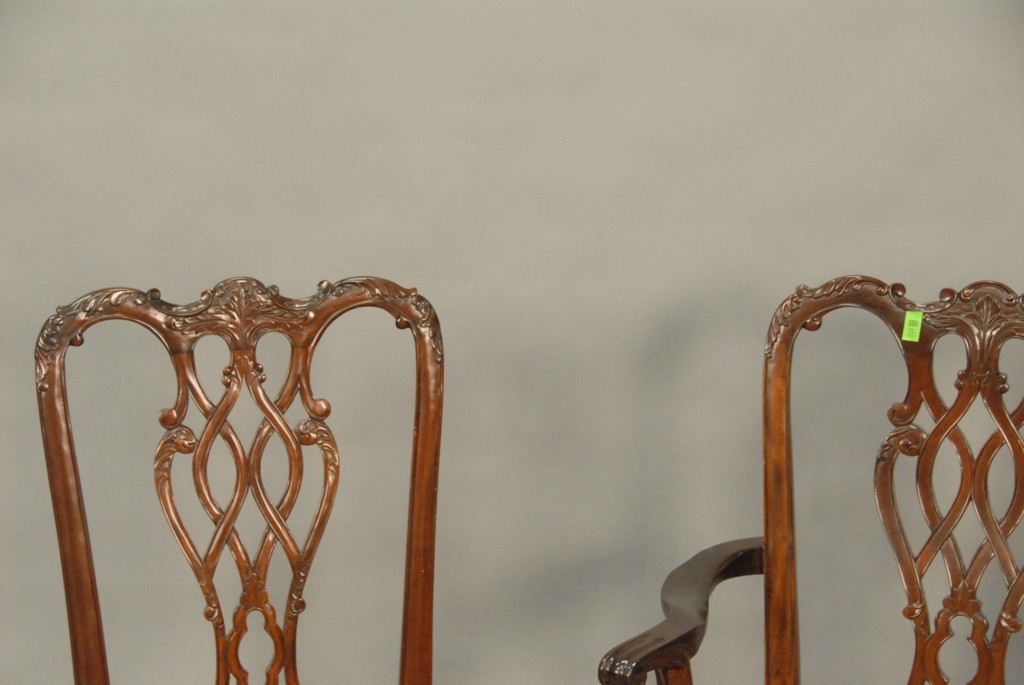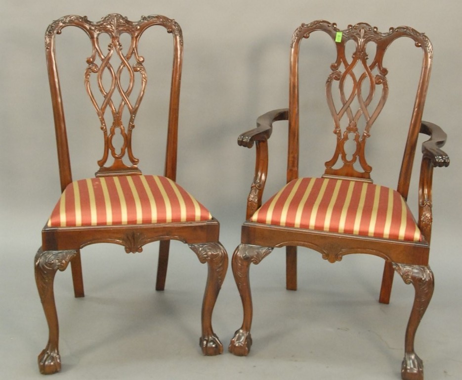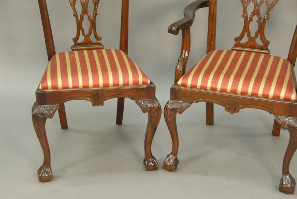 Set of ten mahogany Chippendale style dining chairs with ball and claw feet.