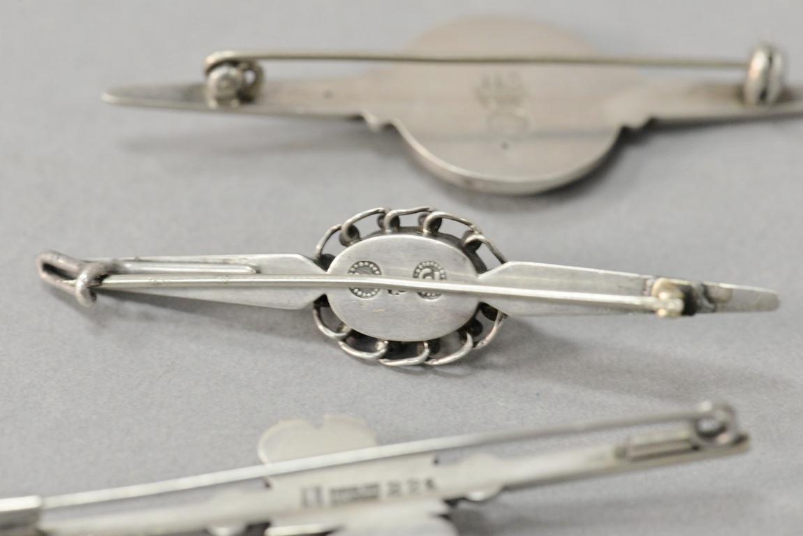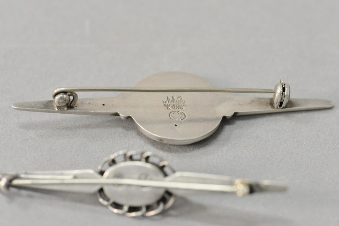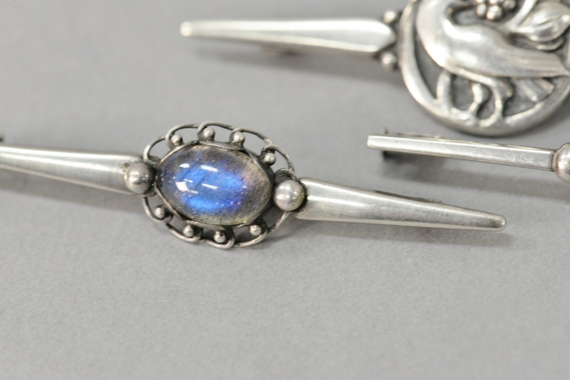 Three Georg Jenson silver pins, two with moon stones and one having bird figure, all marked Georg Jensen.