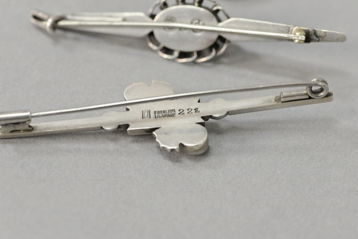 Lot 80: Three Georg Jenson silver pins, two with moon stones and one having bird figure, all marked Georg Jensen.