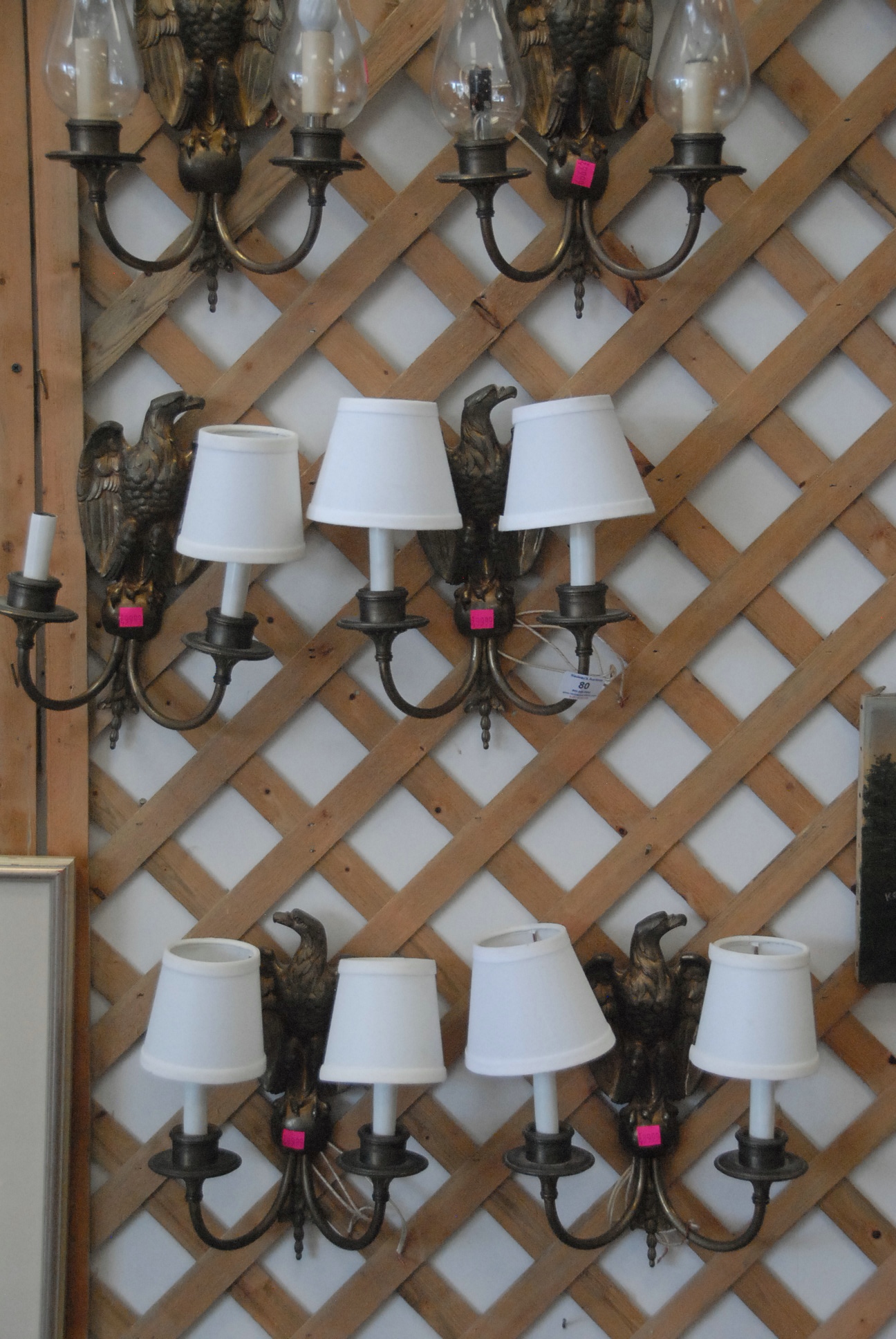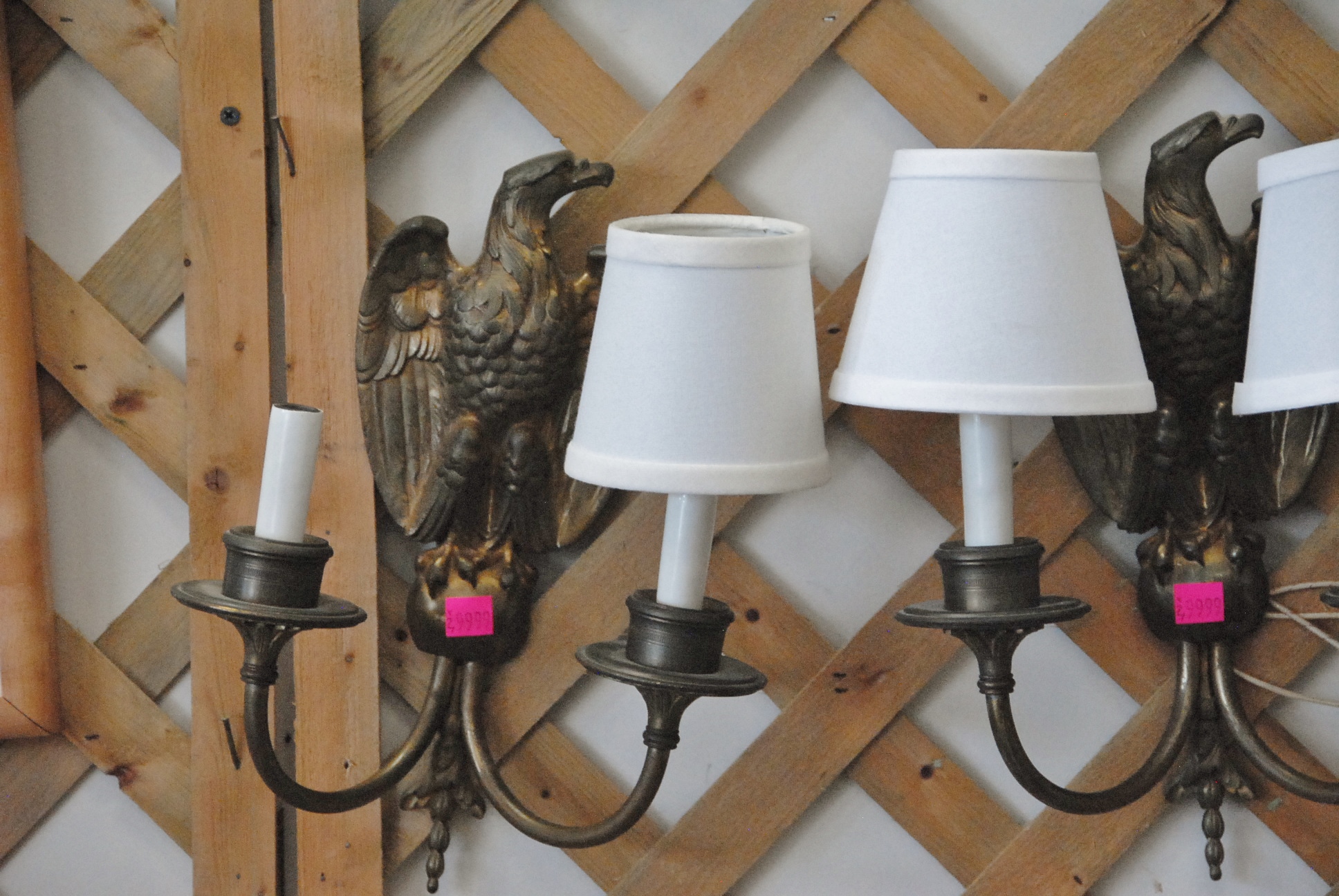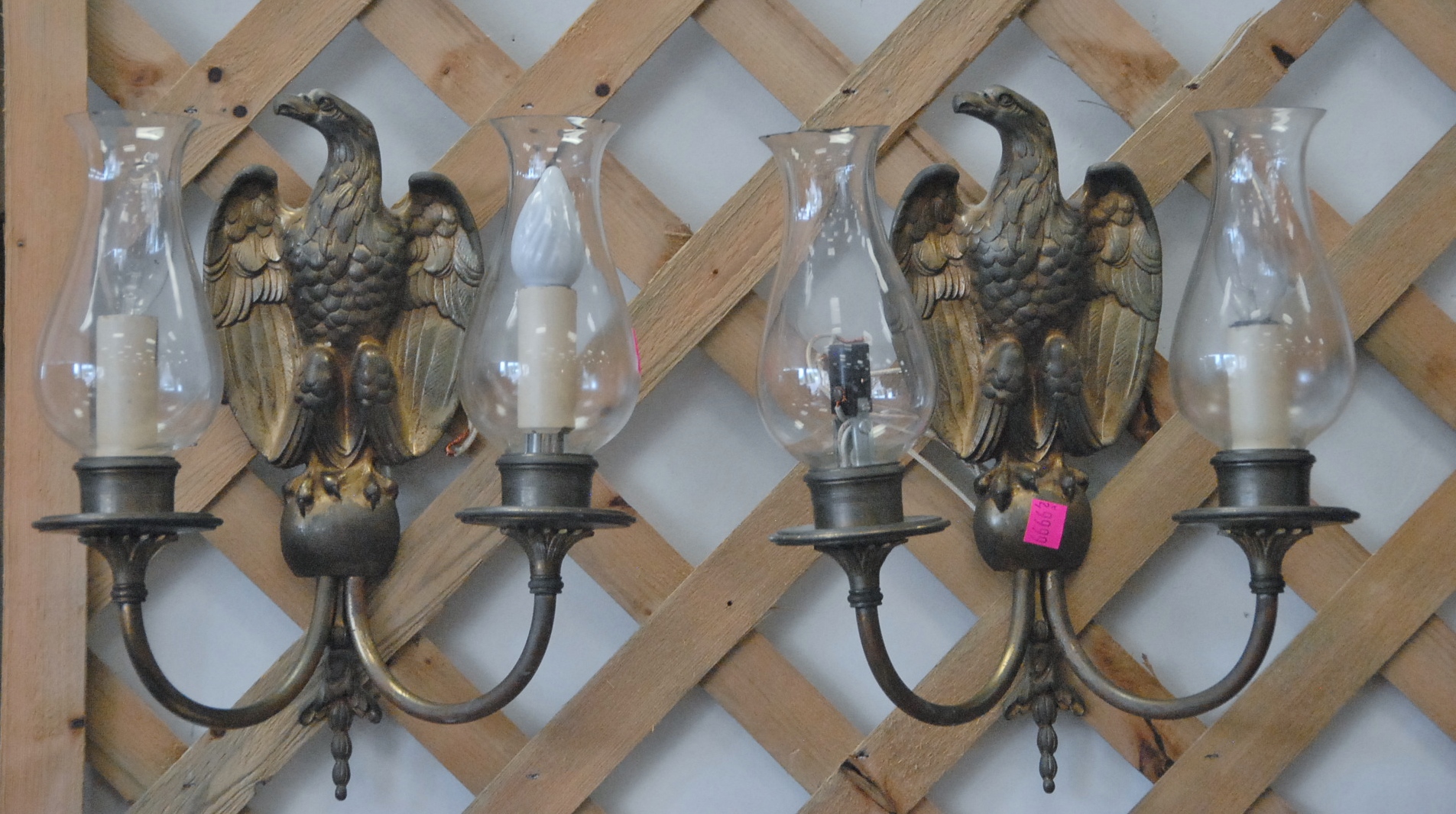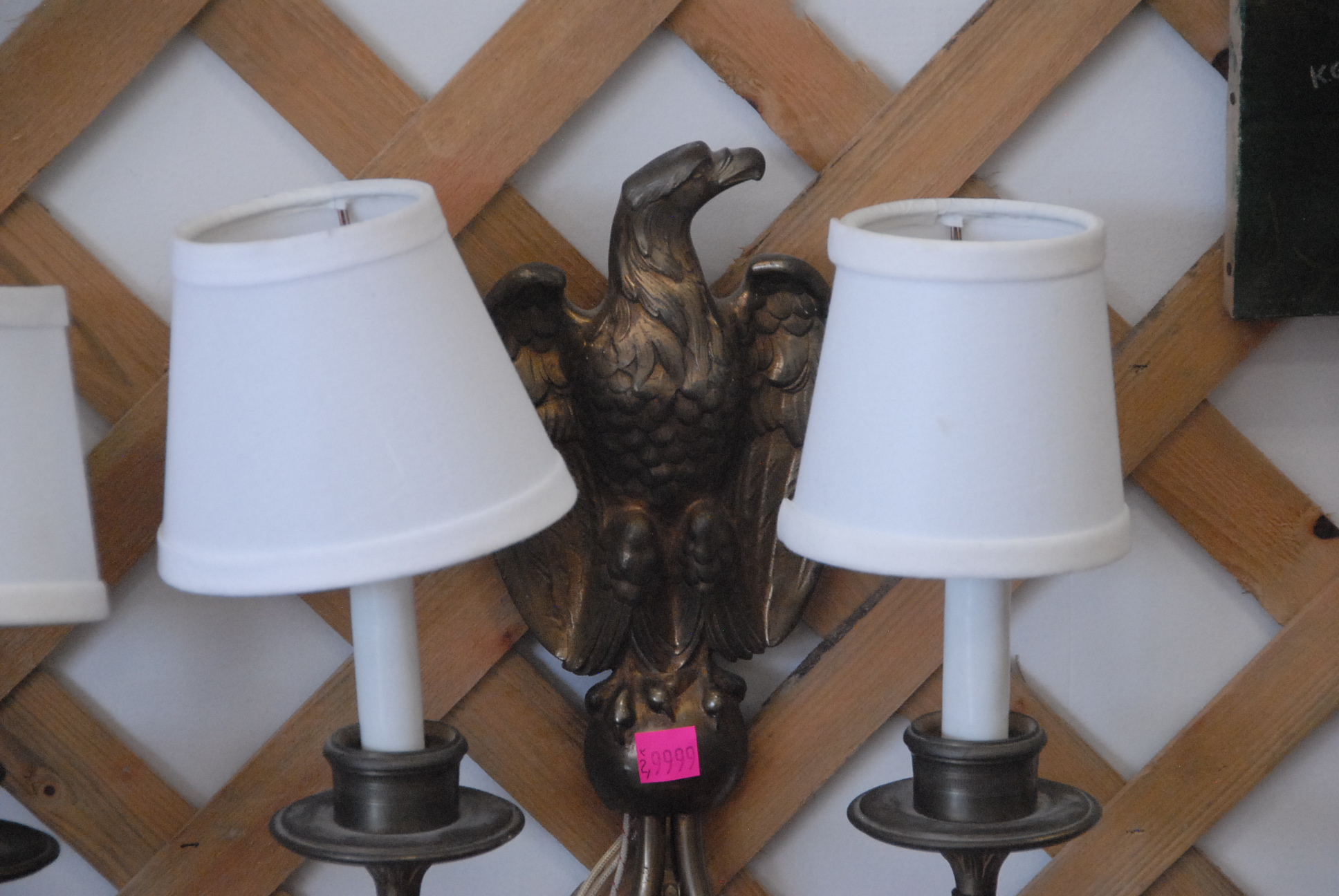 Lot 80: Three pairs of eagle sconces, one pair with glass chimneys, marked Sterling Bronze Co. N.Y.ht. 12 1/2 in.