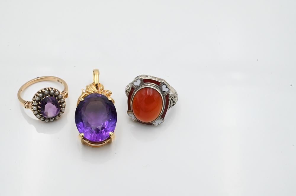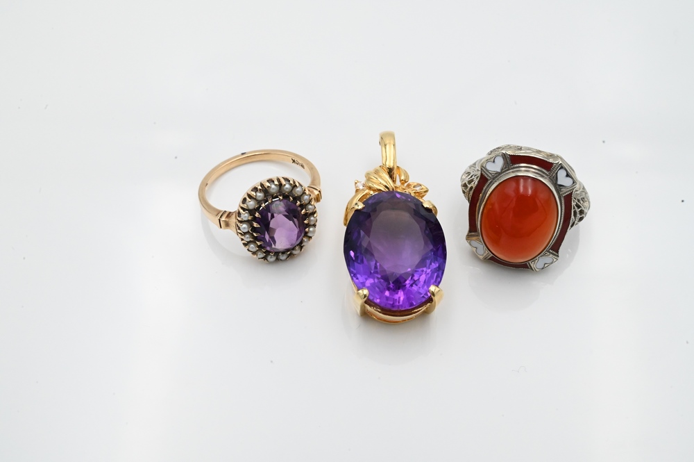 Three Piece Lot, to include 14 karat gold pendant set with oval amethyst, 14 karat white gold ring, enameled with oval cabochon cut stone, size 5 3/4, total weight 15.1 grams.