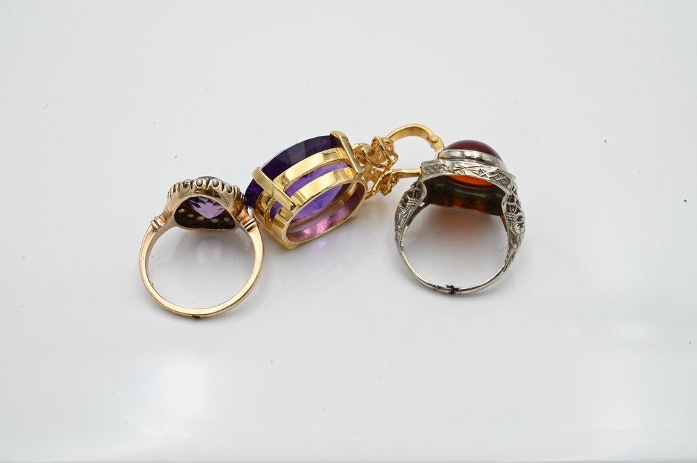 Lot 80: Three Piece Lot, to include 14 karat gold pendant set with oval amethyst, 14 karat white gold ring, enameled with oval cabochon cut stone, size 5 3/4, total weight 15.1 grams.