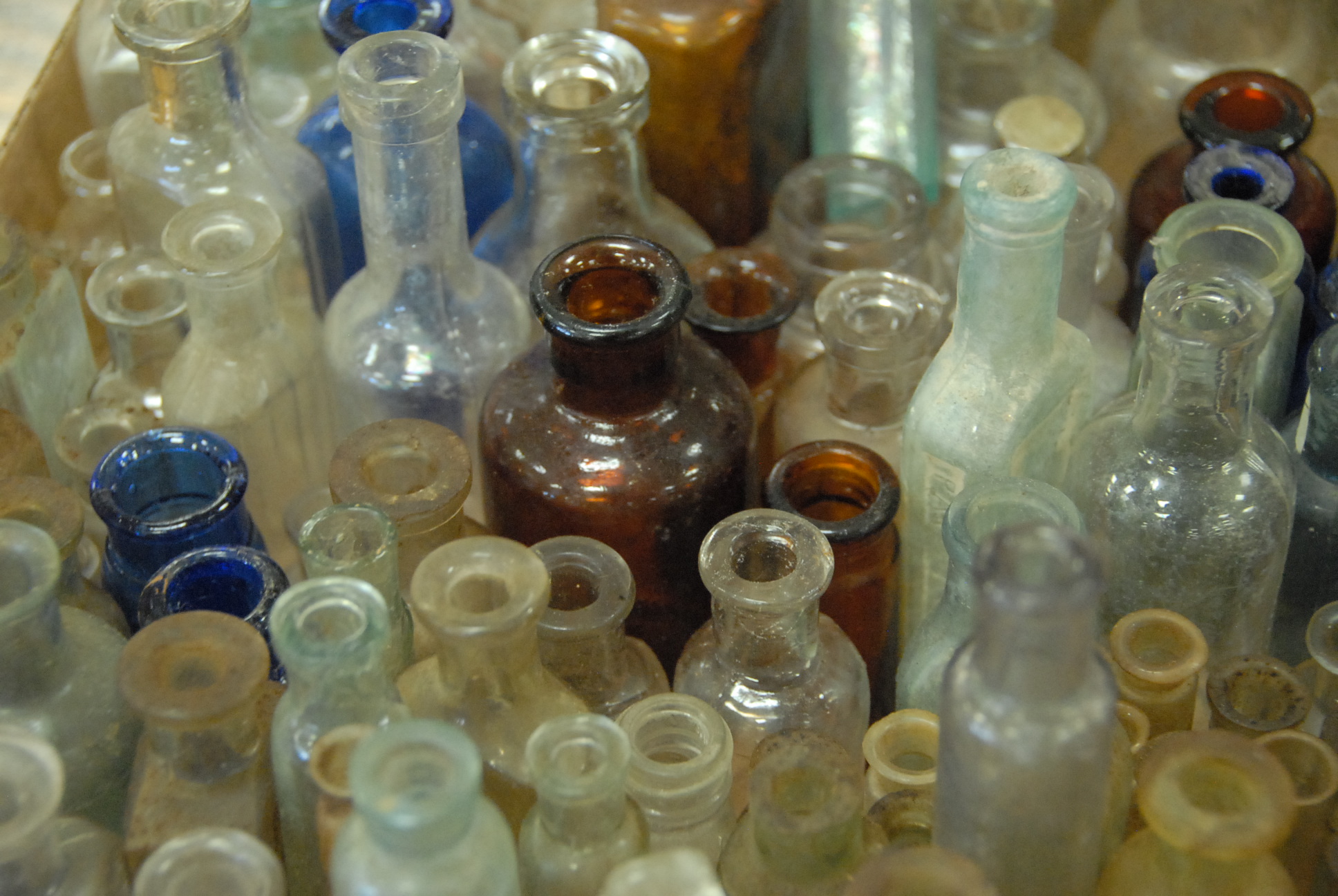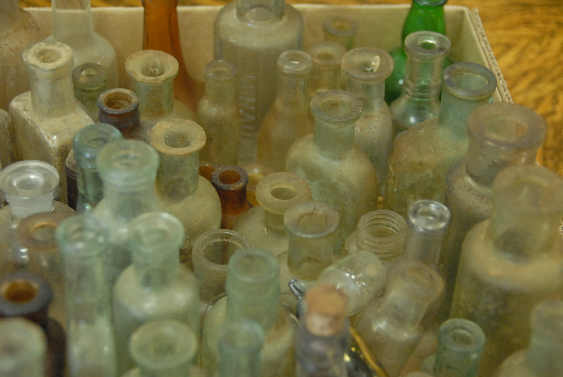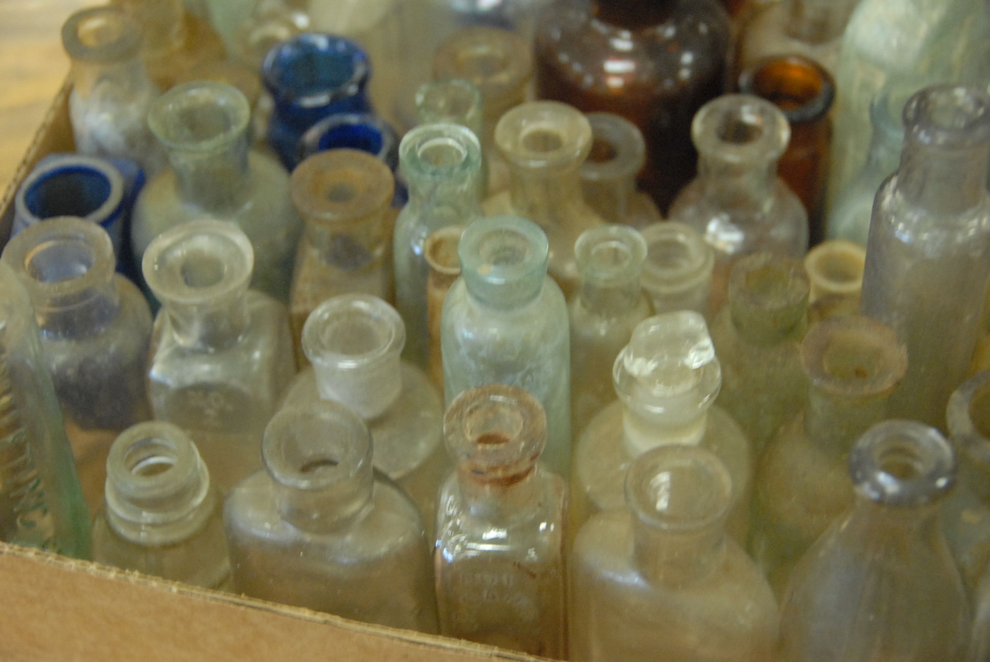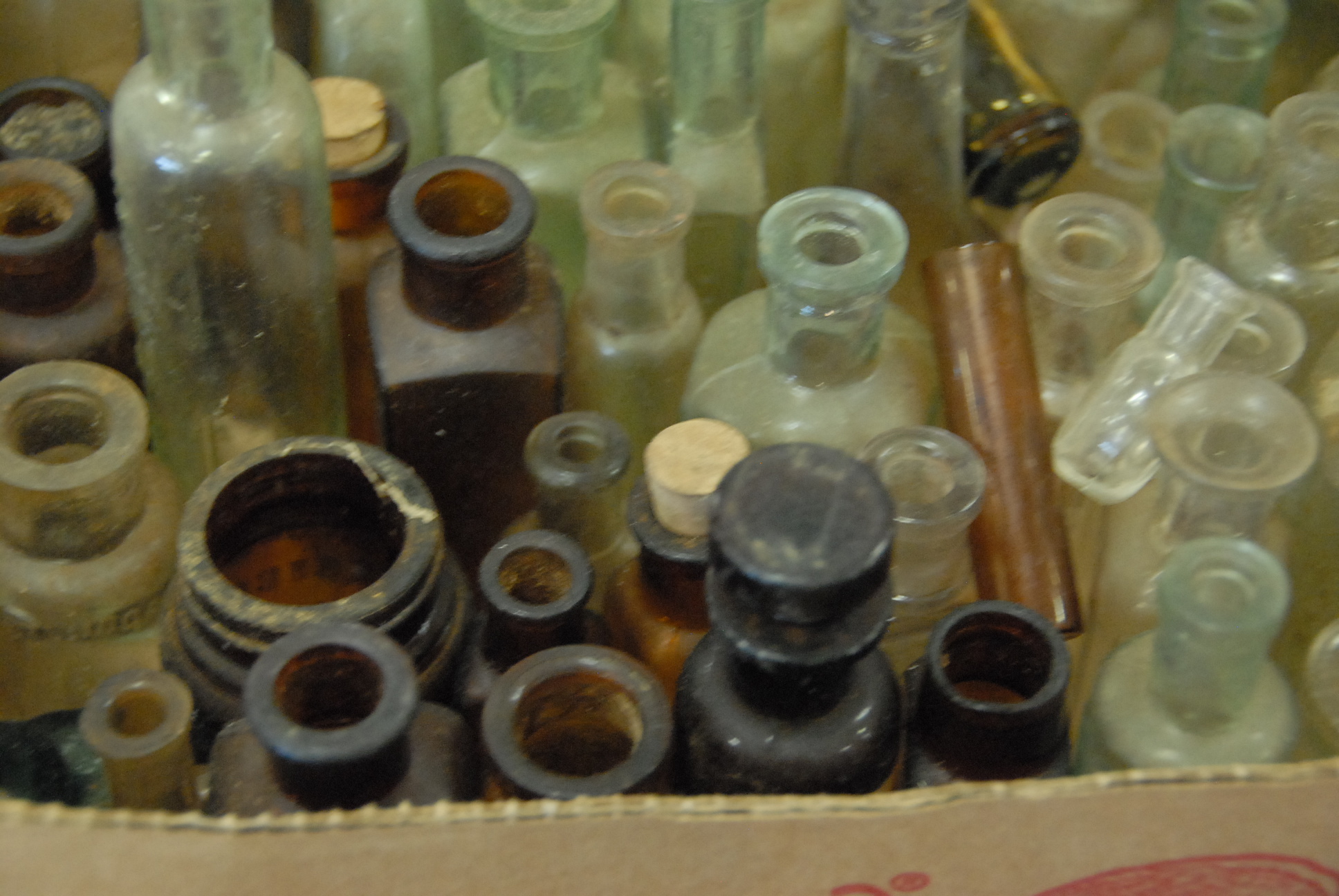 Two box lots of mostly medicinal bottles and pill bottles, approximately 200 bottles total, ht. 1 1/2 to 5.