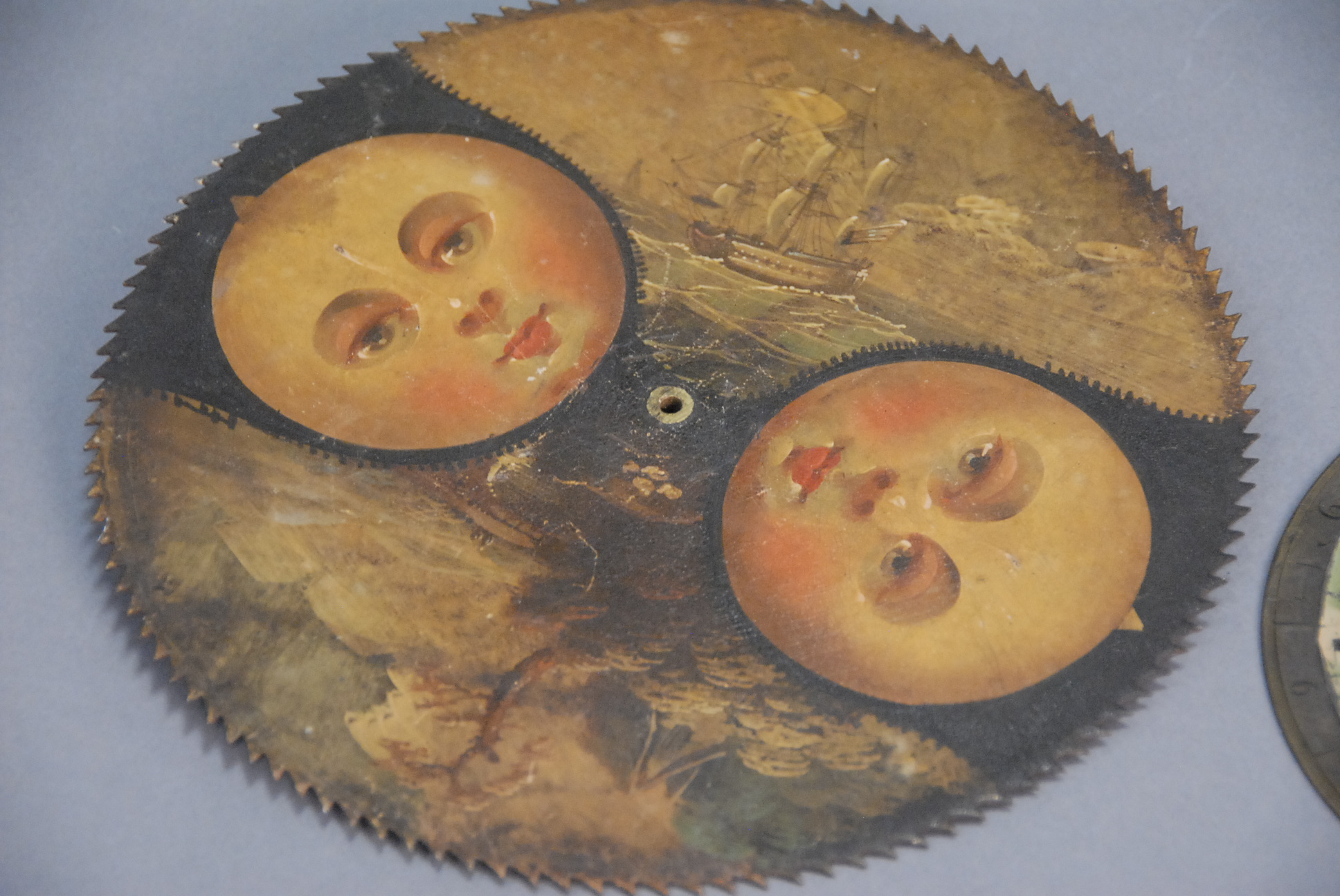 Two moon phase dials from early clocks, dia. 8 1/2in. & 6in.