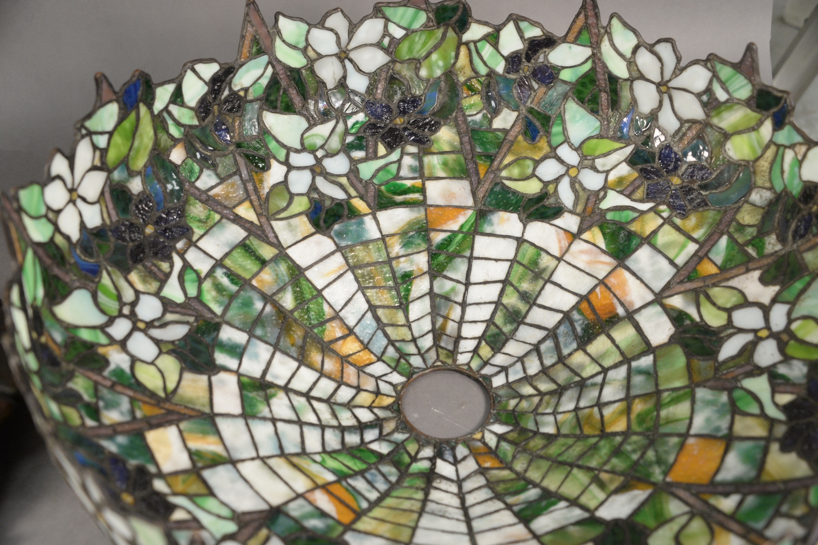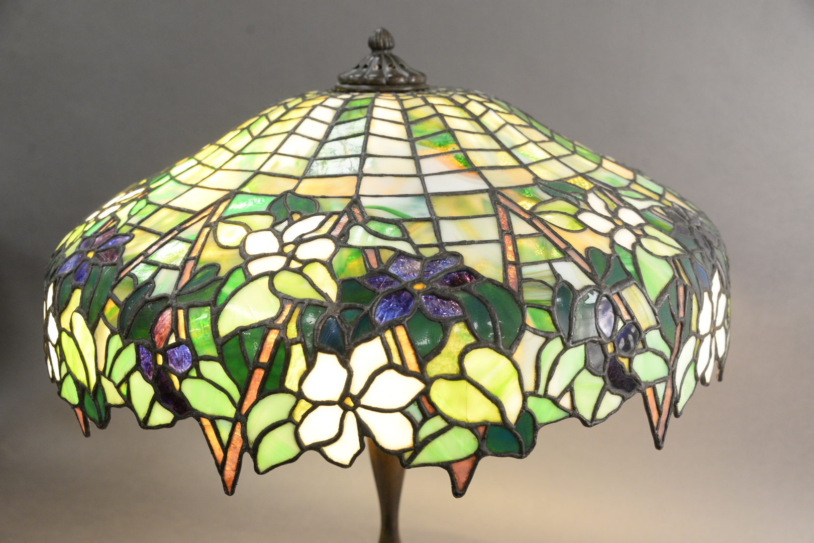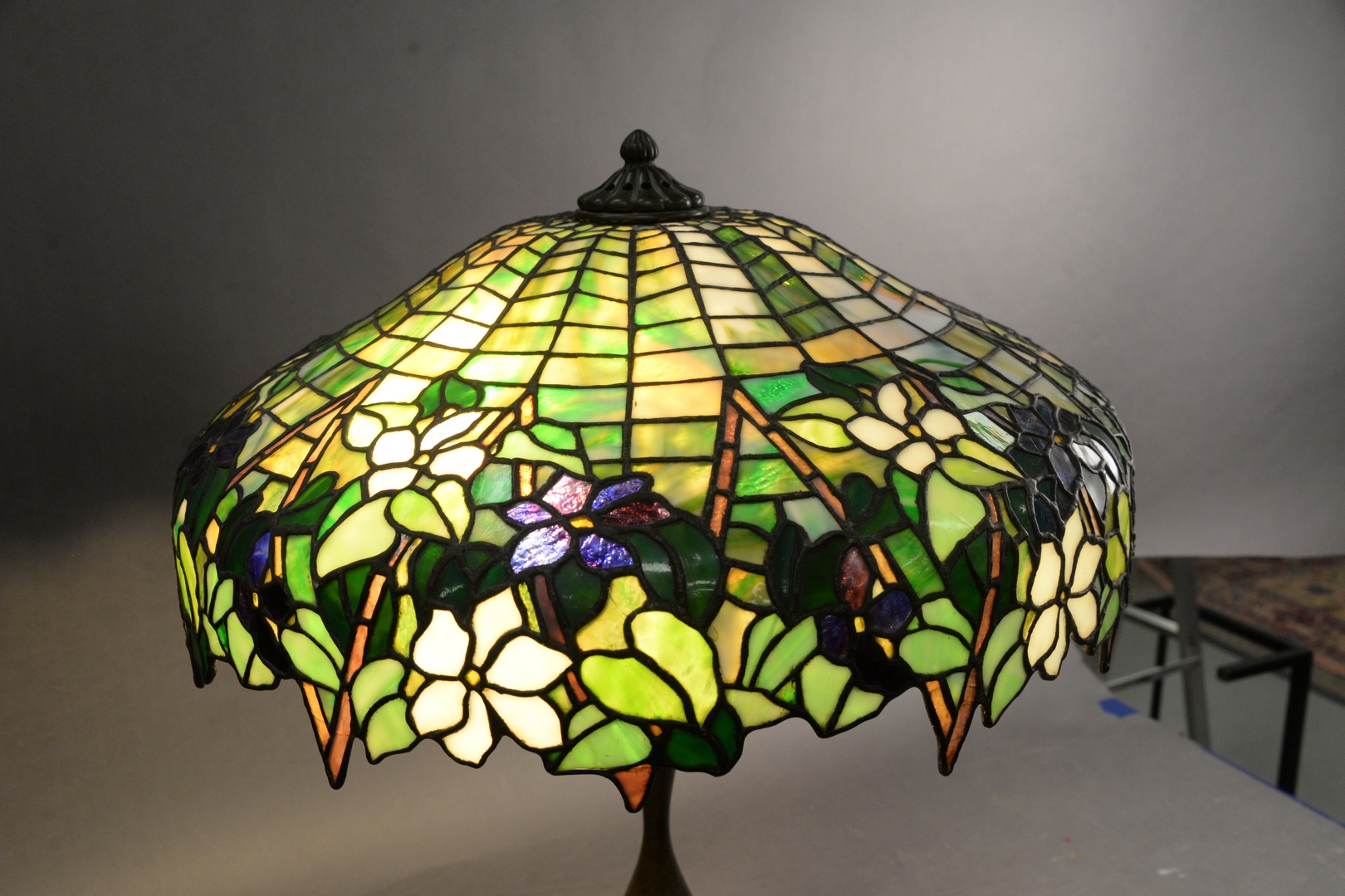 Lot 800: Large American Leaded Glass Peony Table Lamp, having patinated bronze four-light base, supporting shade with purple and white flower…