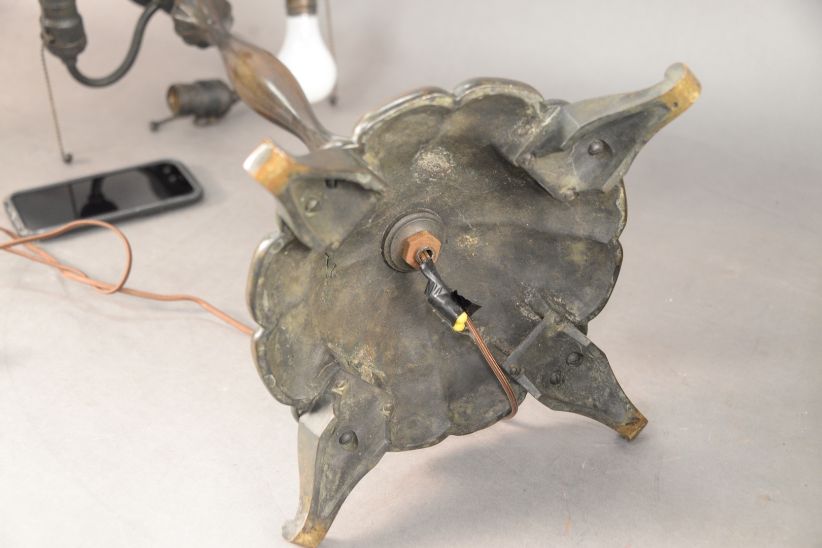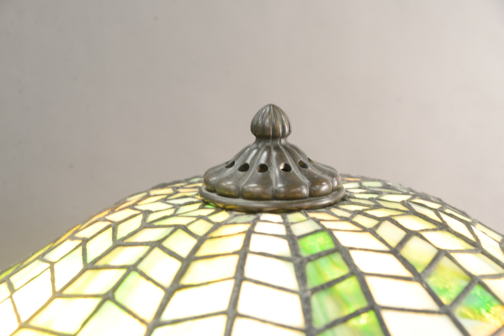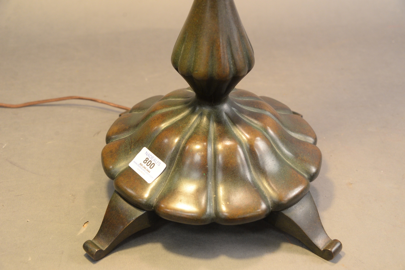Lot 800: Large American Leaded Glass Peony Table Lamp, having patinated bronze four-light base, supporting shade with purple and white flower…