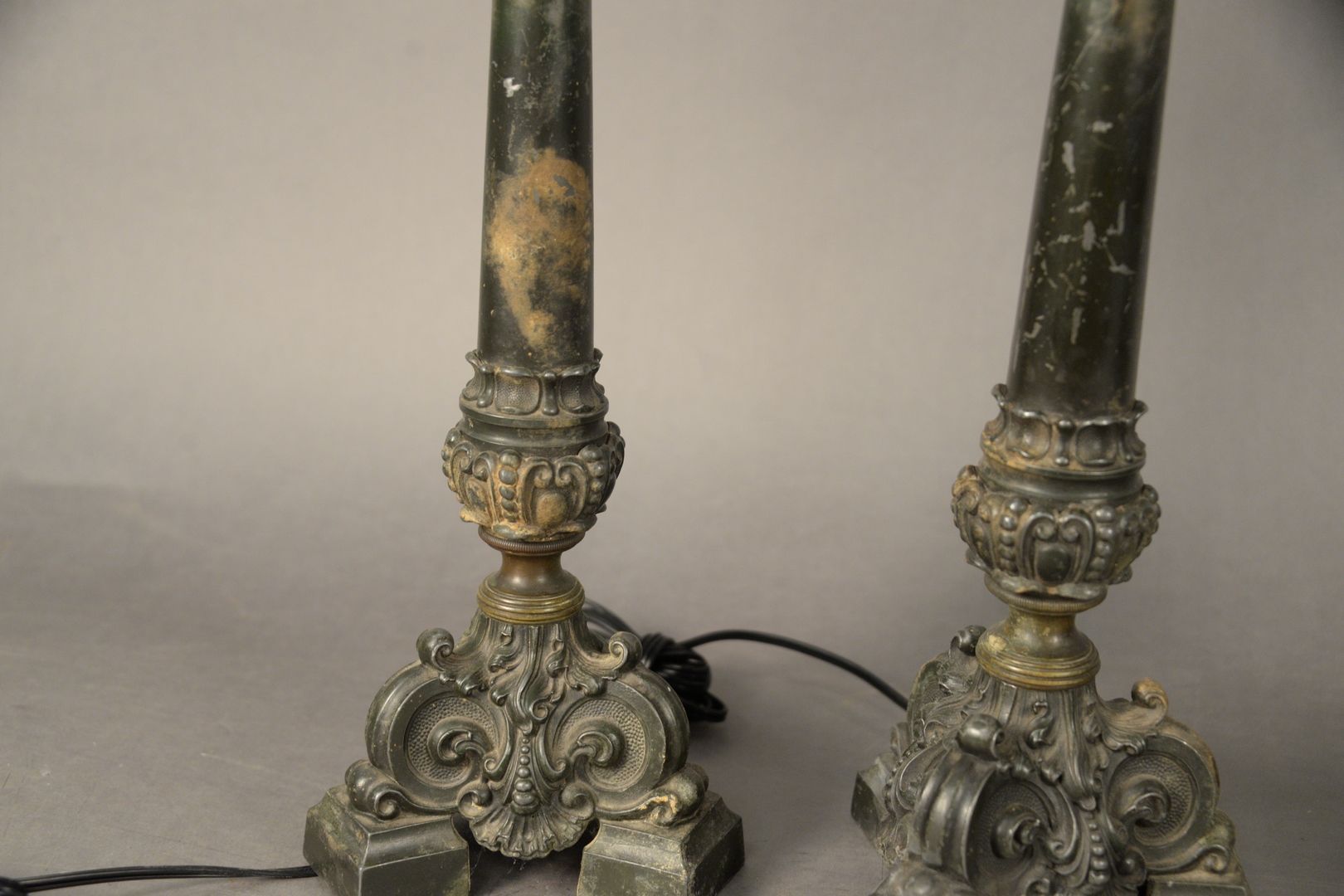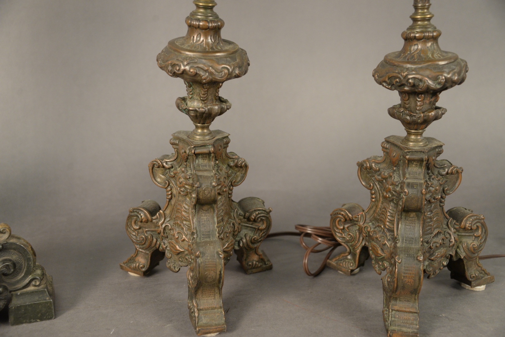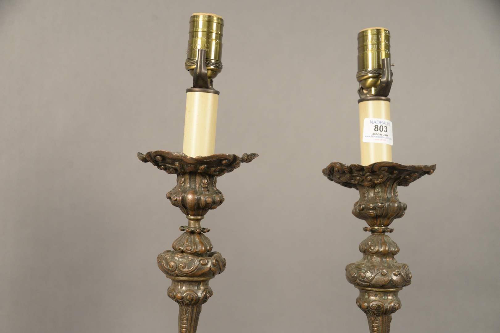 Lot 803: Two Pairs of Candlestick Lamps, embossed copper pricketts along with a pair of metal candlestick lamps, heights 25 and 23 inches.