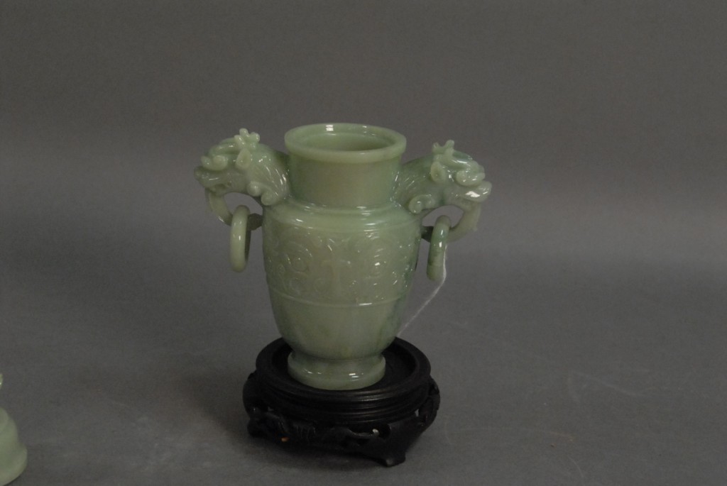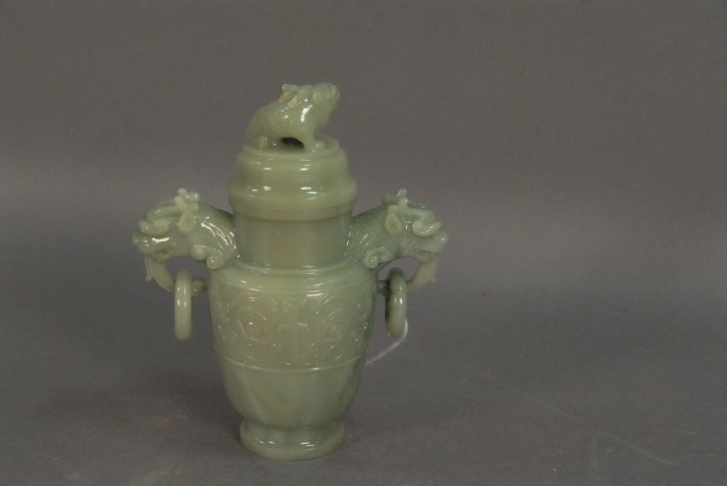 Lot 804: Three piece lot Celadon jade foo dog covered urn, in baluster form with foo dog head and ring handles, and foo dog finial on the co…