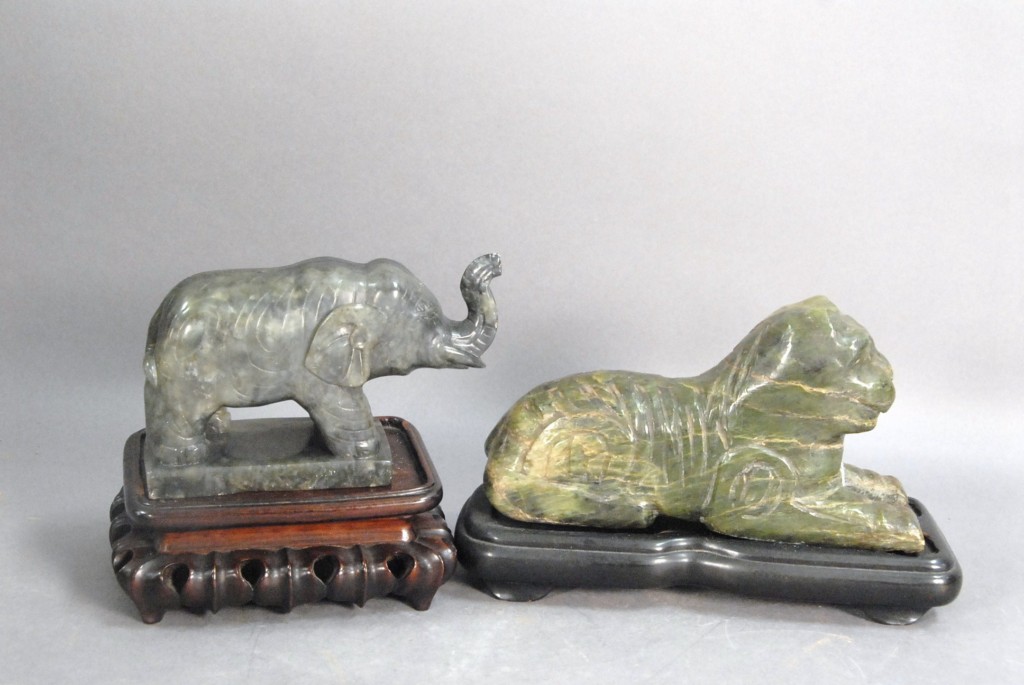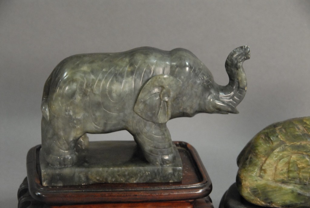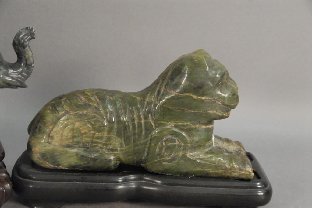 Three piece lot Celadon jade foo dog covered urn, in baluster form with foo dog head and ring handles, and foo dog finial on the cover, ht 6 and Two carved hardstone pieces to include a carved elephant and wooden base, ht of elephant 4, along with a carved laying dog, ht 4 1/2 lg. 8.