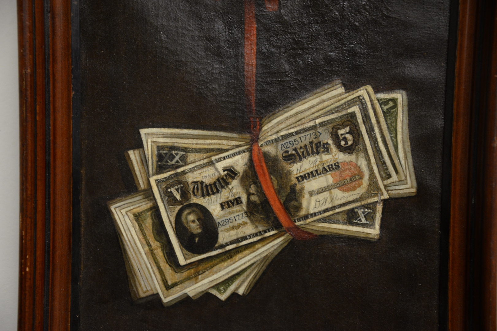 American School late 19th//early 20th century, Trompe-l’oeil of American currency, oil on canvas, unsigned, height 18 inches, width 12 inches.