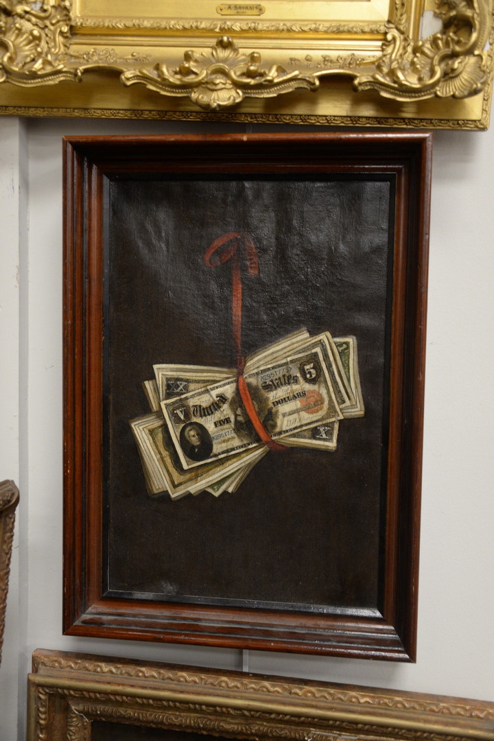 Lot 805: American School late 19th//early 20th century, Trompe-l’oeil of American currency, oil on canvas, unsigned, height 18 inches, widt…