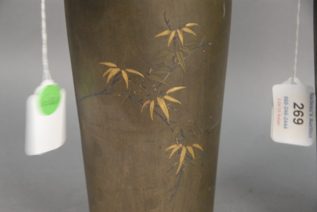 Lot 805: Pair of bronze multi-metal vases gold, silver, and copper, blossoming trees and bamboo with animal handles, 18th – 19th century, ht…