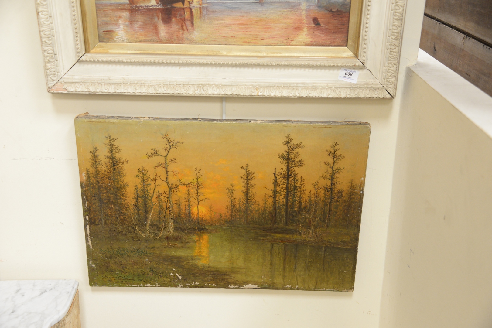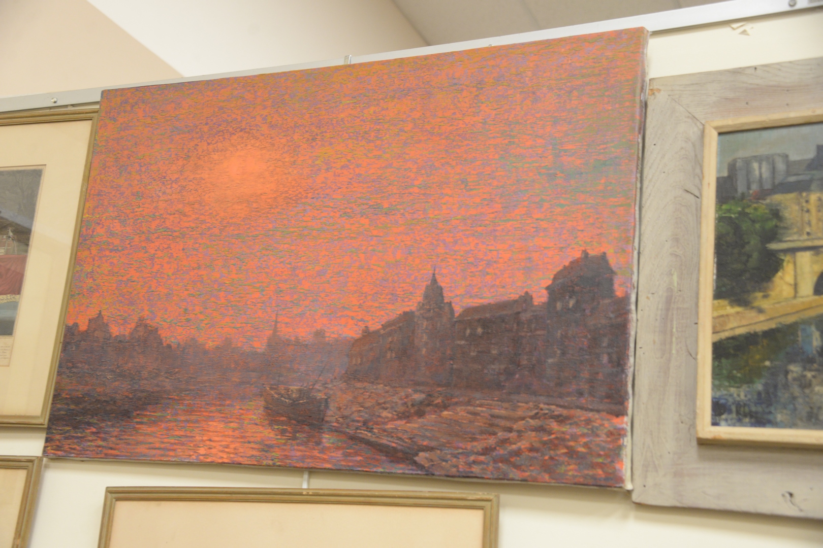 Four Piece Group, to include ships in the moonlight, oil on canvas, unsigned a european canal scene, oil on board, signed Klee lower left marshside sunset, oil on canvas, signed indistinctly lower right along with a sunset scene on the water, oil on canvas, unsigned, 24 x 36.