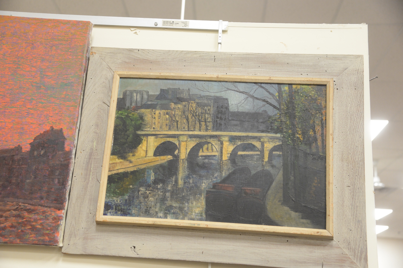 Lot 808: Four Piece Group, to include ships in the moonlight, oil on canvas, unsigned a european canal scene, oil on board, signed Klee lo…