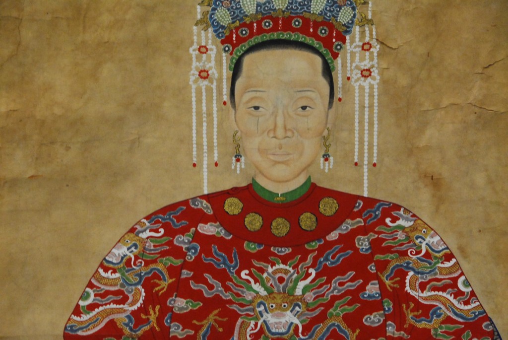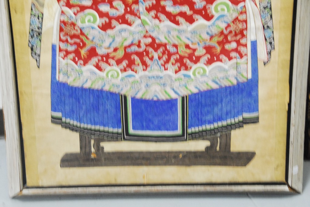 Framed watercolor on paper of guanyin figure wearing four claw dragon robe.
