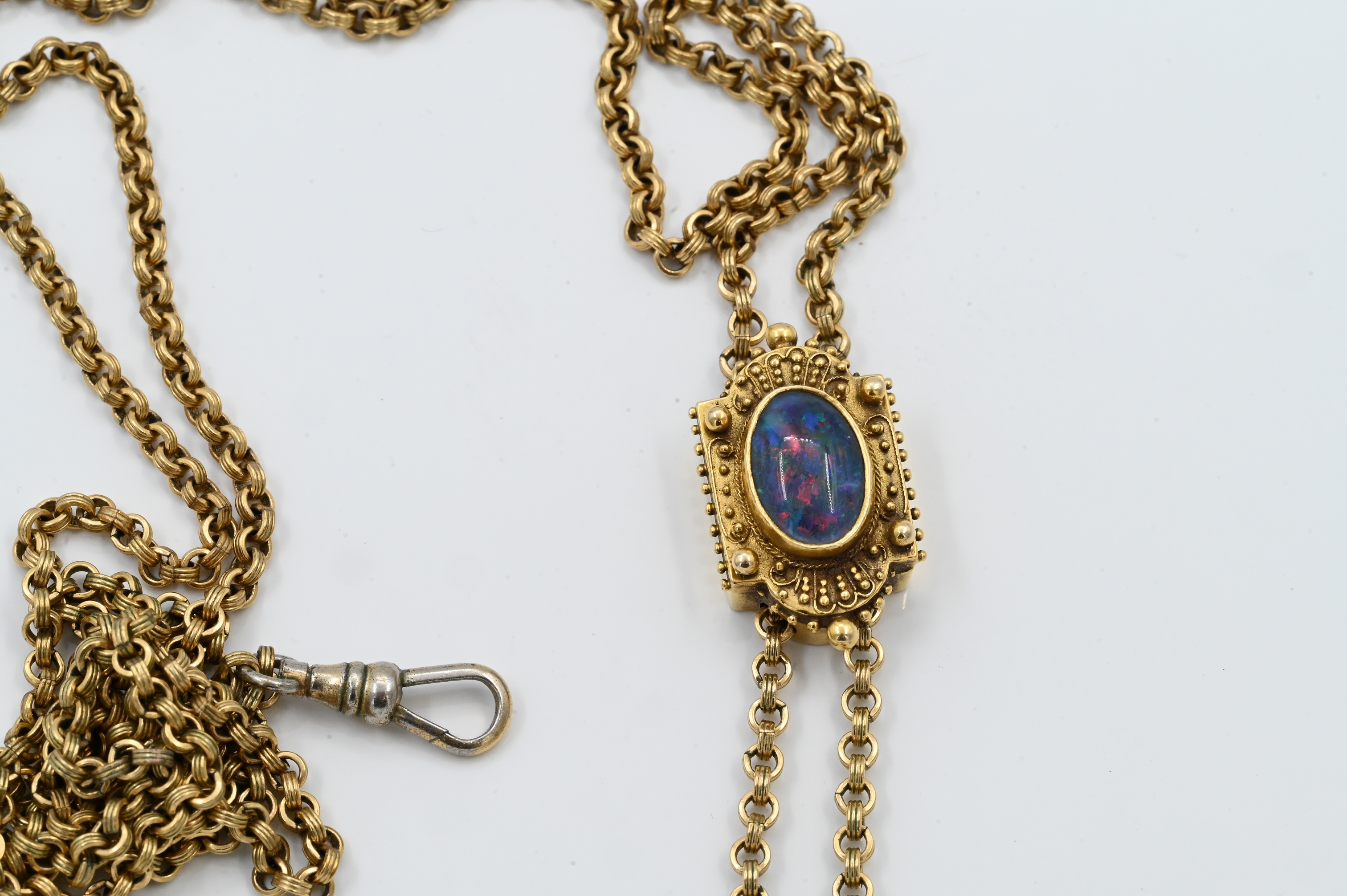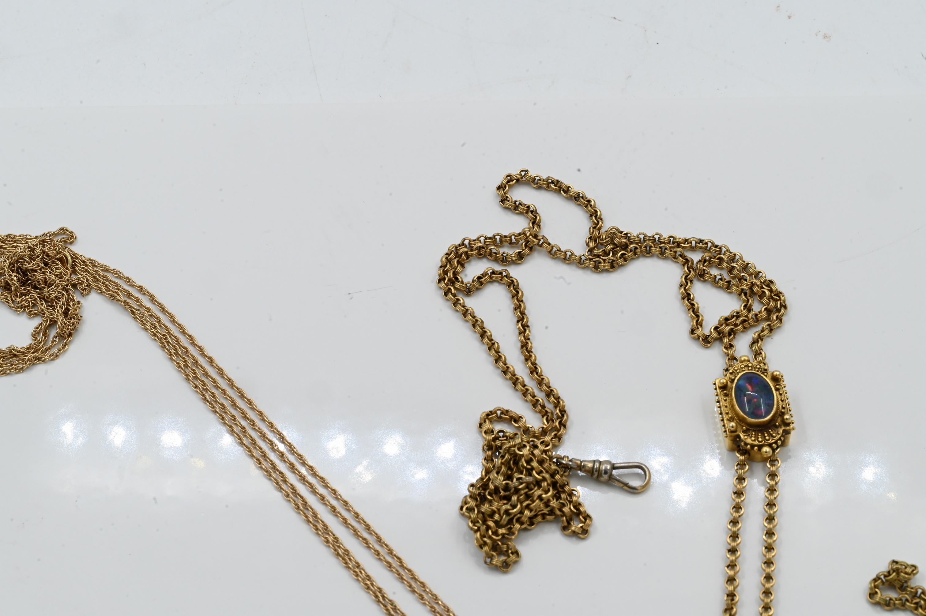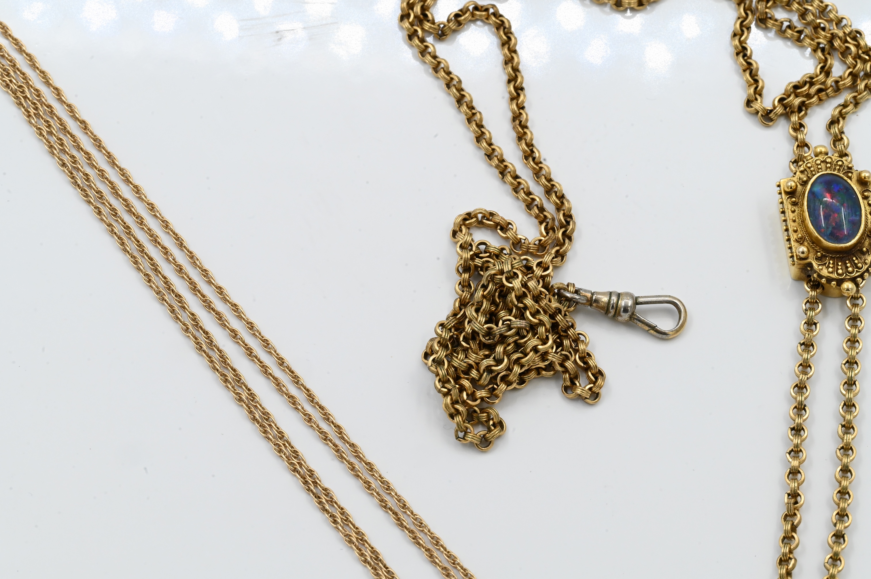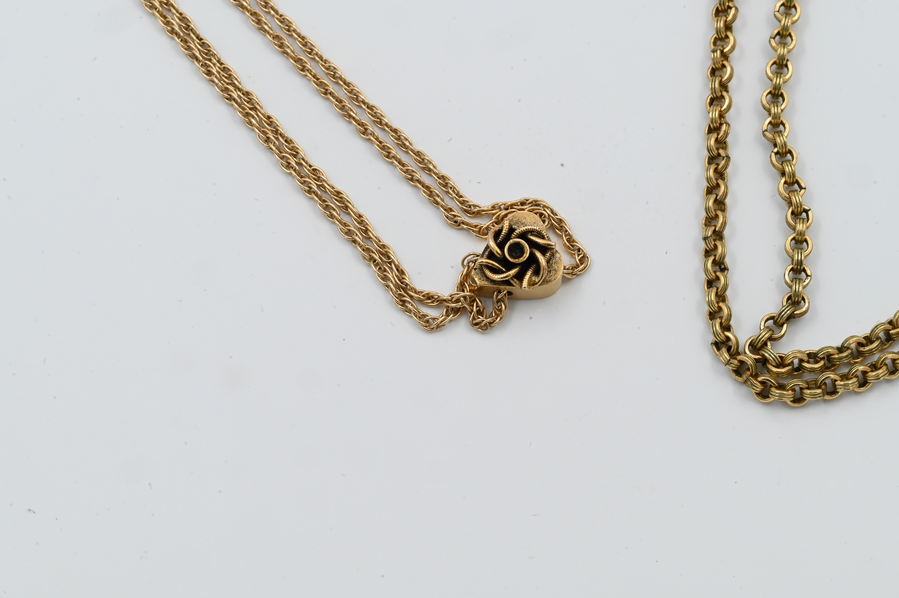 one having heart shaped slide with rose, the other with black opal (chain is gold filled, only the slide is 14K gold), length 36 1/2 inches, 18.9 weighable t.oz.