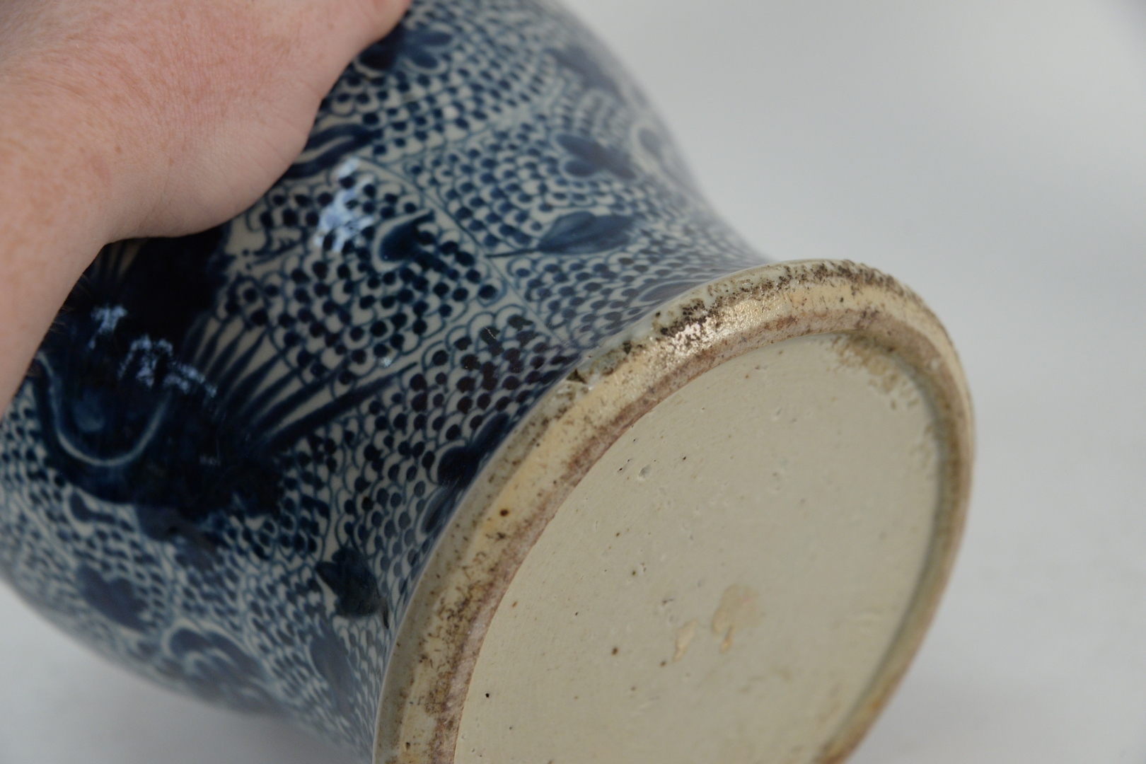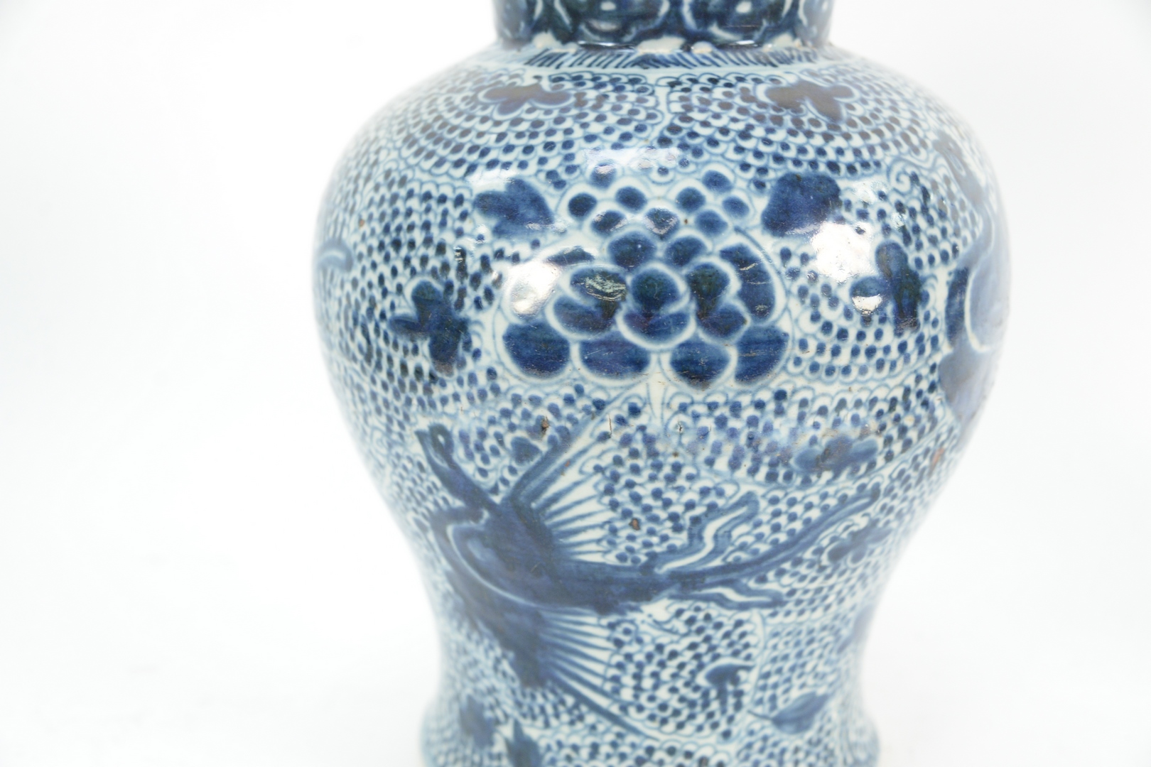 Lot 81: Chinese Blue and White Vase with flying phoenix birds, probably 19th century or earlier, height 13 inches. Provenance: From a Newport, Rhode Island historic home, in the same family since 1761.