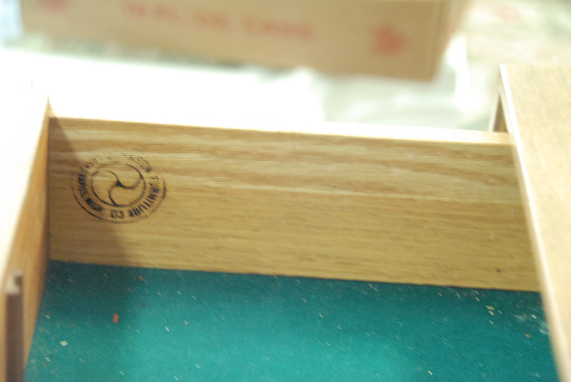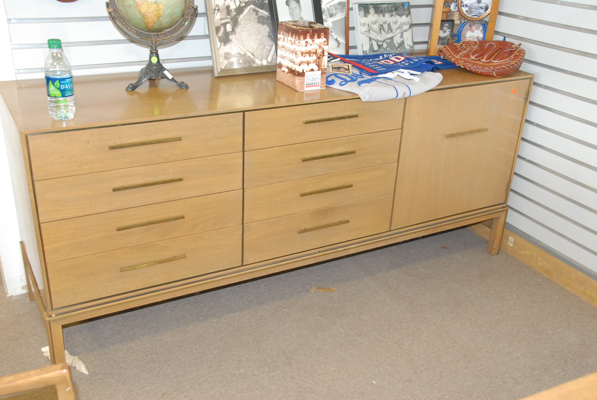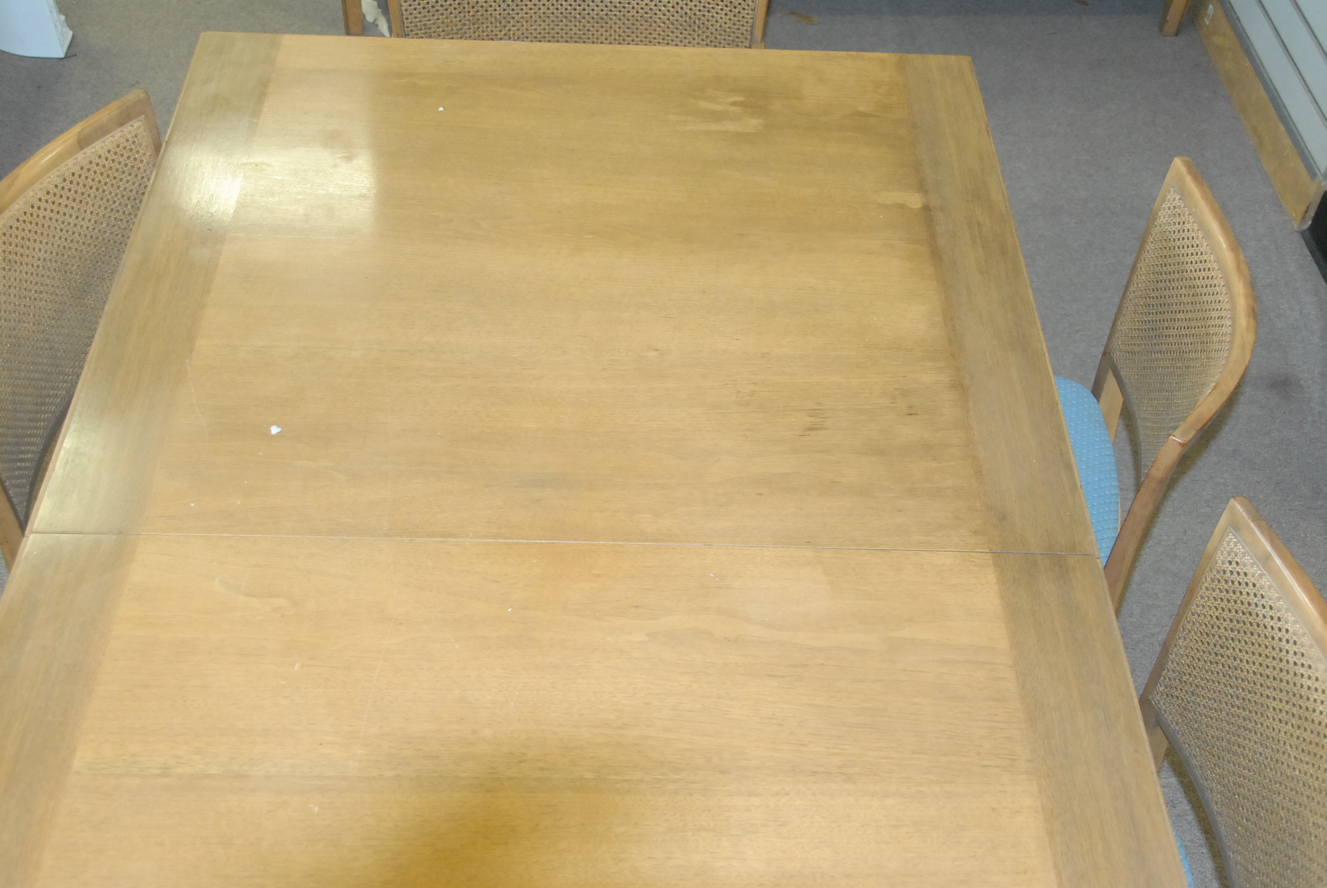 Eight piece dining set mid century Johnson Furniture Company, Grand Rapids to include a credenza, table, and six chairs, no leaves.