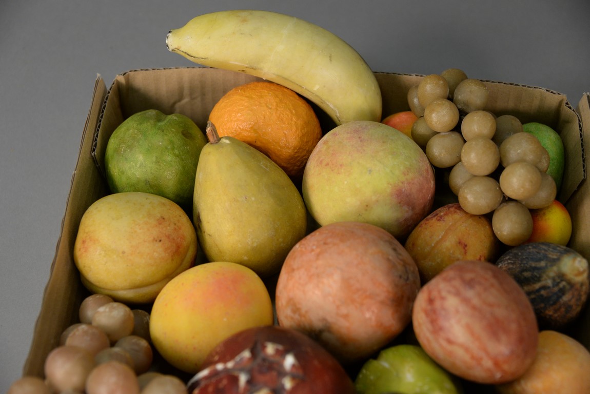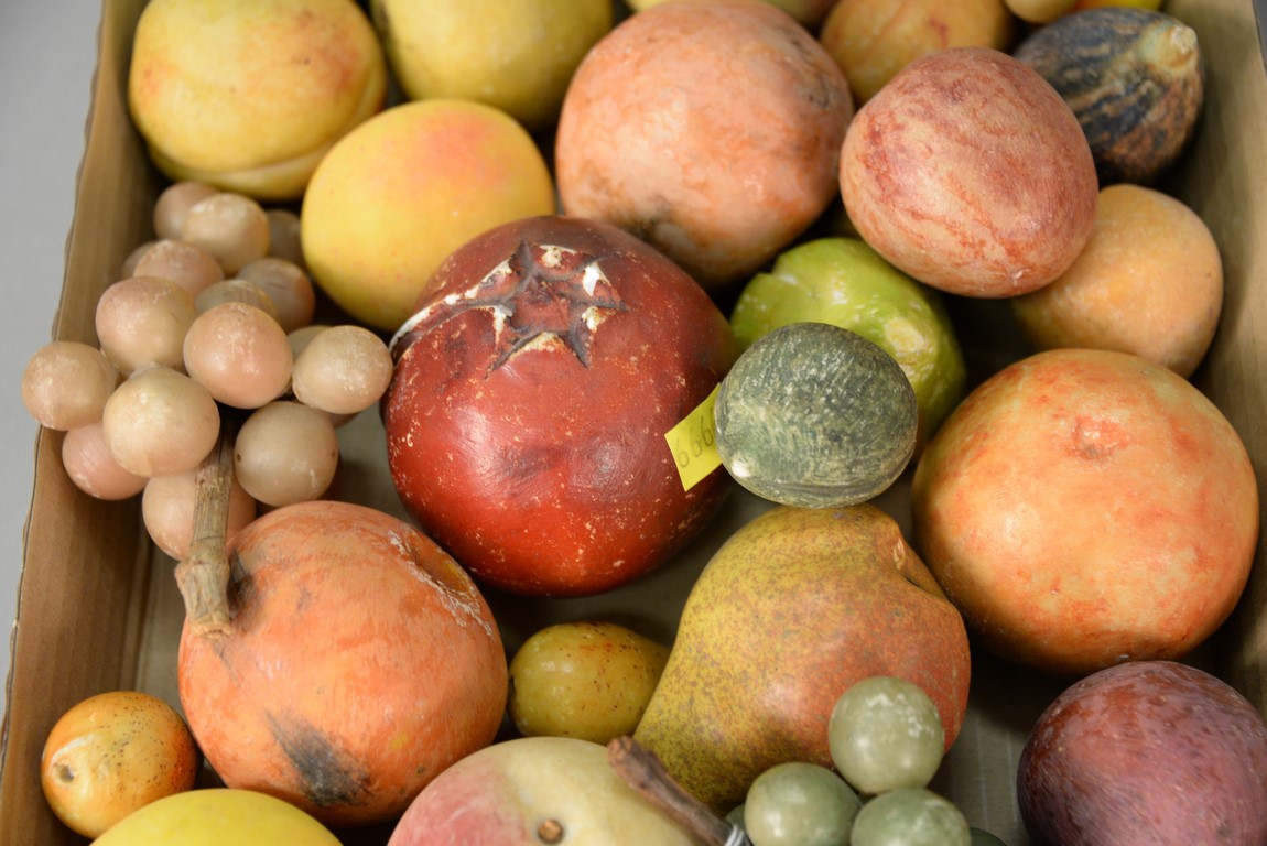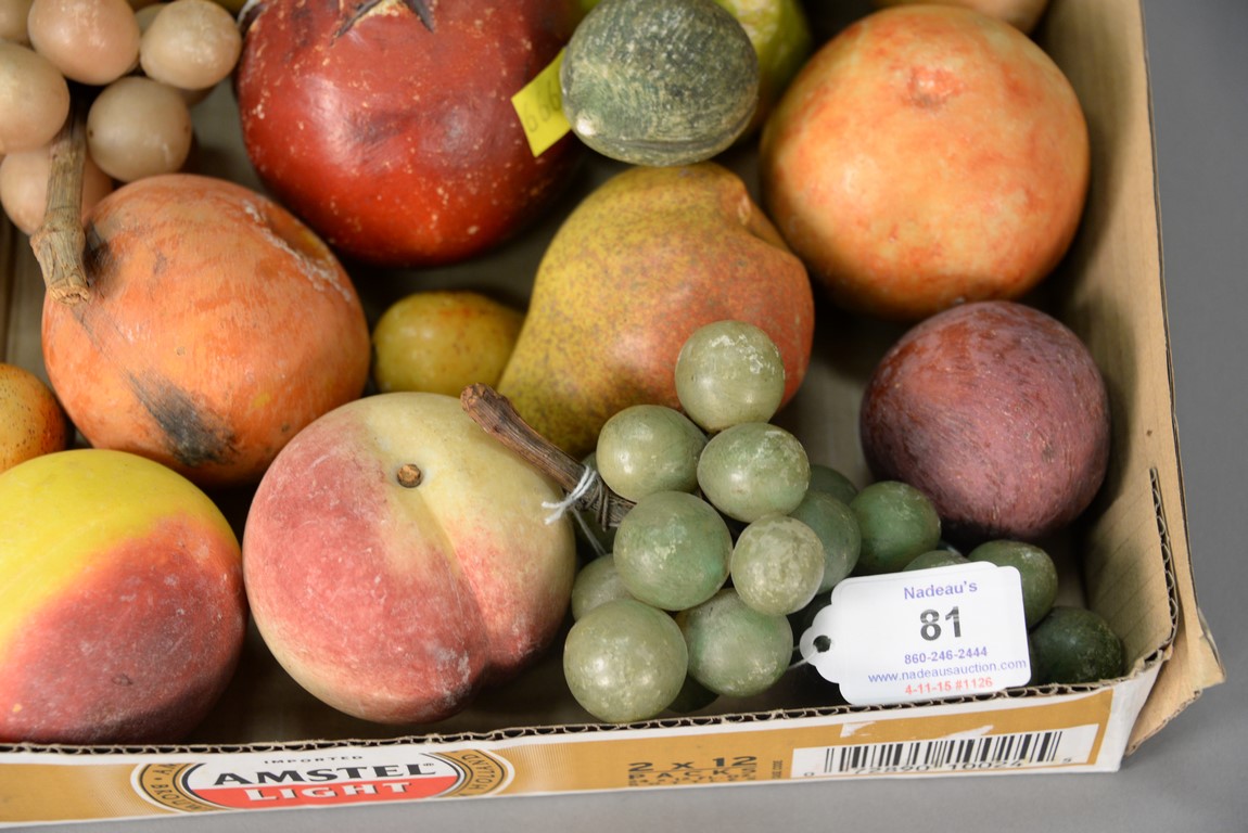 Group lot of alabaster fruit, 29 pieces total. 4 1/2 in. to 16 in.