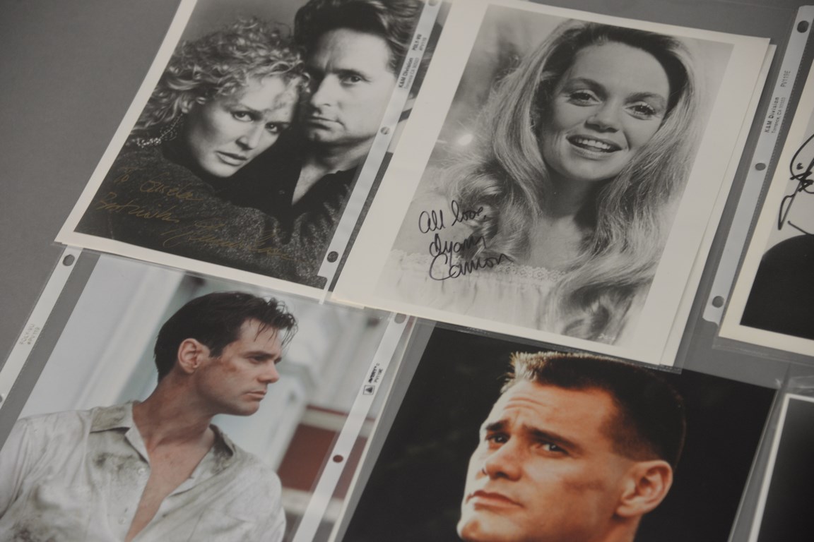 Group of 19 photographs, 13 are autographed including 2 Dyan Cannon, 3 Glenn Close, 1 Antonio Banderas, 7 Jim Carey 1 with COA, and 6 unsigned photographs including 5 Jim Carey and 1 Antonio Banderas.