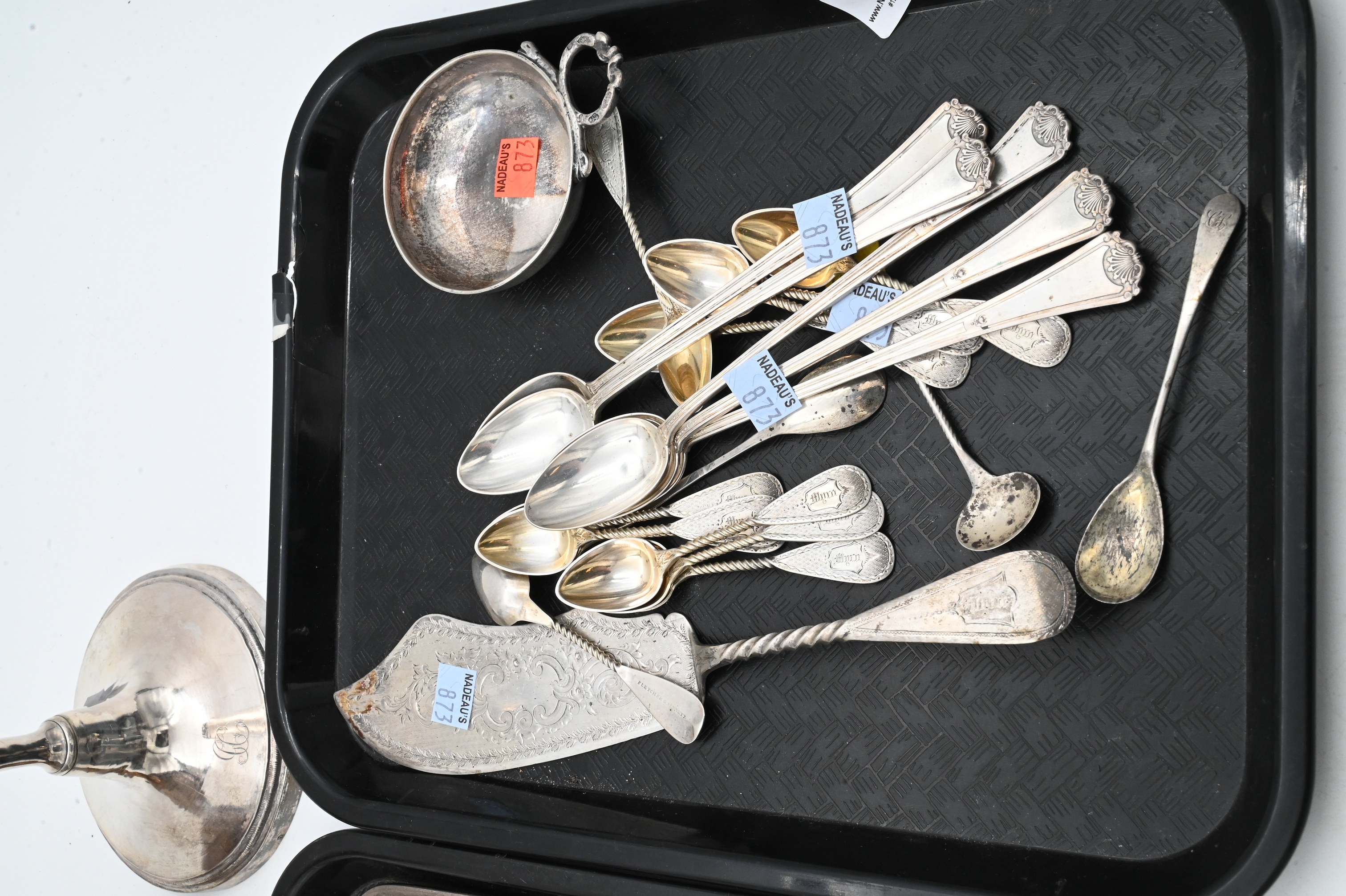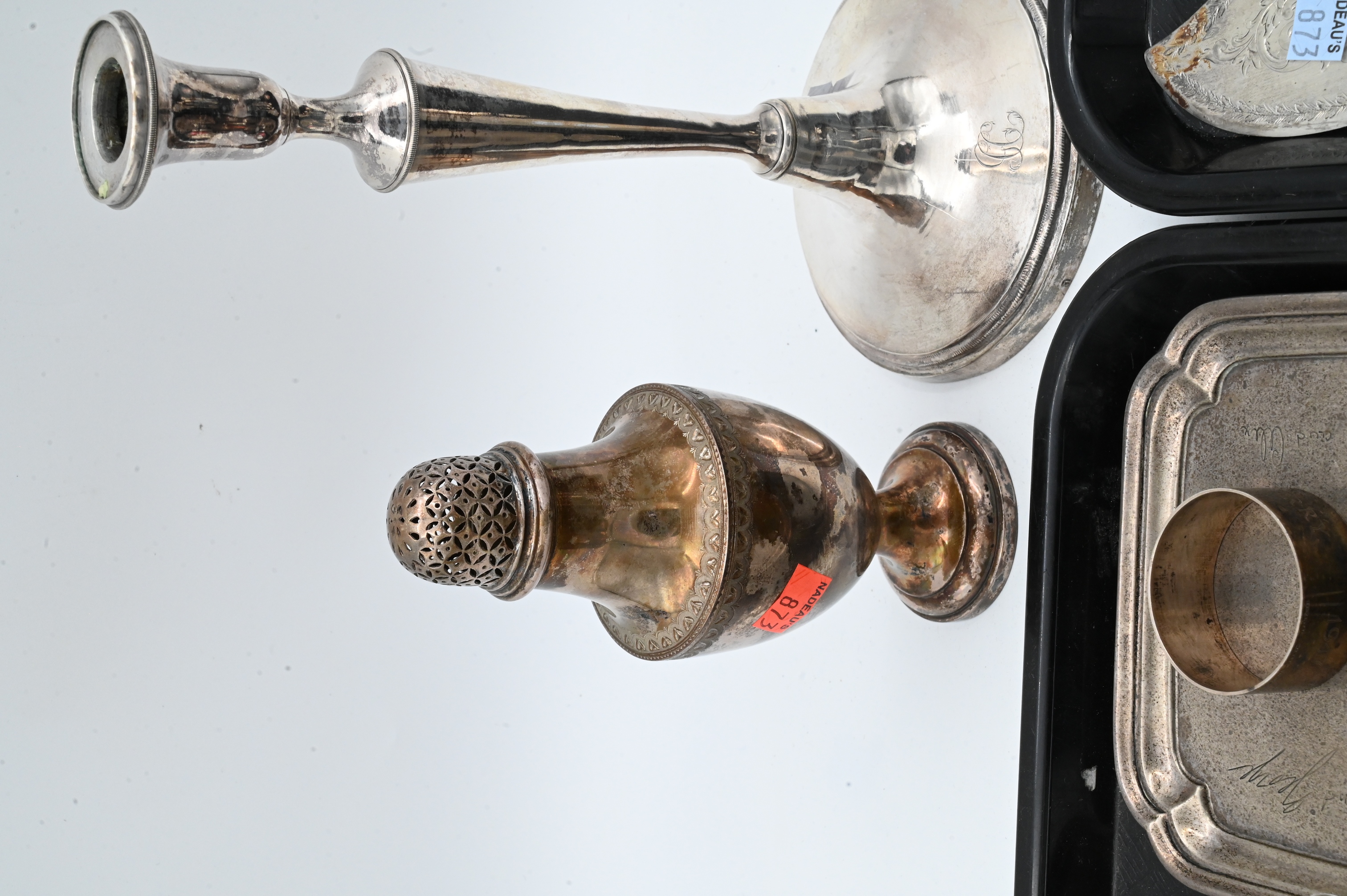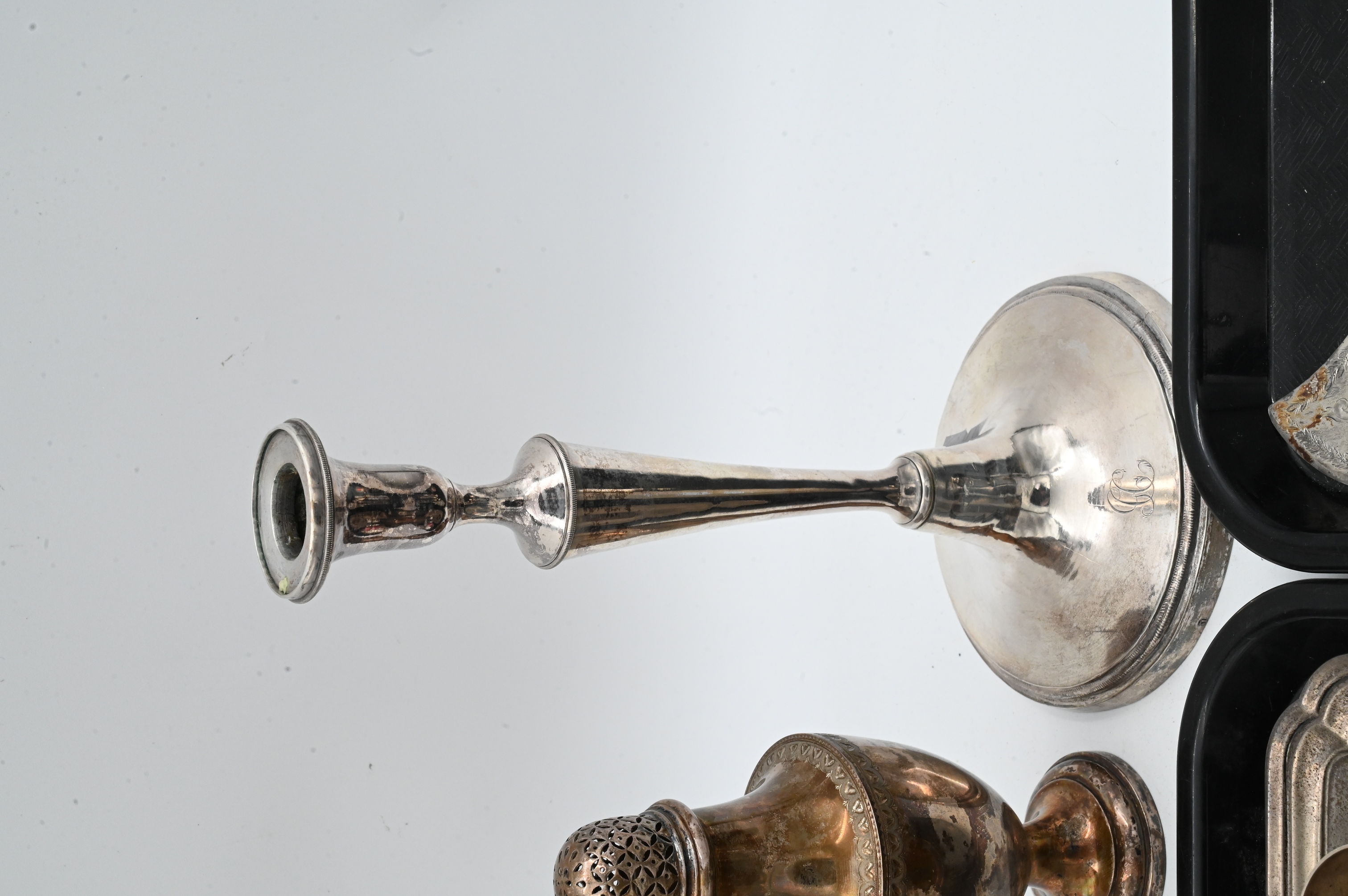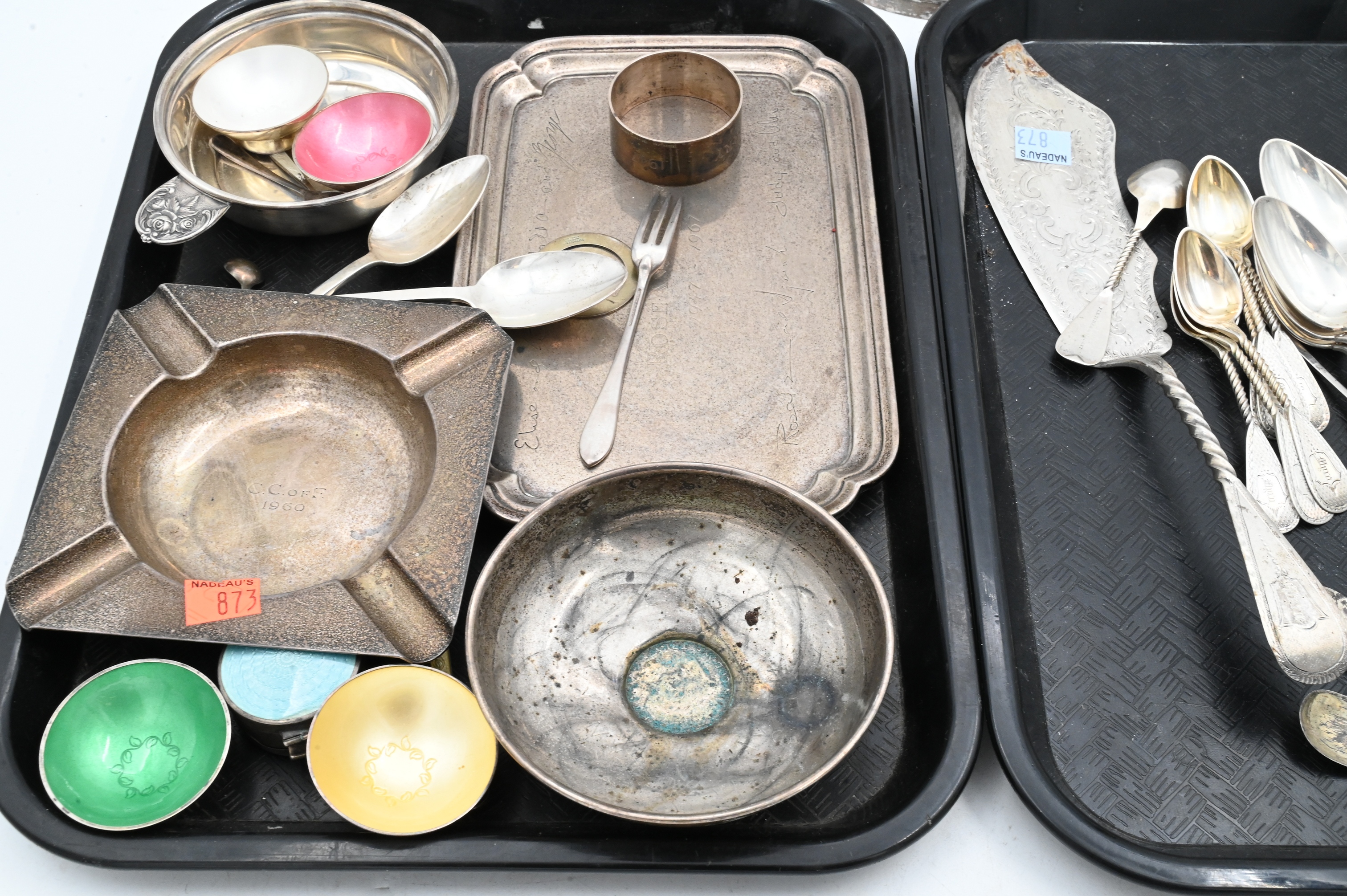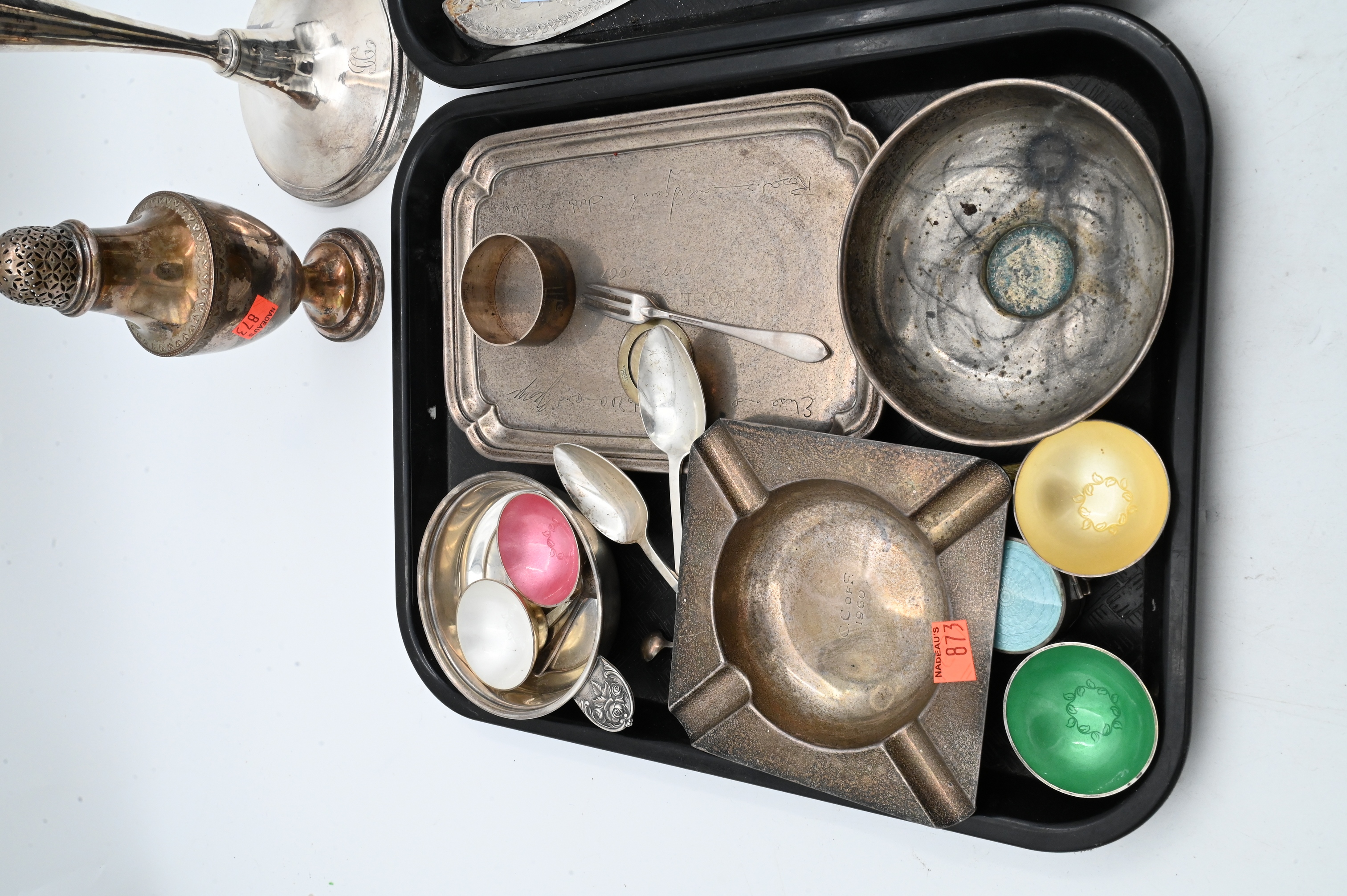 to include Tiffany ashtray, two spoons, one cocktail fork, napkin ring, and clip, Cartier bowl with Franklin half dollar, along with four enameled salts, and three spoons, S. Kirk and Sons, porenger ENSAU tray, enamel box, and Stuben salt spoon longest 8 1/2 inches, along with set of 12 coin silver dinner spoons by Fletcher and Bennett, two coin silver pieces by William Kendrick, five continental ice tea spoons, single candlestick, one caster, and one pair of small spoons